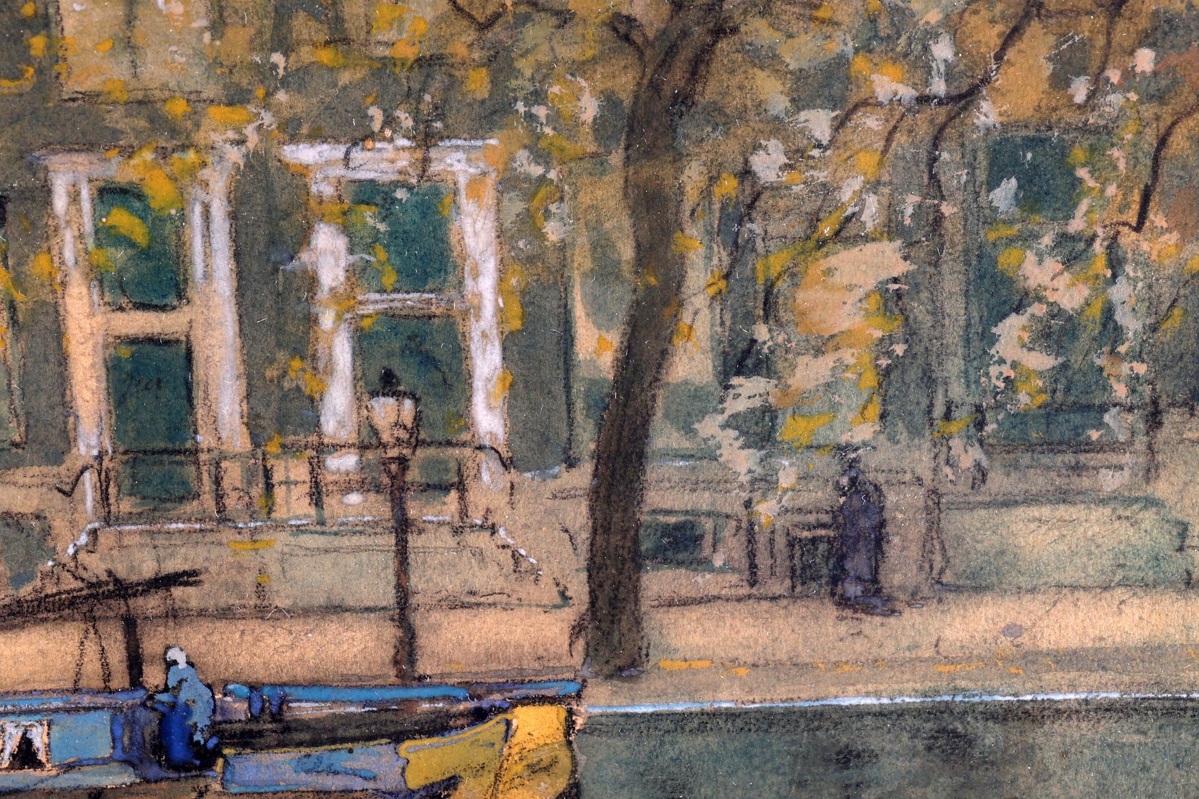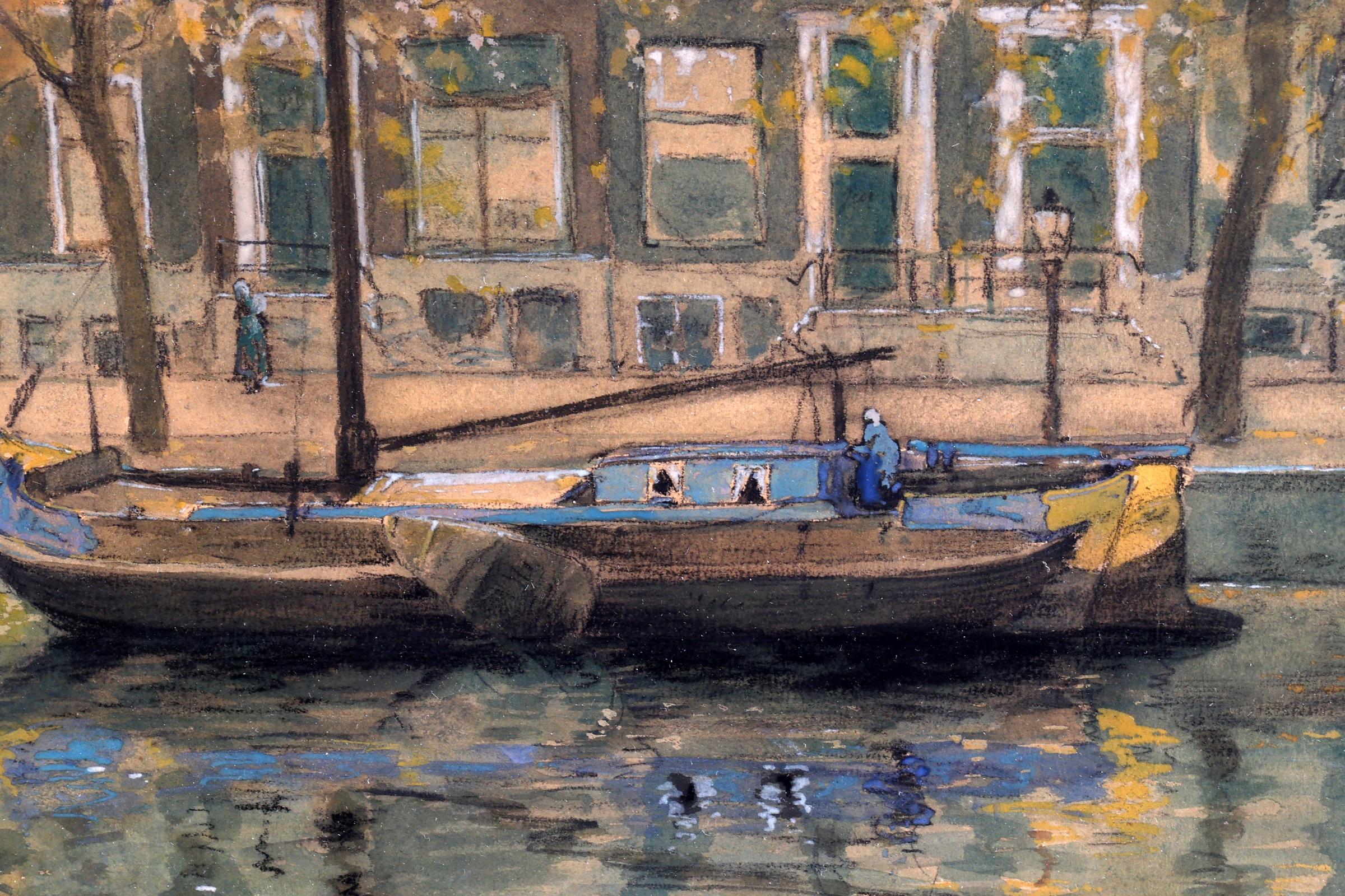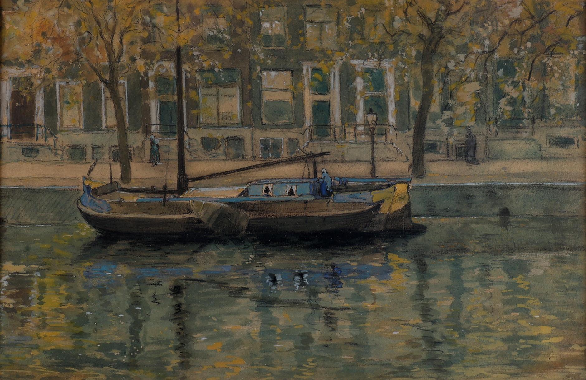 Onb.meester, Afgemeerde boot aan de gracht, aquarel,38 x 25 cm.