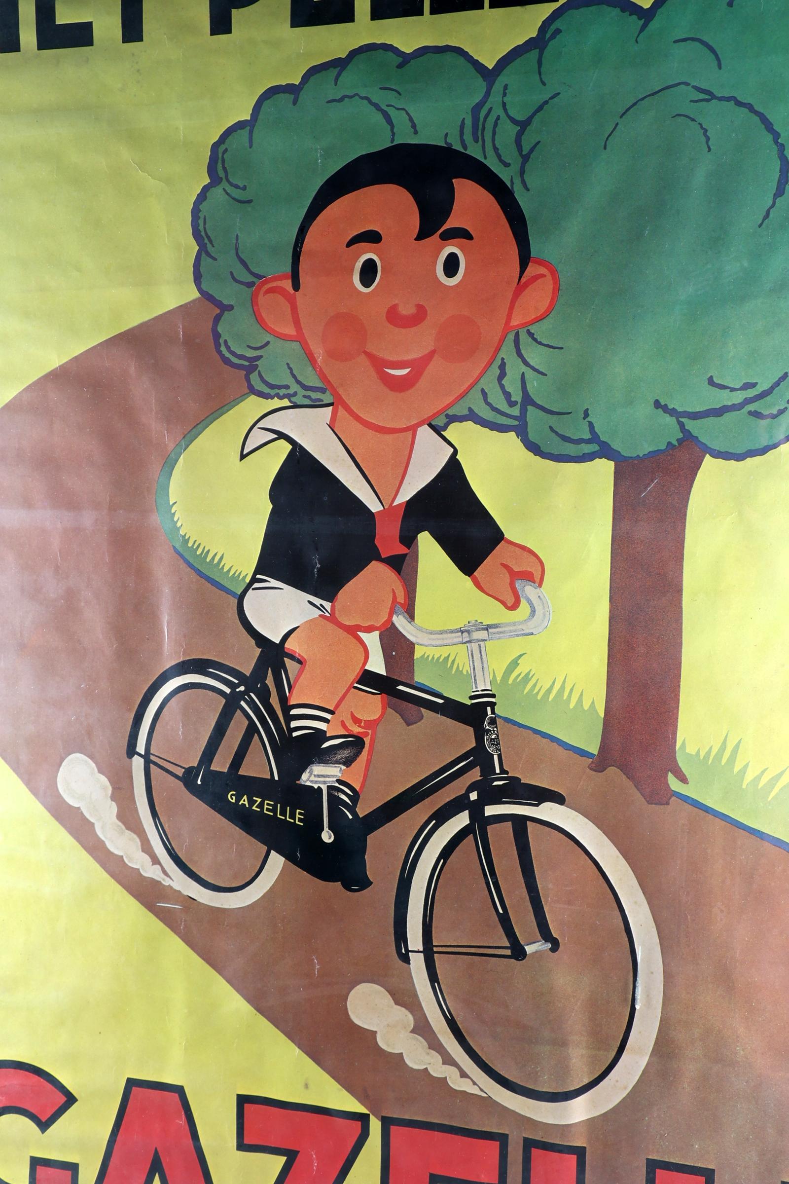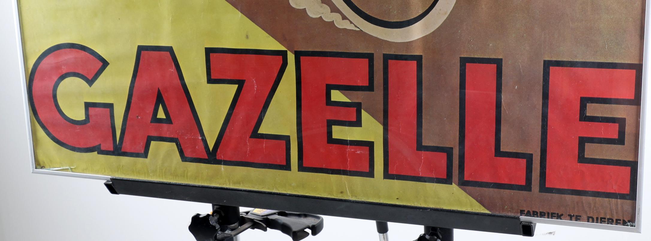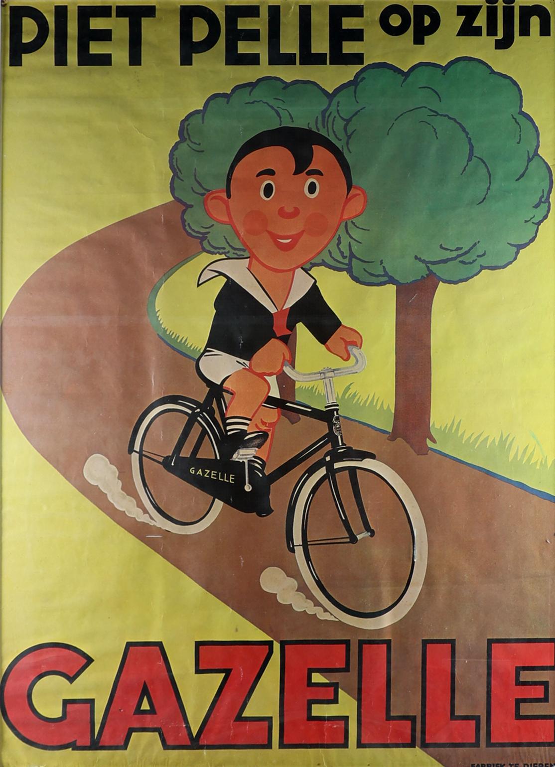 Ingelijste reclame affiche gazelle met Piet Pelle op zijn gazelle, 119 x 86 cm.