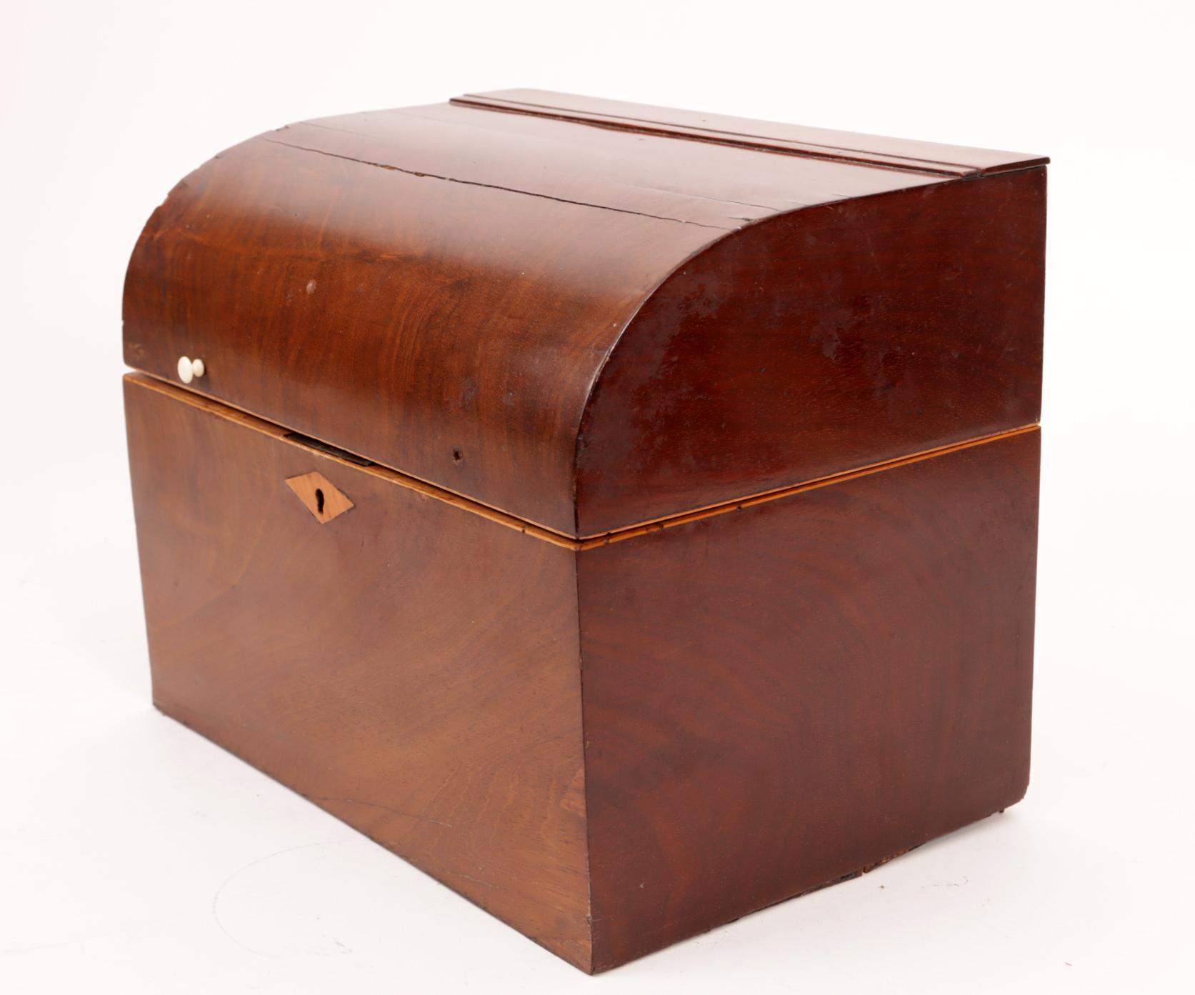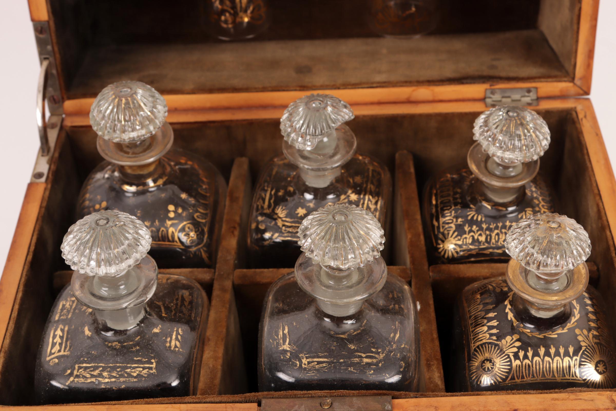 Antieke mahoniehouten Empire likeurkelder met inhoud van 6 originele karaffen en 2 glaasjes (slotje defect)