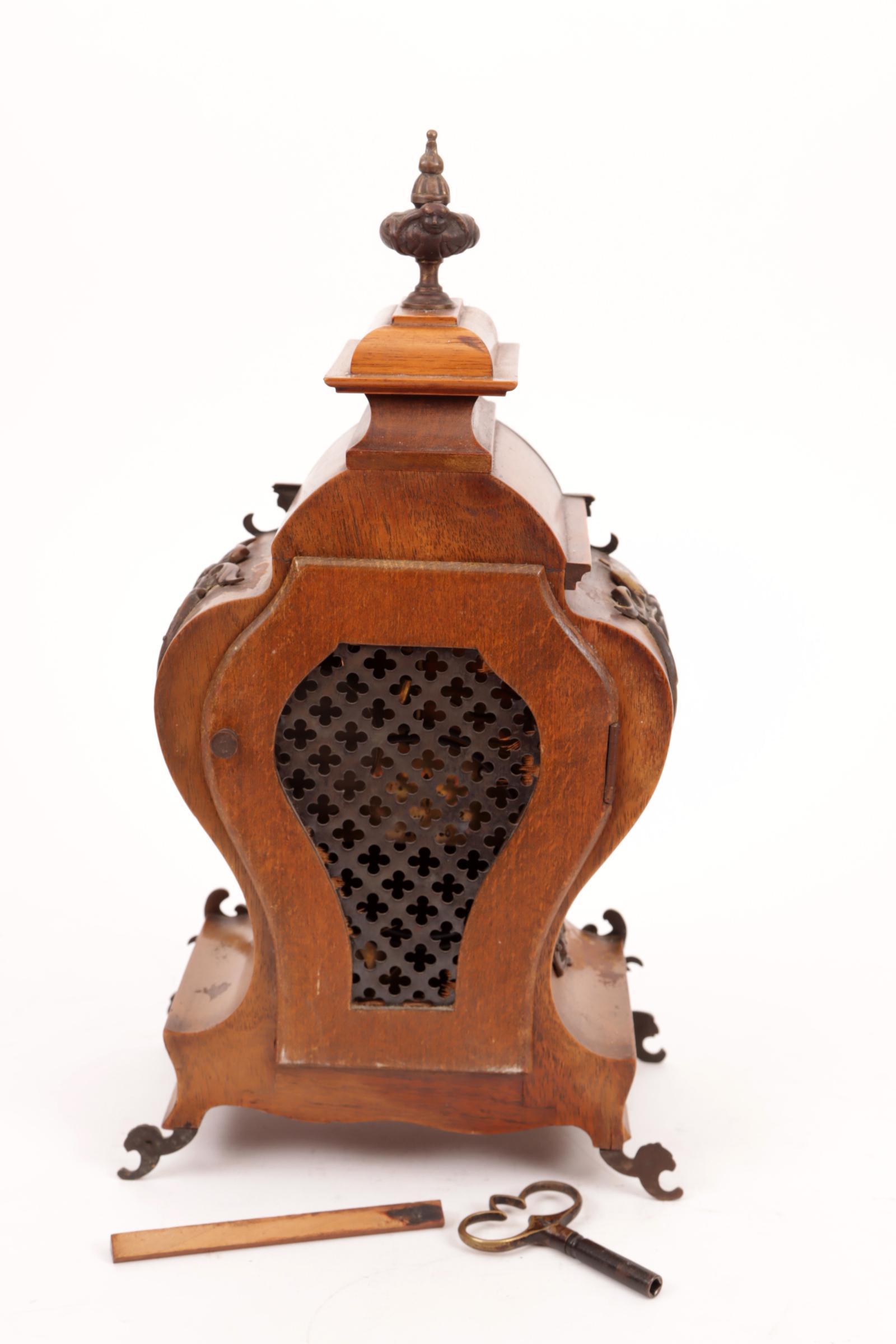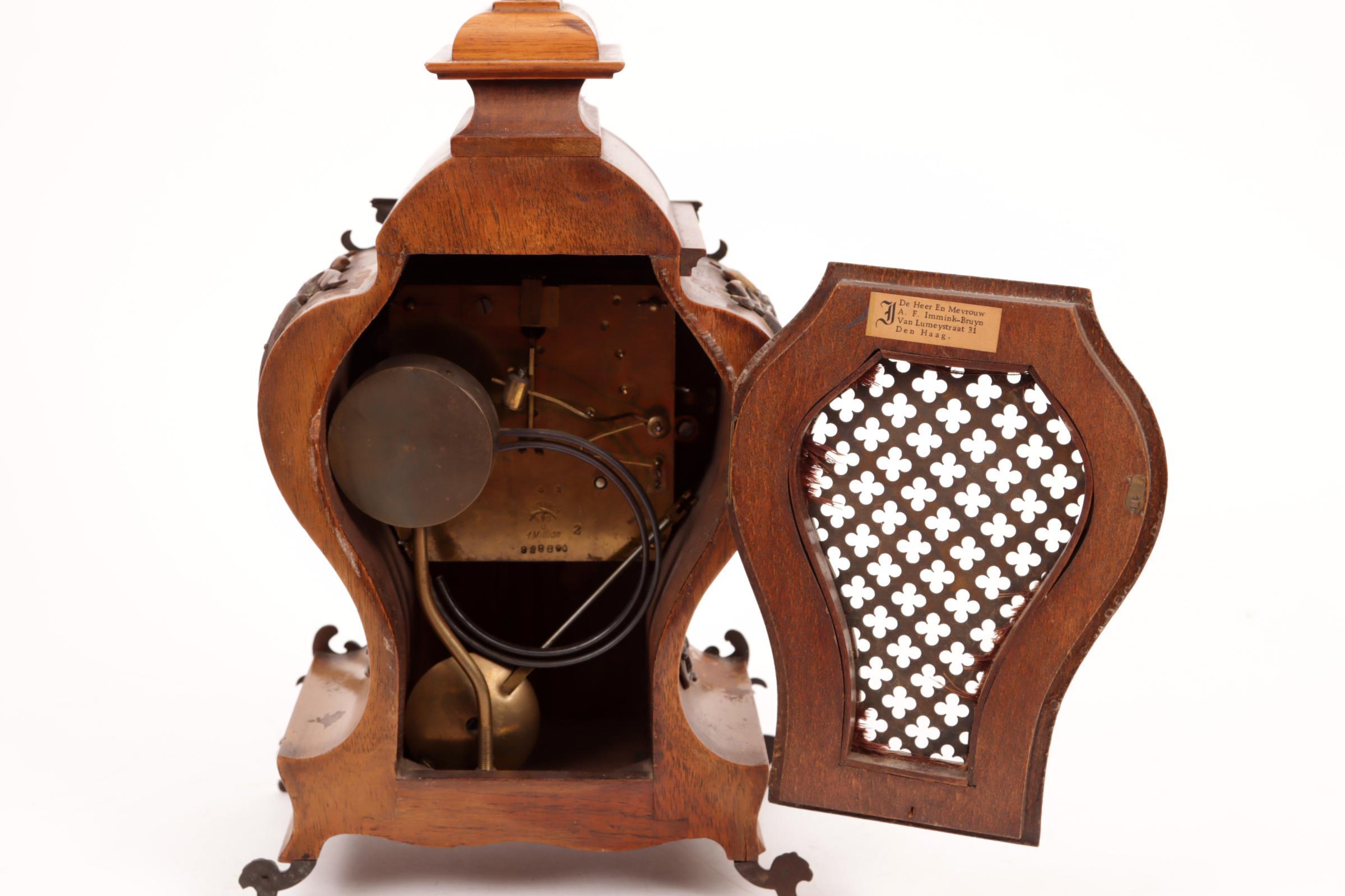 Antieke rijkbewerkte notenhouten tafelklok, h.30 cm.
