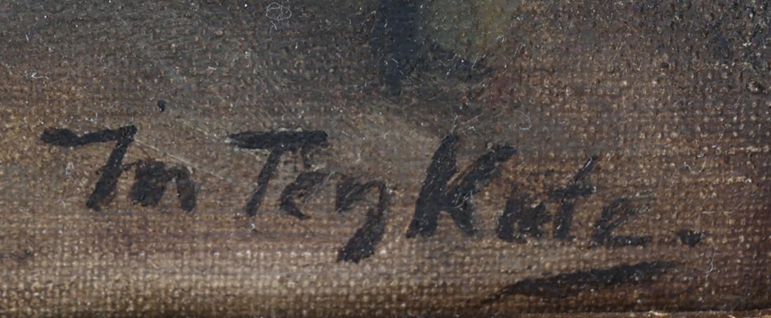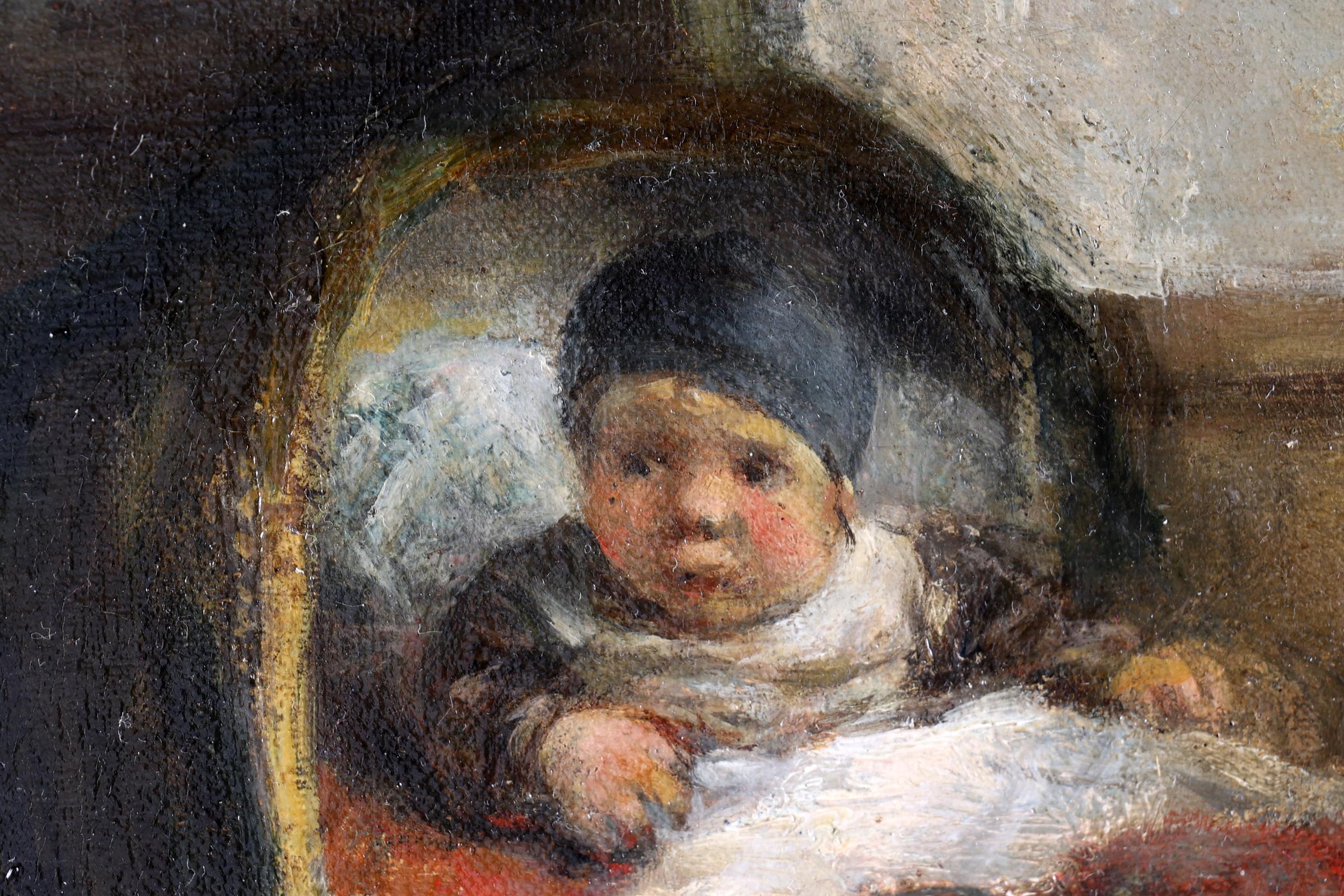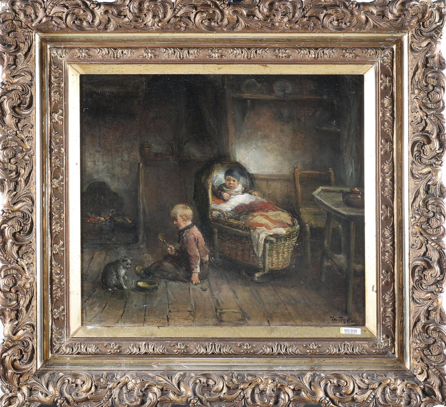 Johan Mari Henri ten Kate (1831-1910), Interieur met kat en baby in wieg, olieverf op doek, 43 x 47 cm.