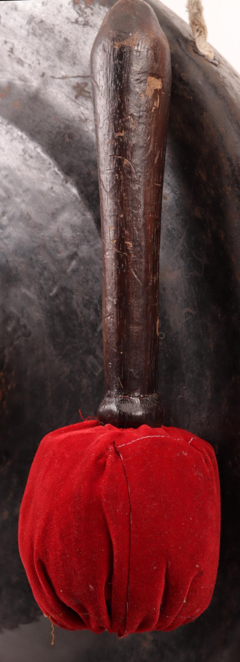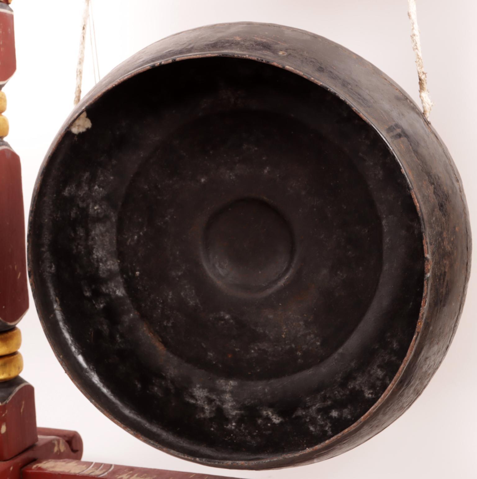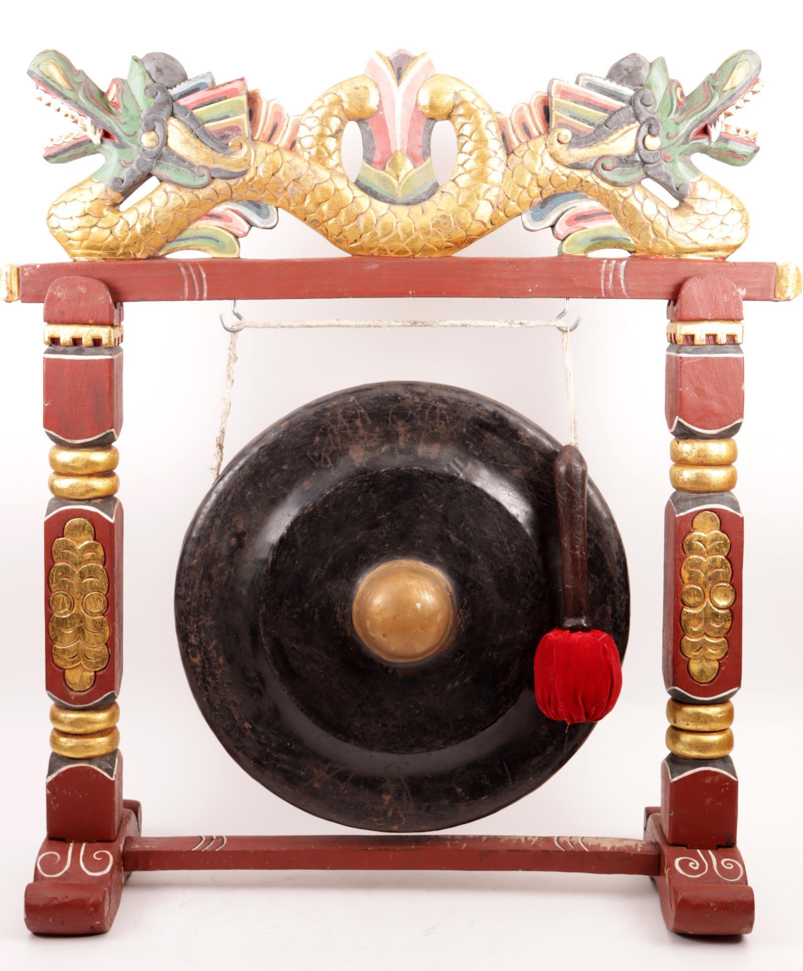 Gong aan houten frame met decor van gepolychromeerde draken, h.84 x b.78 cm.