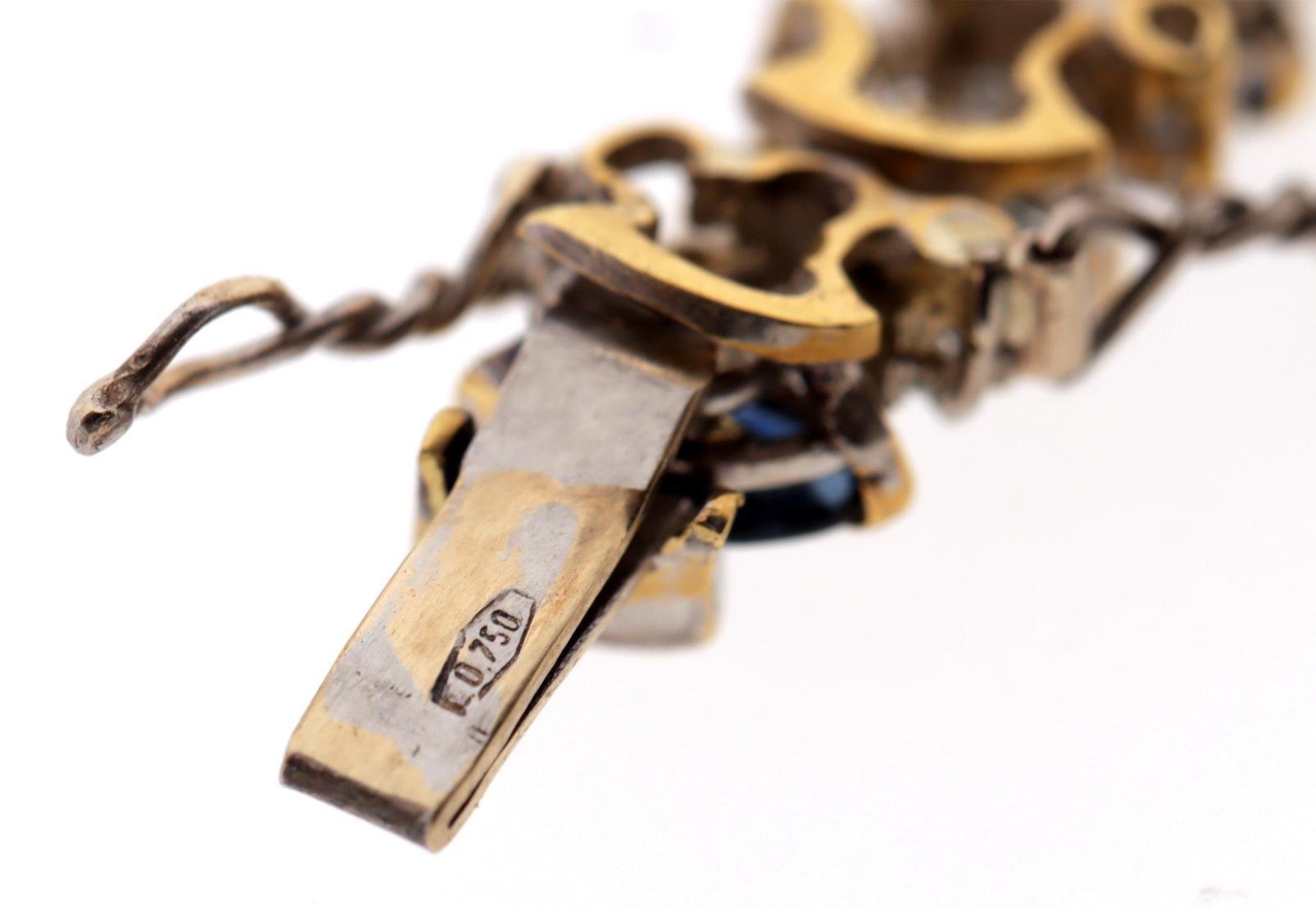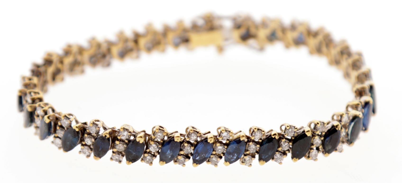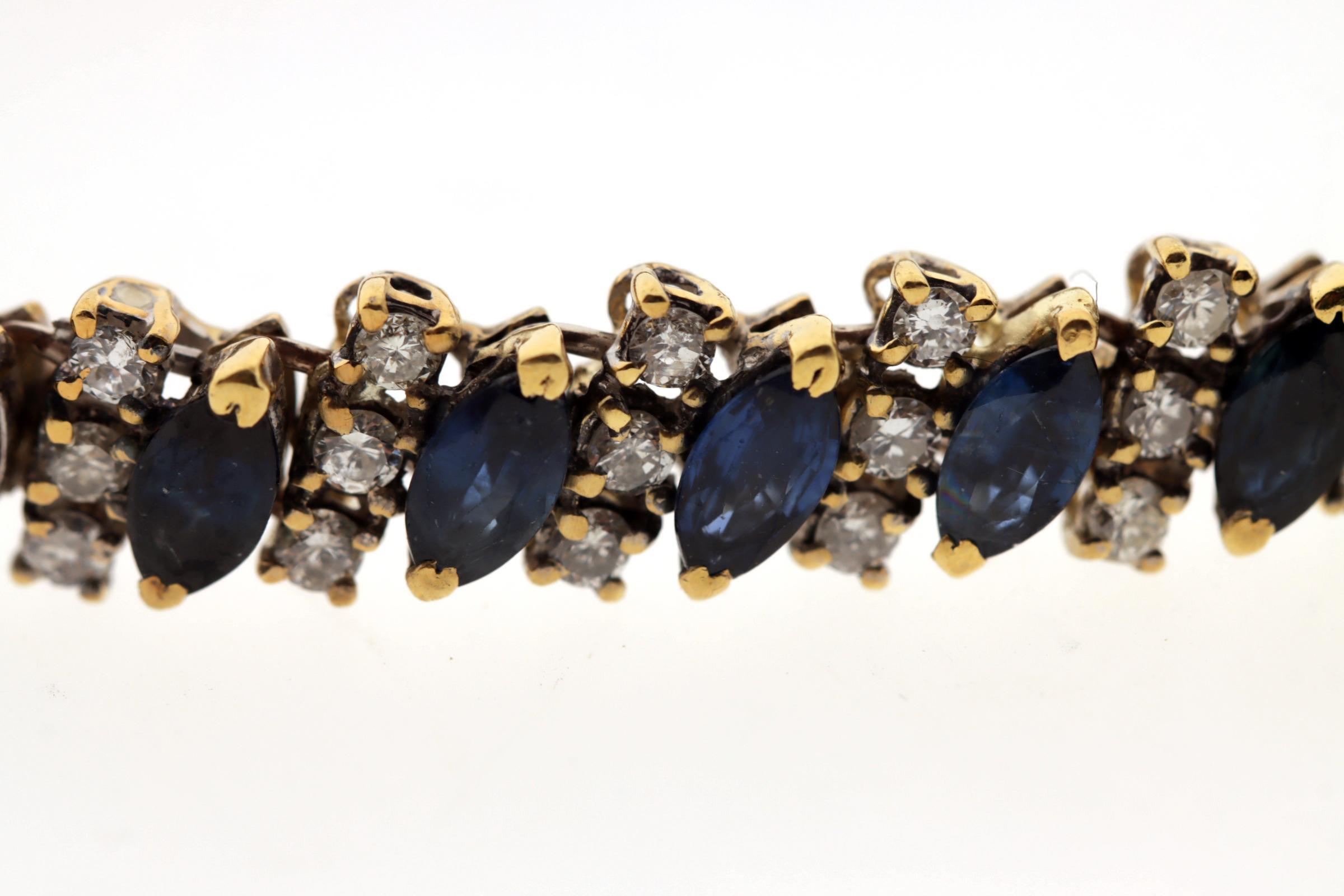 18 Kt. geelgouden armband bezet met 30 puntvormig geslepen saffier en 90 briljant geslepen diamanten, L.19 cm. totaalgewicht 21,45 gram