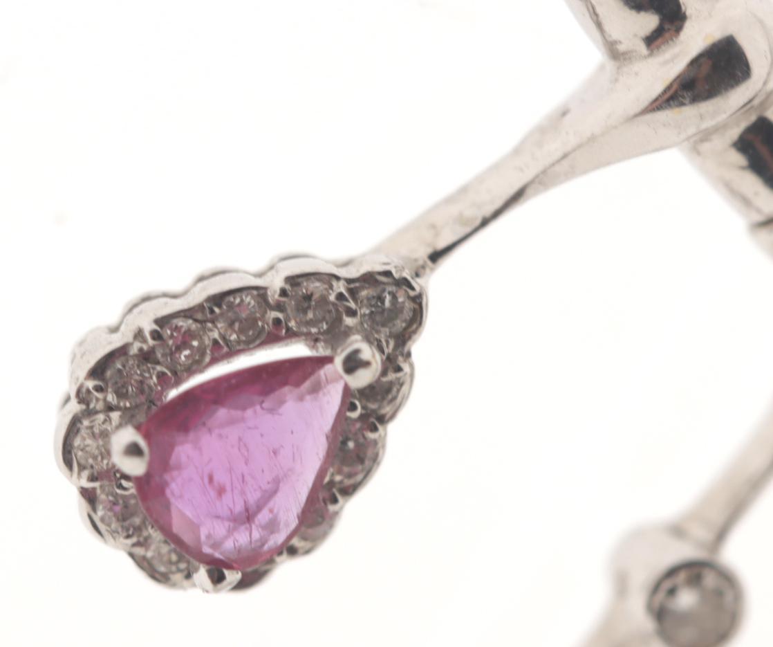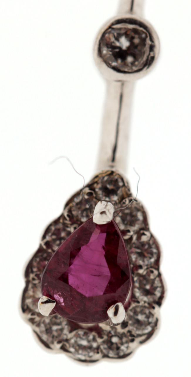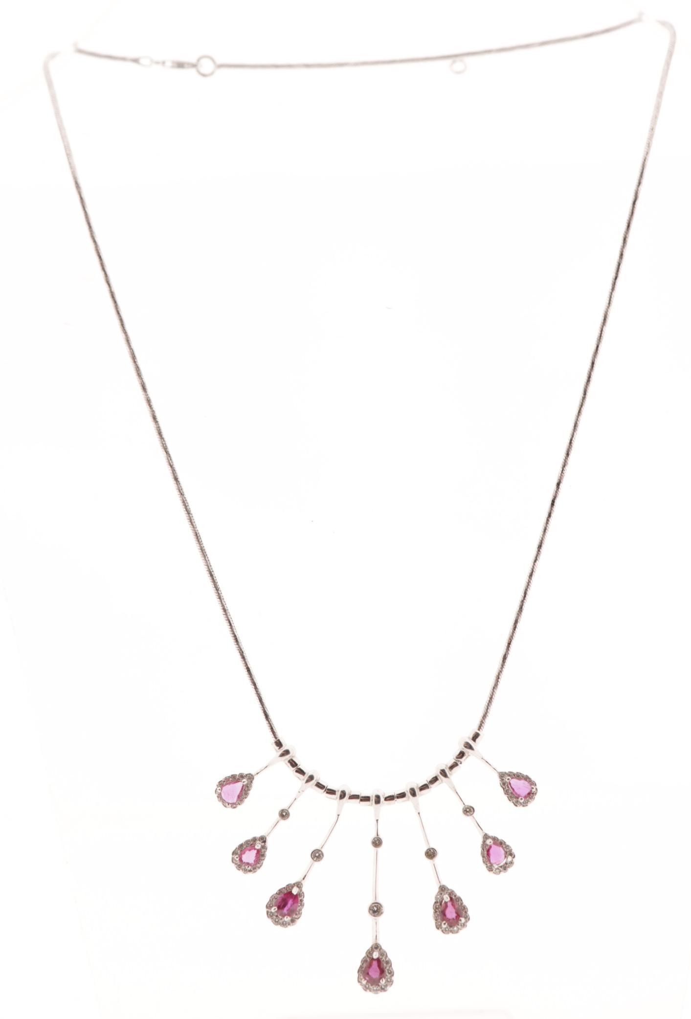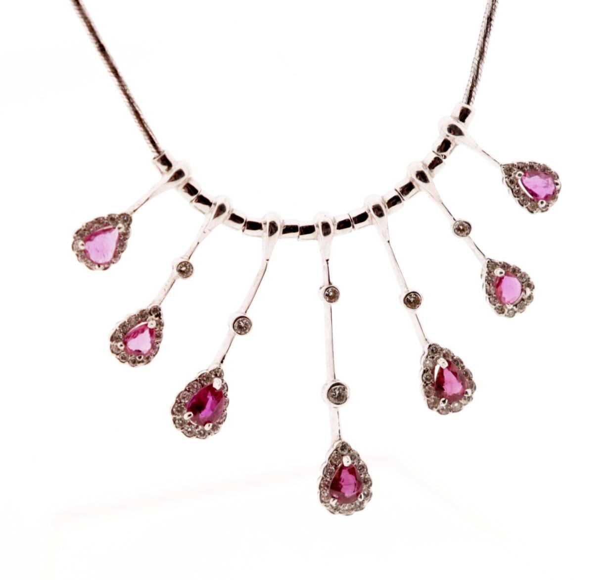 18 Kt. witgouden collier met 7 hangers elk bezet met briljant geslepen diamant en gefacetteerde 3-hoekig robijntje, totaal 16,21 gram,