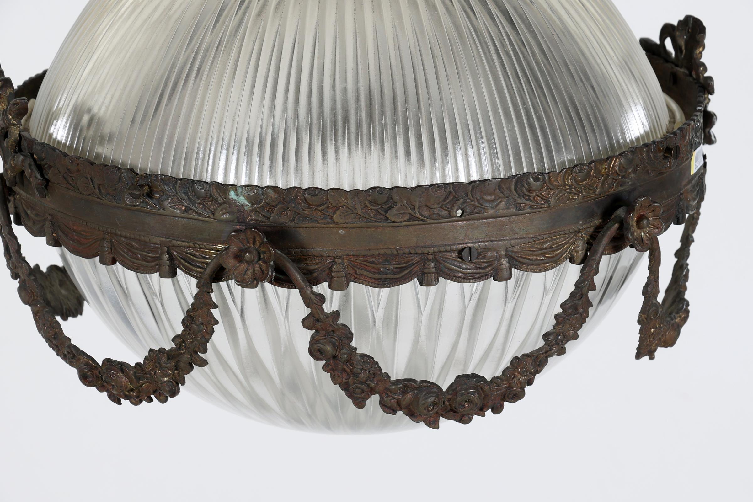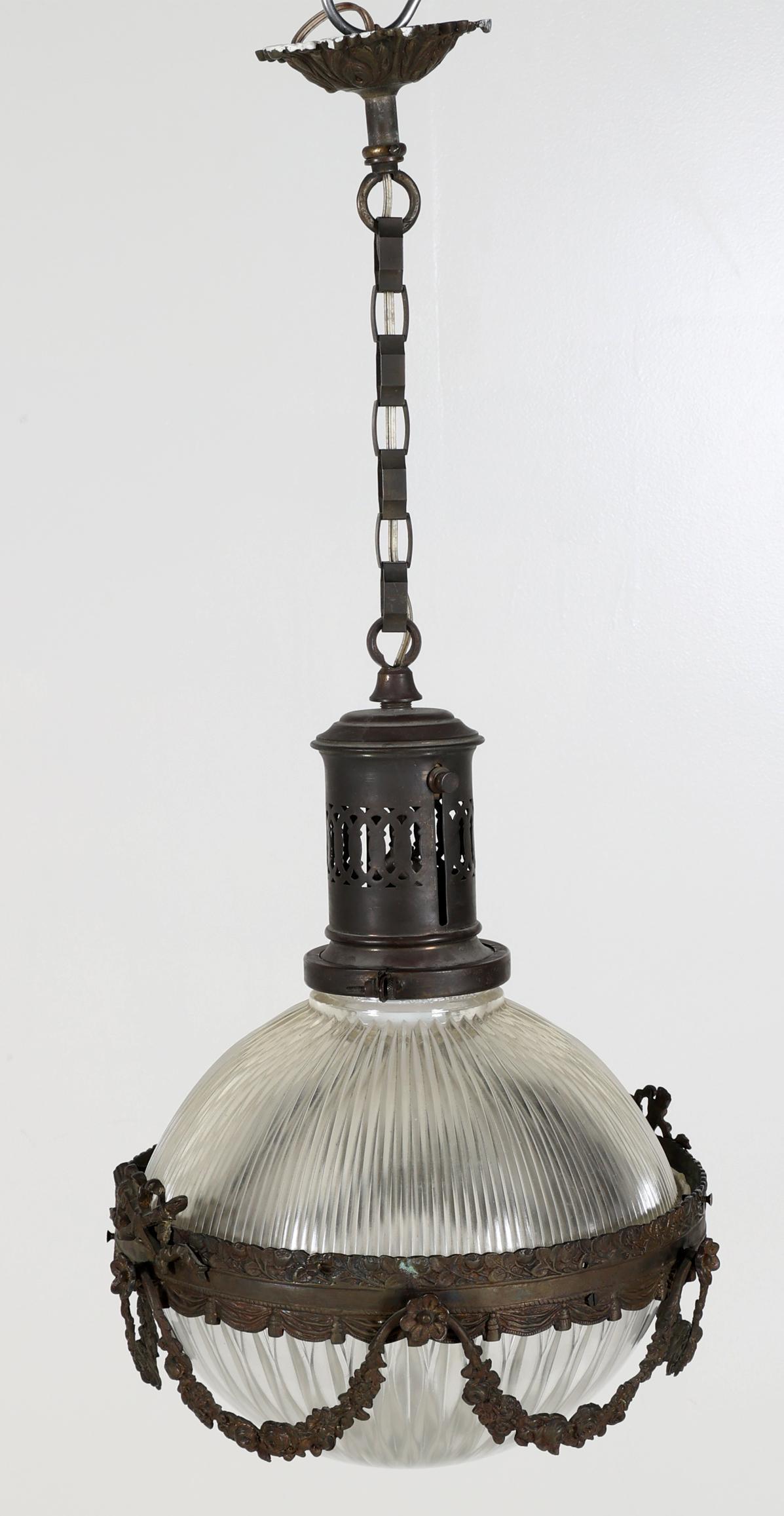 Oude glazen hanglampje met koperen montuur, h.70 cm.