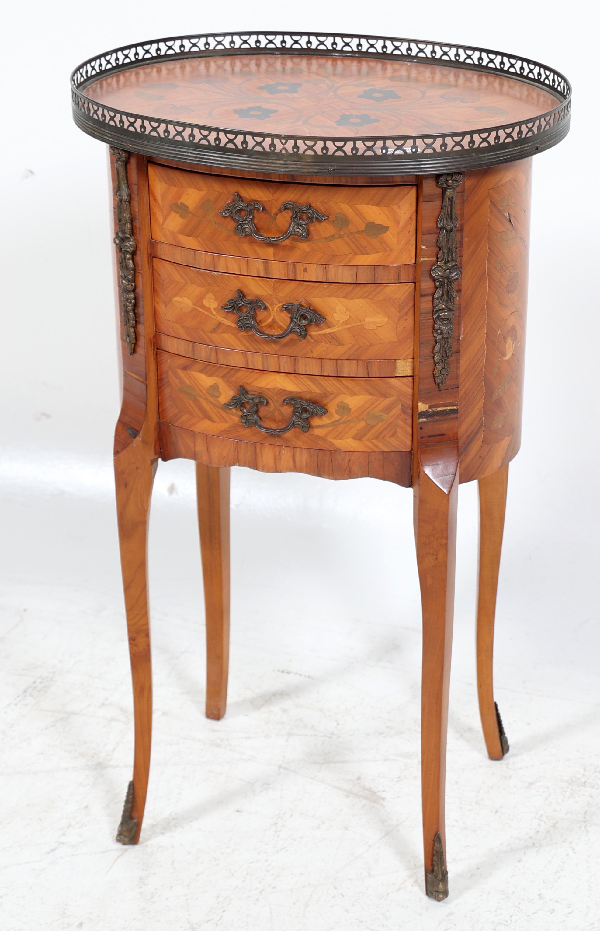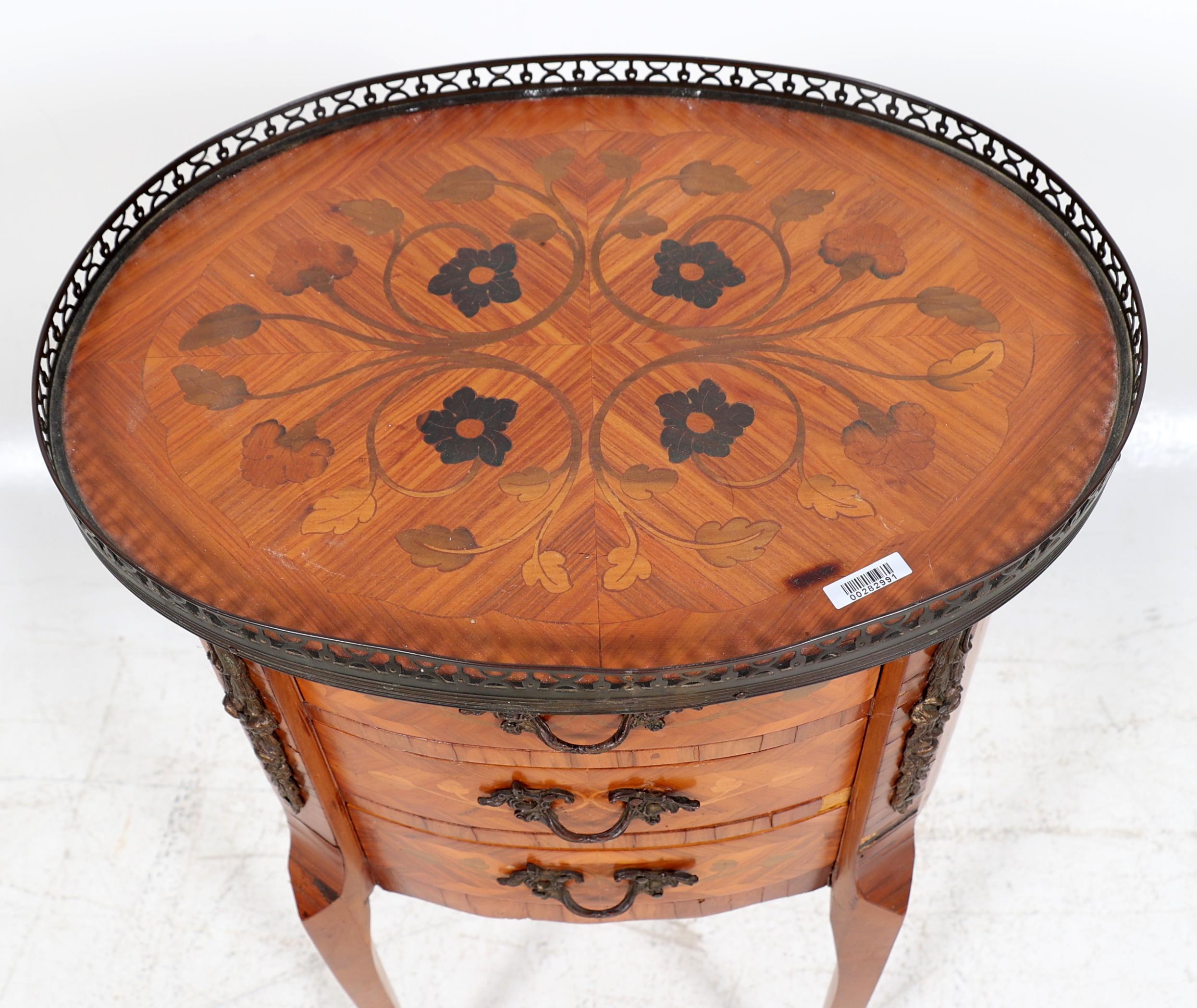 Oude met diverse houtsoorten belijmde bijzettafel met 3 laden, met florale motieven en afgewerkt met koperen beslag, h.74 x b.44 x d.32 cm.