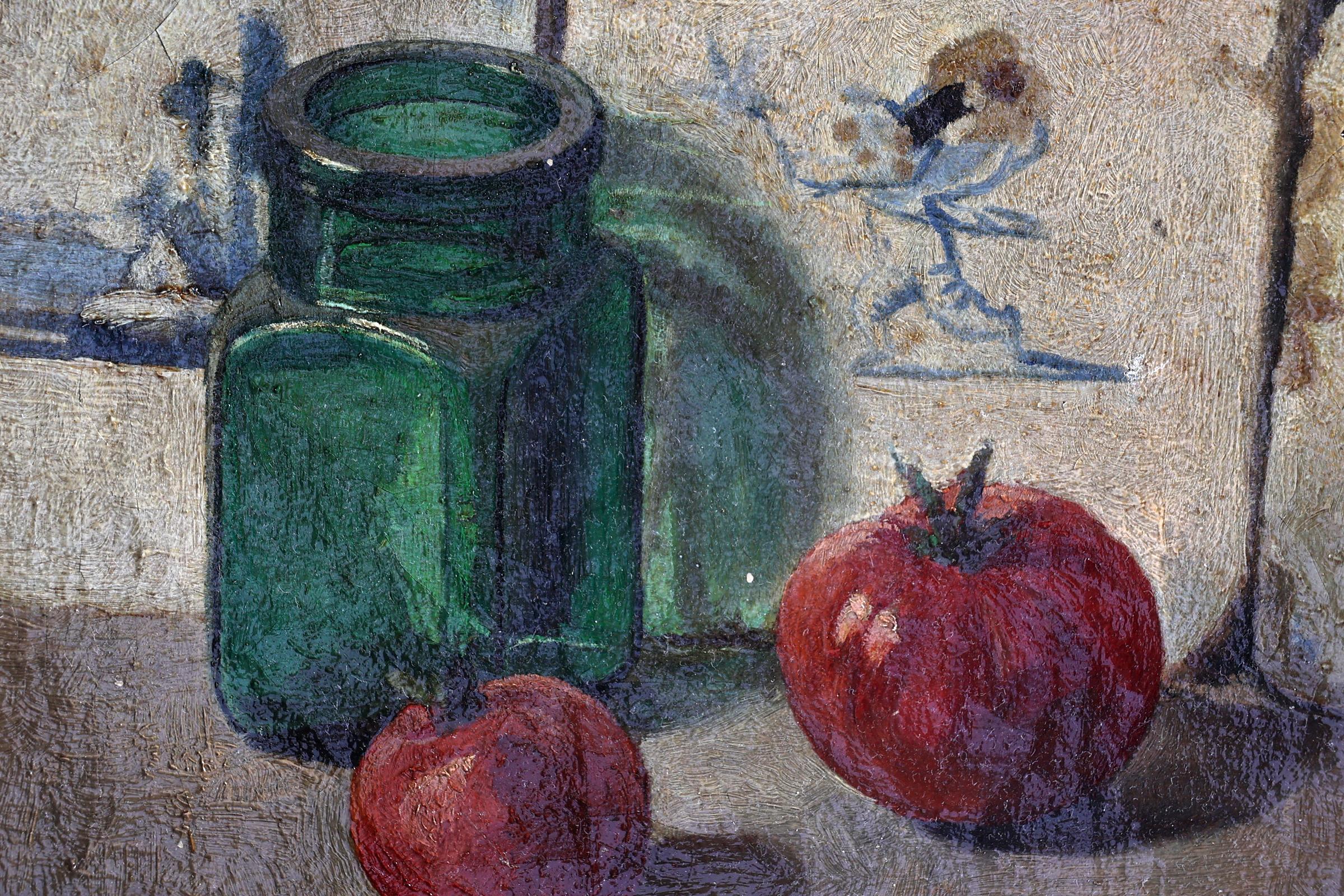 B.J. Schreinders, Stilleven met tomaat en tegeltjes, olieverf op doek, gedateerd 1944, 23 x 29 cm.