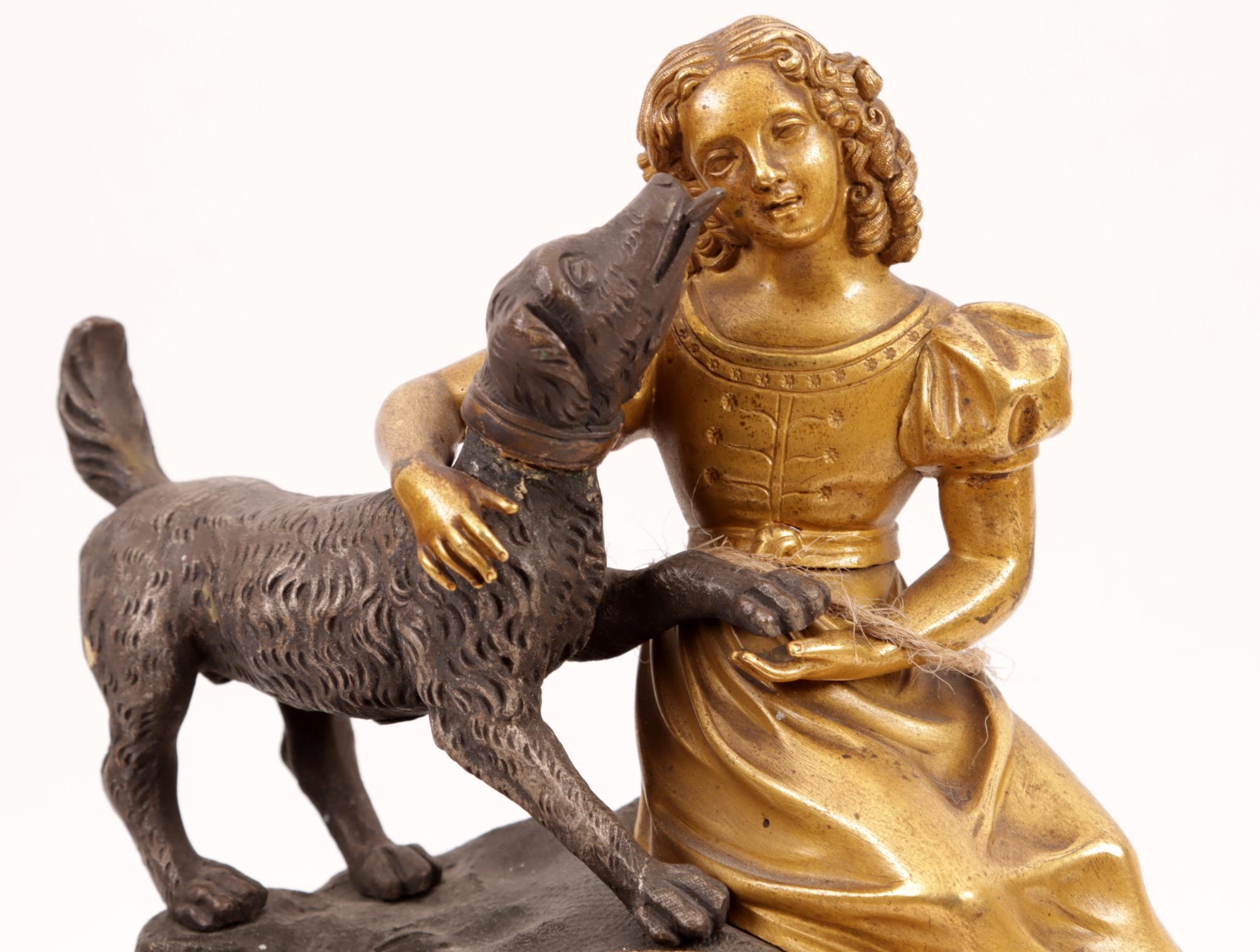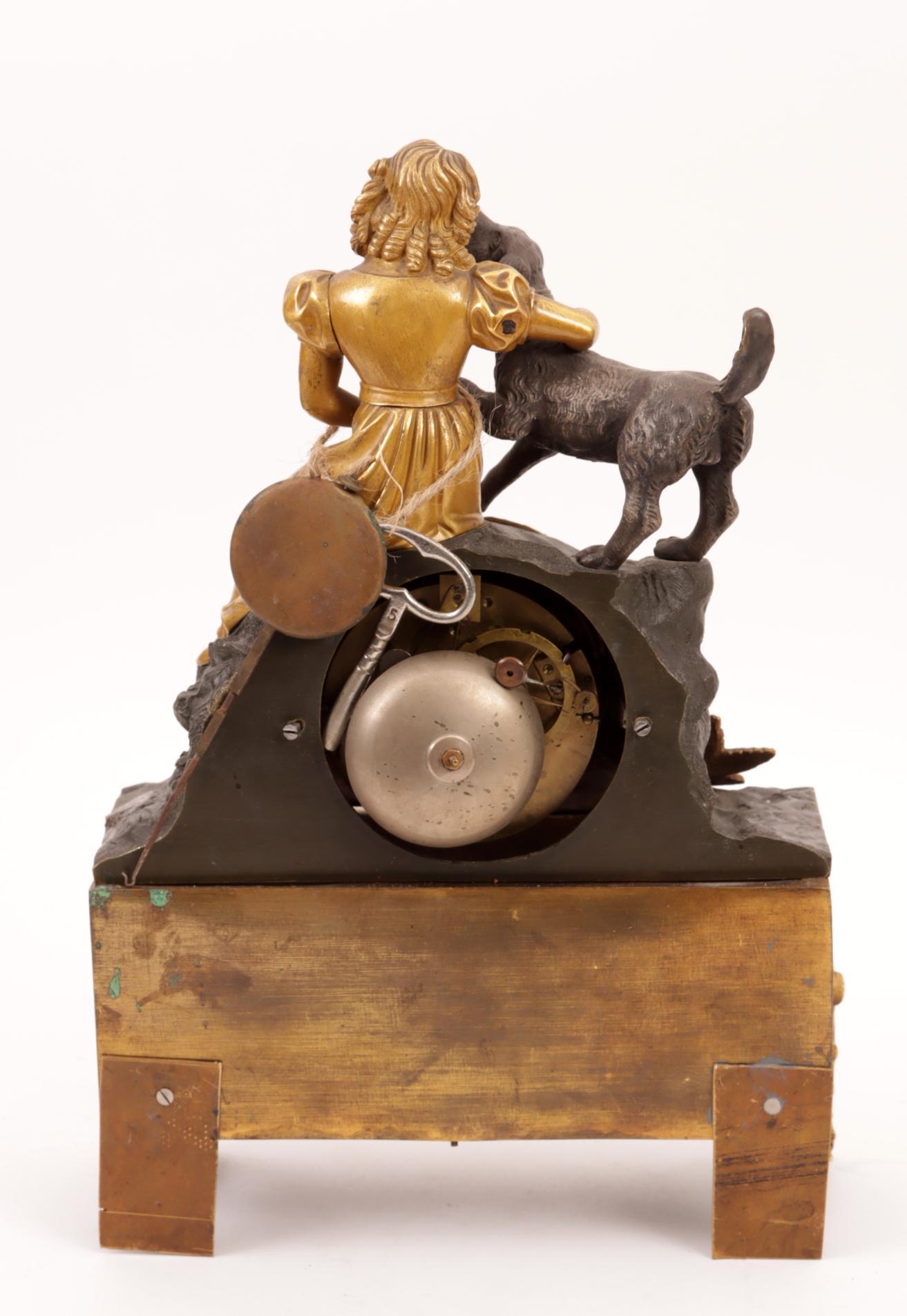 Antieke deels verguld bronzen pendule met voorstelling van een meisje met hond, h.33 cm.