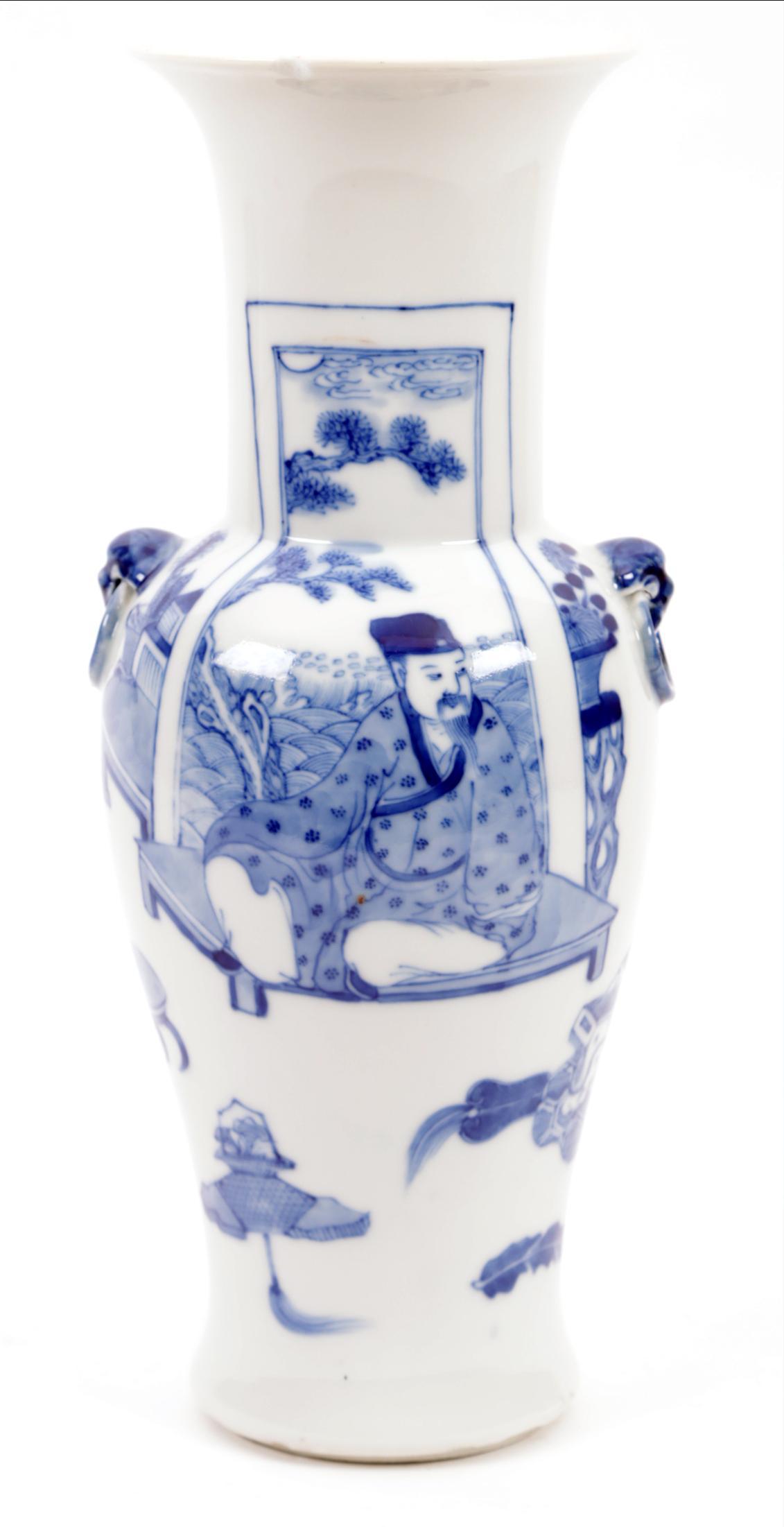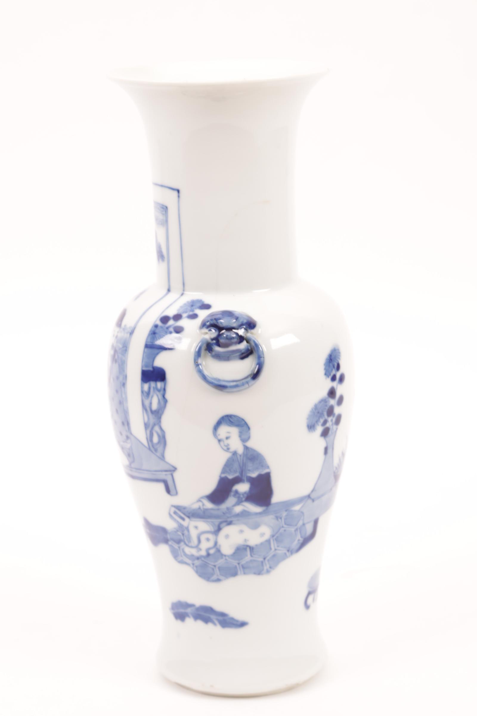 Blauw/wit Chinees porseleinen vaas met decor van 2 zittende personen h.26 cm.