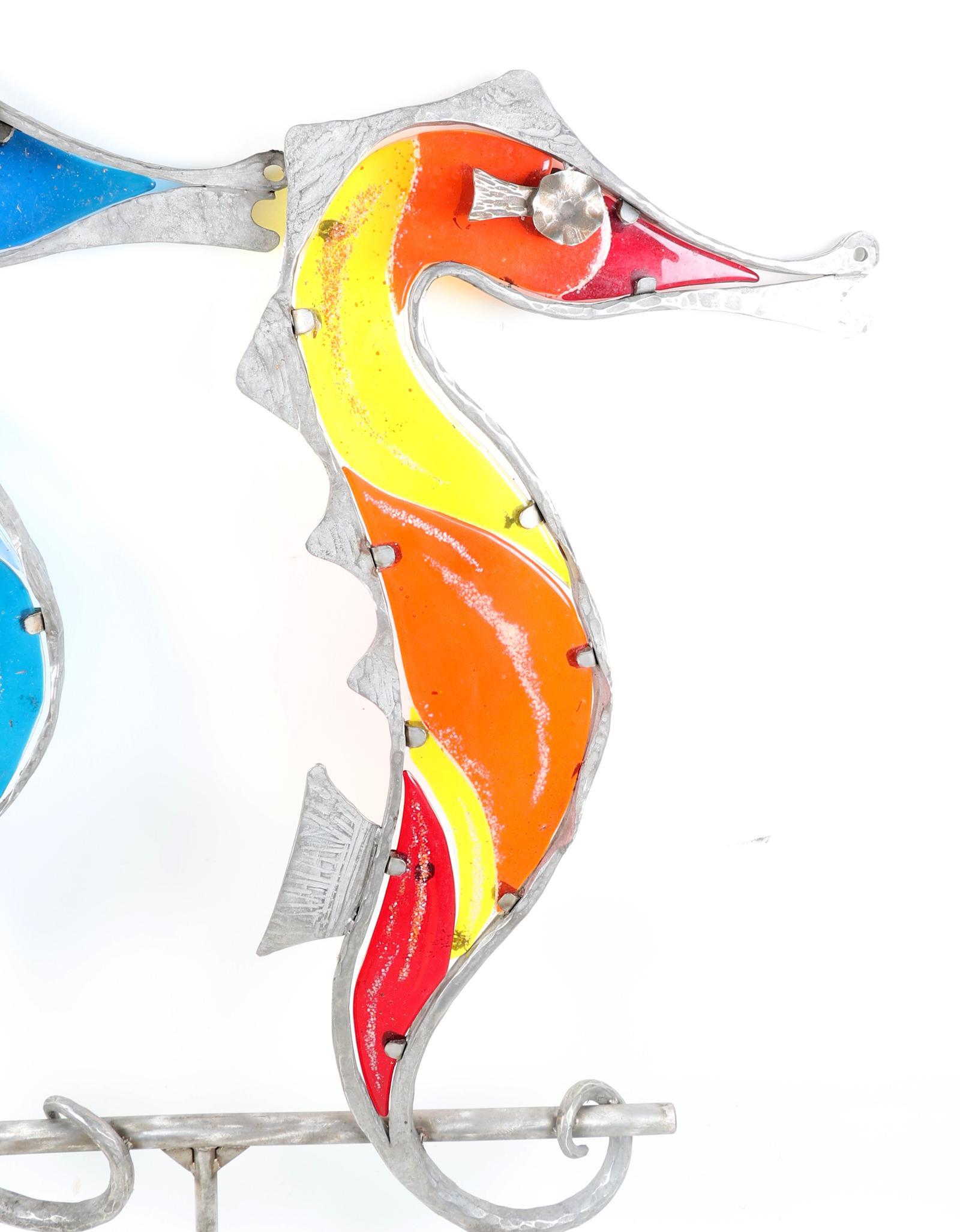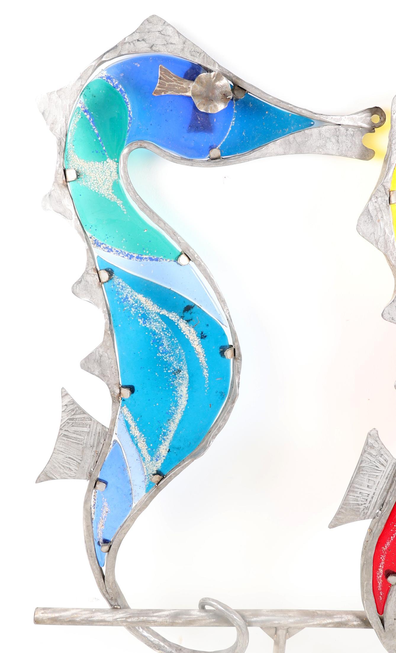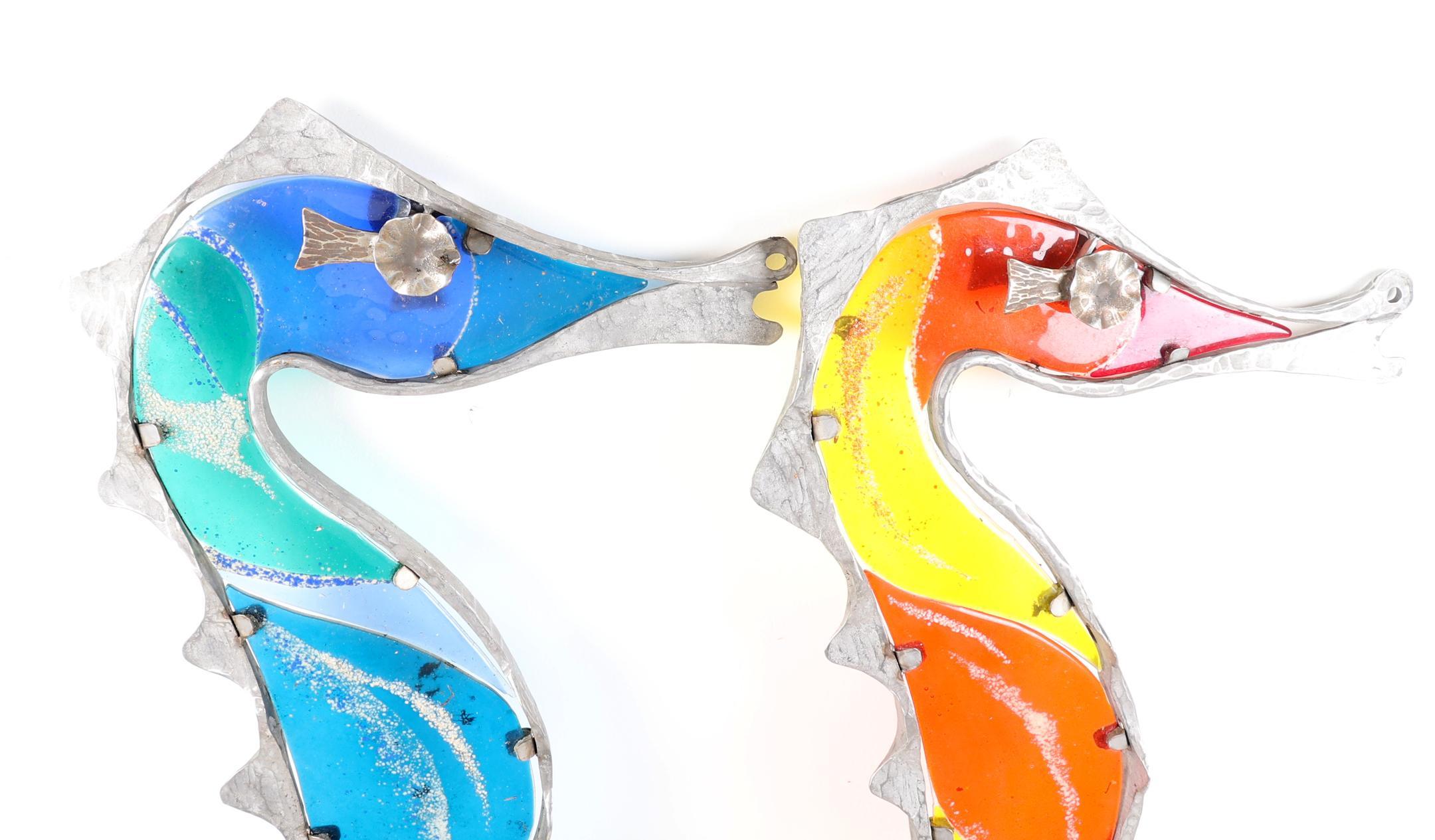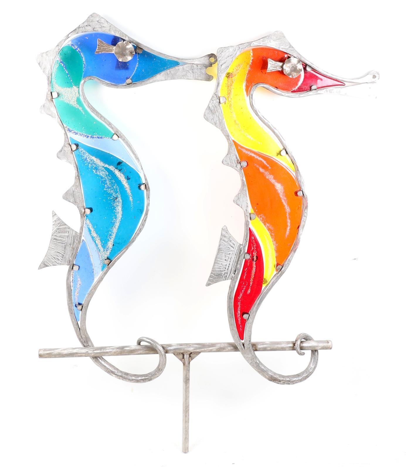 Roest vrij stalen met glas uitgevoerde sculptuur van twee zeepaardjes op grote grondpaal, h.120 x b.97 cm. (Sculptuur), grondpaal, ca.h.350 cm., provenance particuliere collectie/Beeldentuin de Pruimengaard, aanschafwaarde € 2660