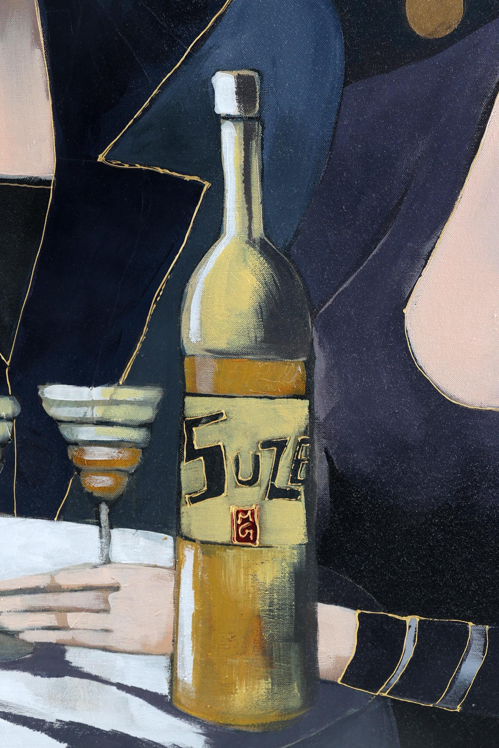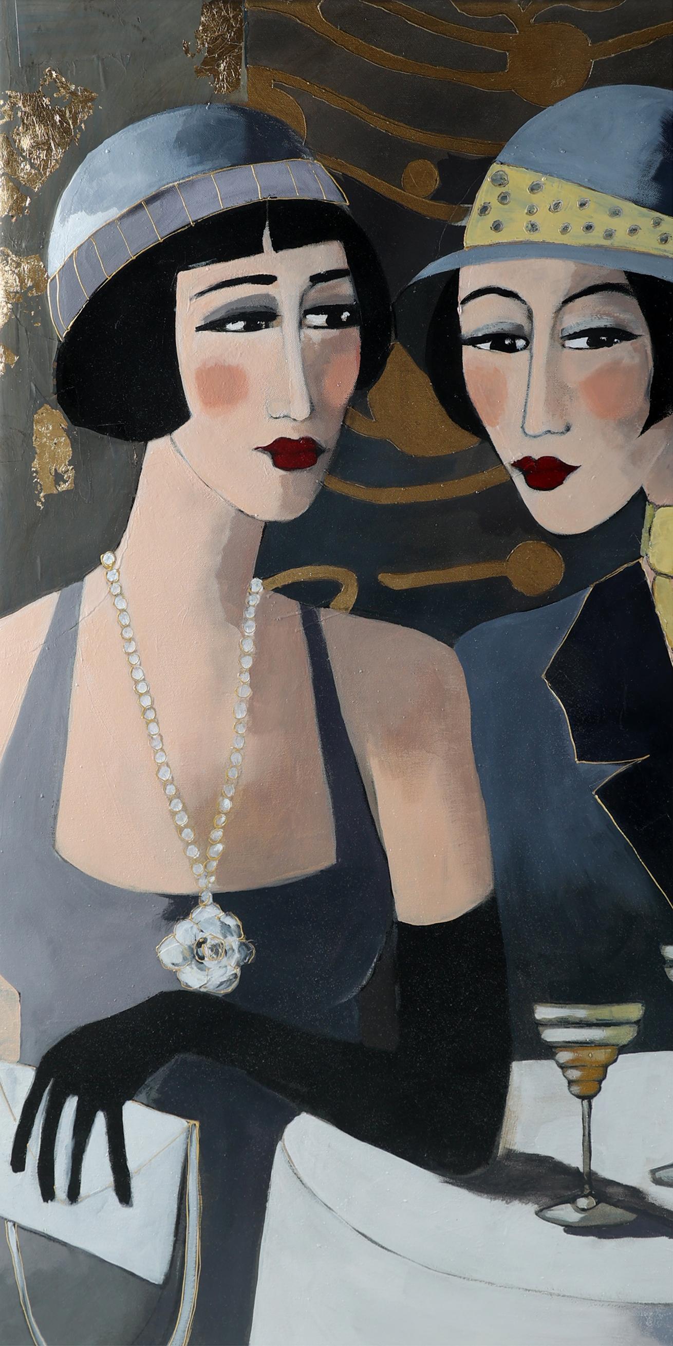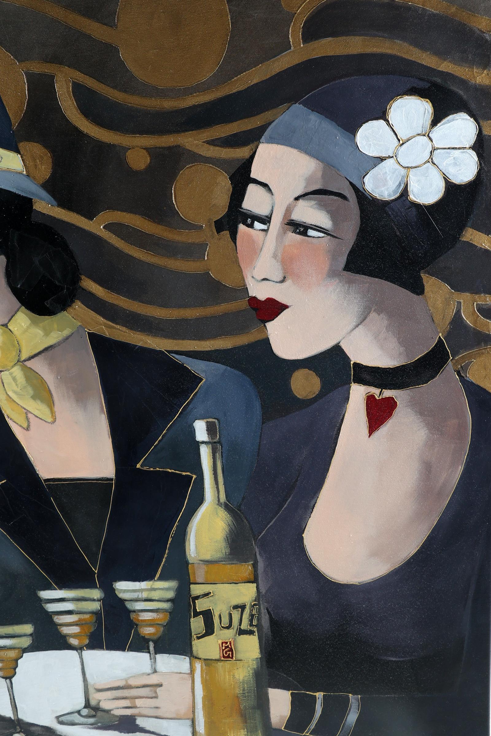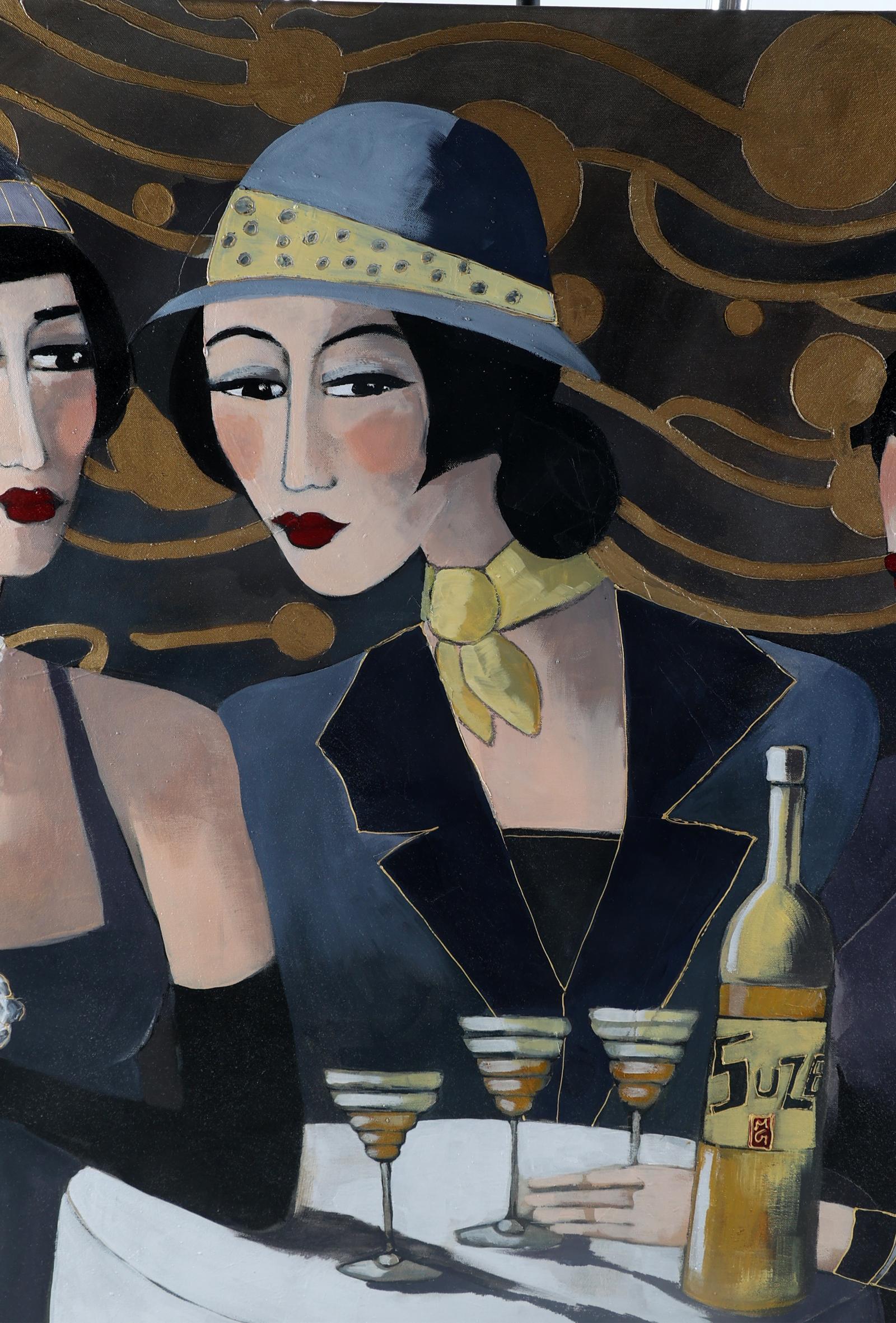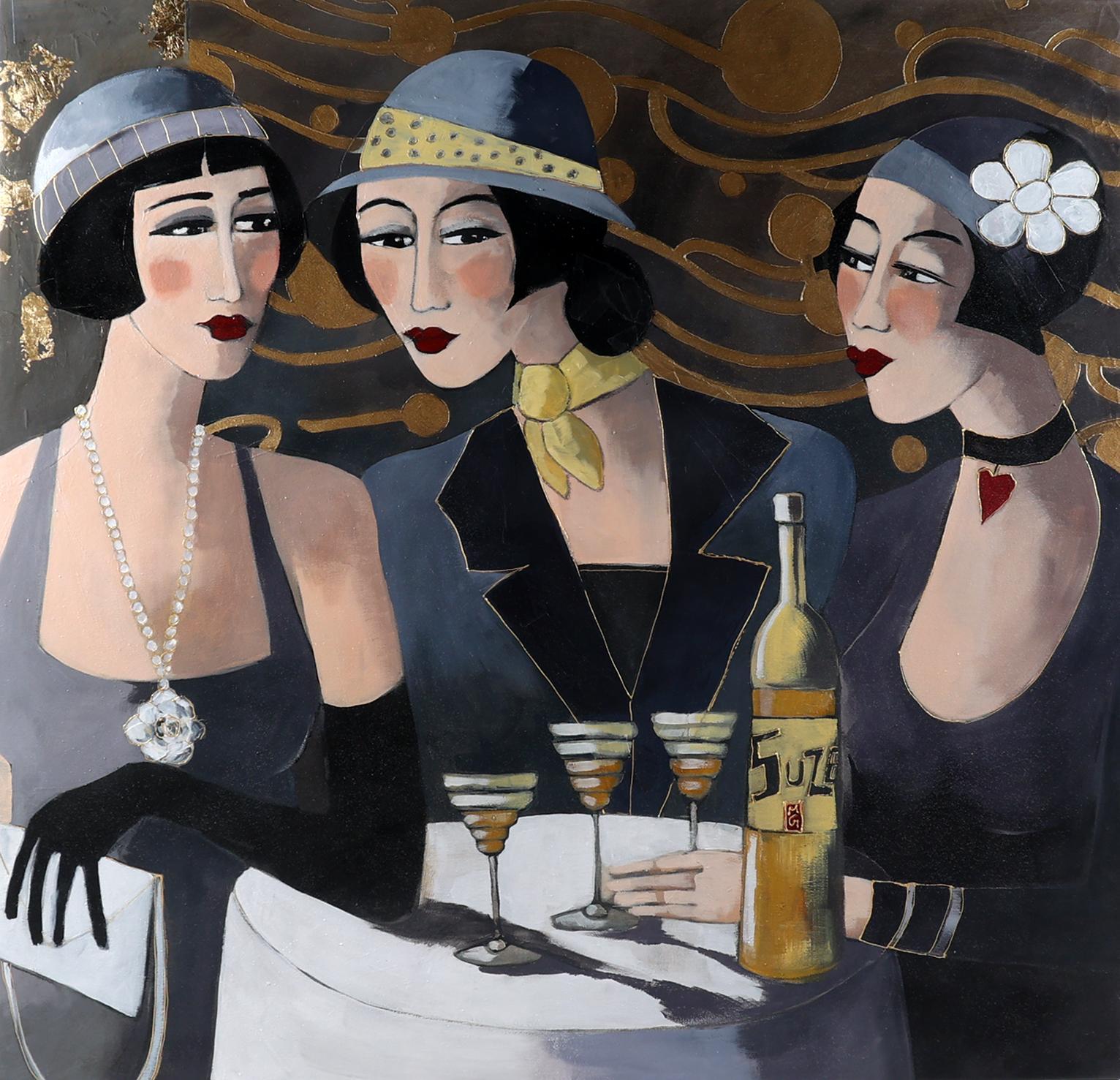 Marie Godest (1971), Drie art deco dames in het café, acrylverf met bladgoud op doek, 121 x 125 cm., provenance particuliere collectie/Galerie Peter Leen