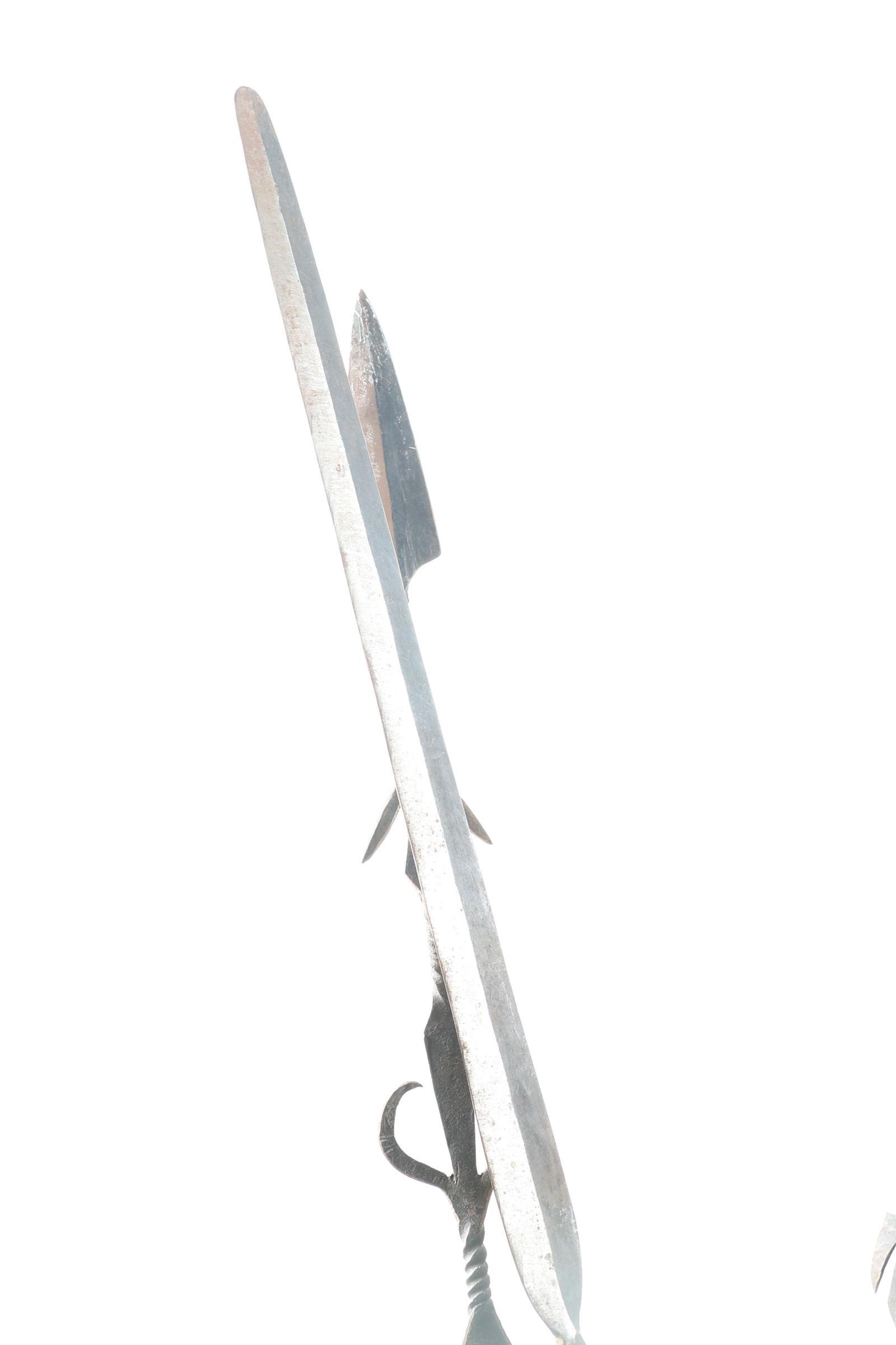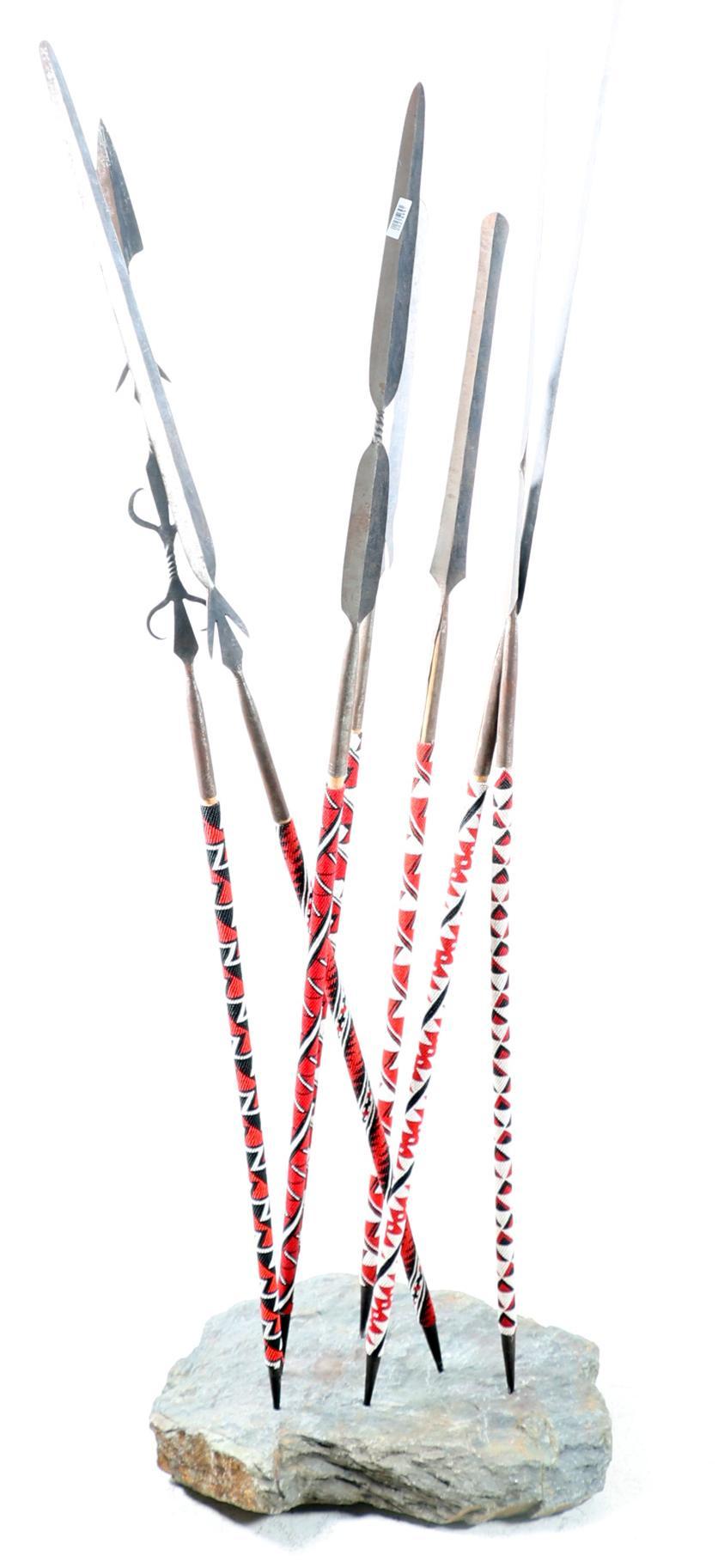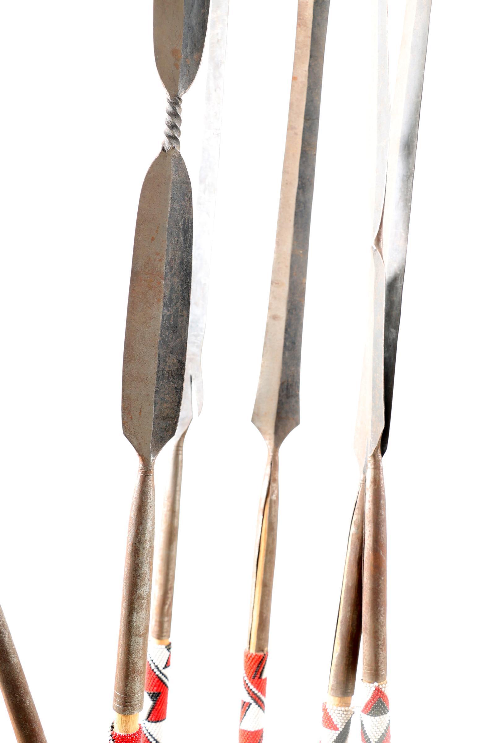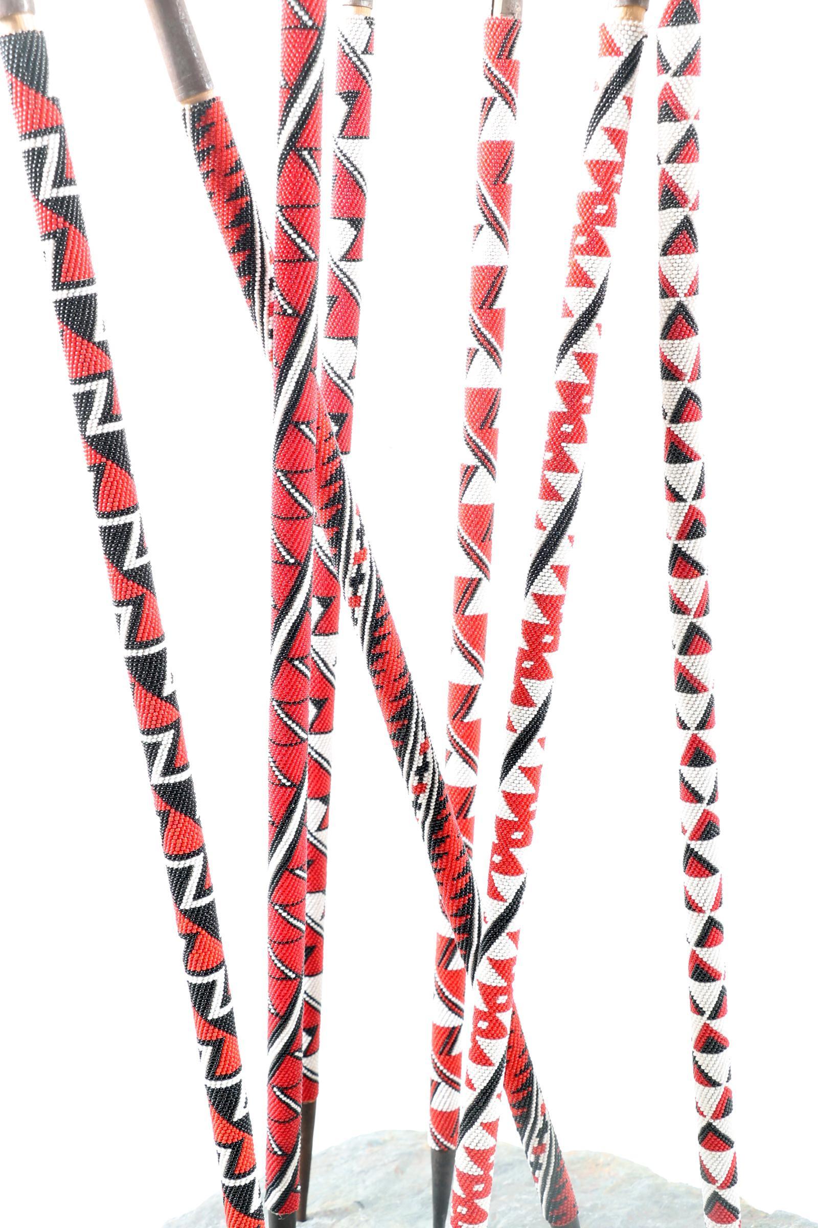 7 Met kralen gedecoreerde speren op hardstenen voetstuk