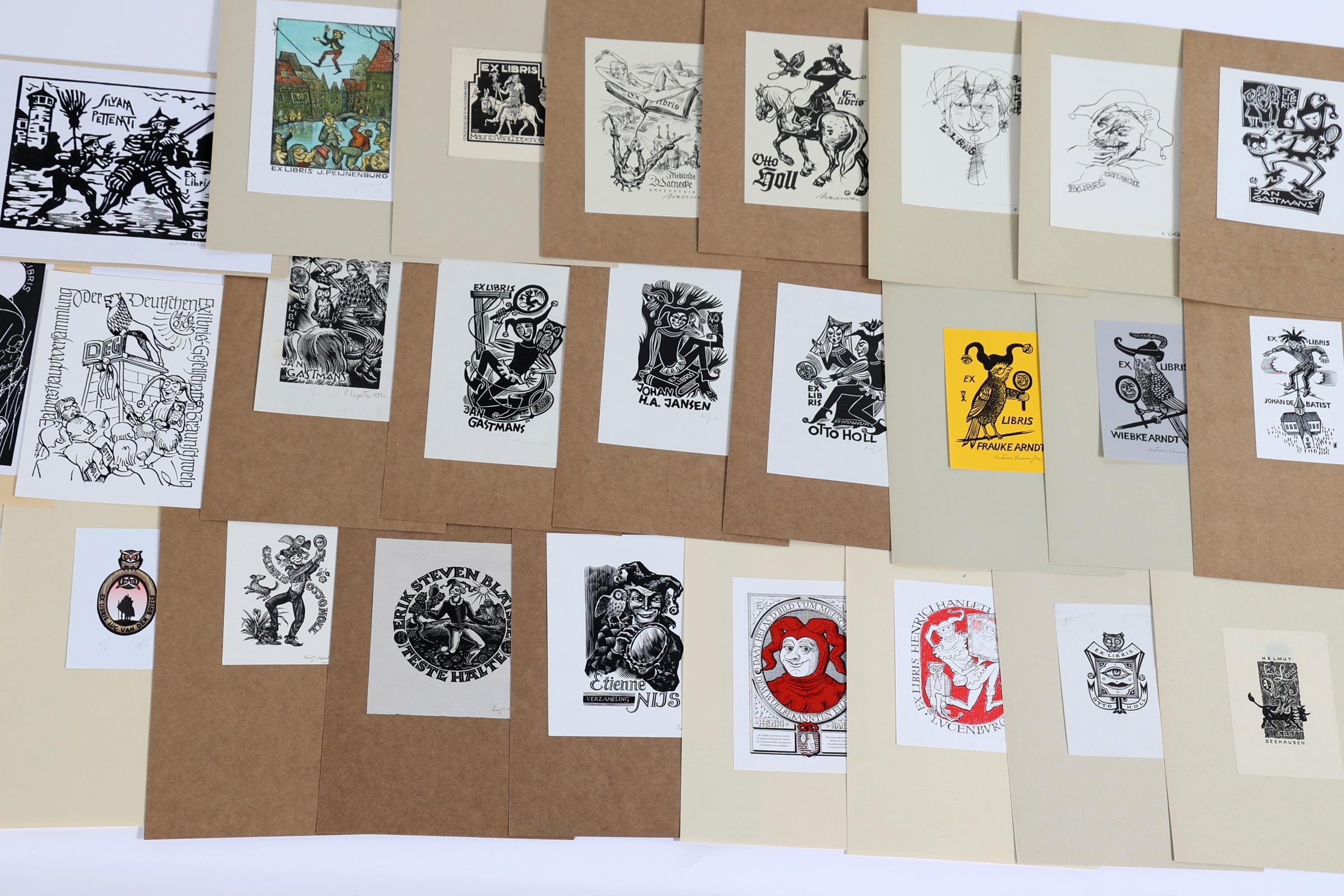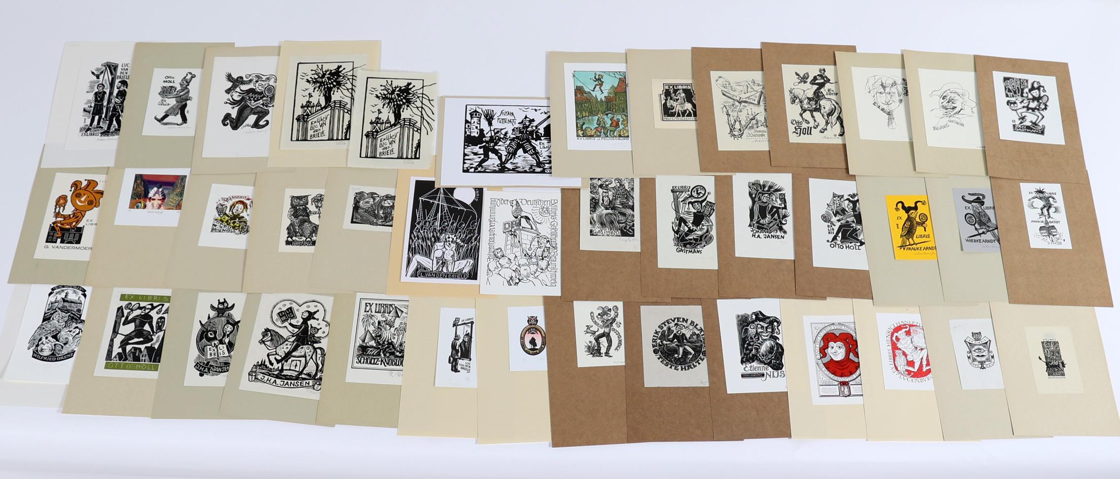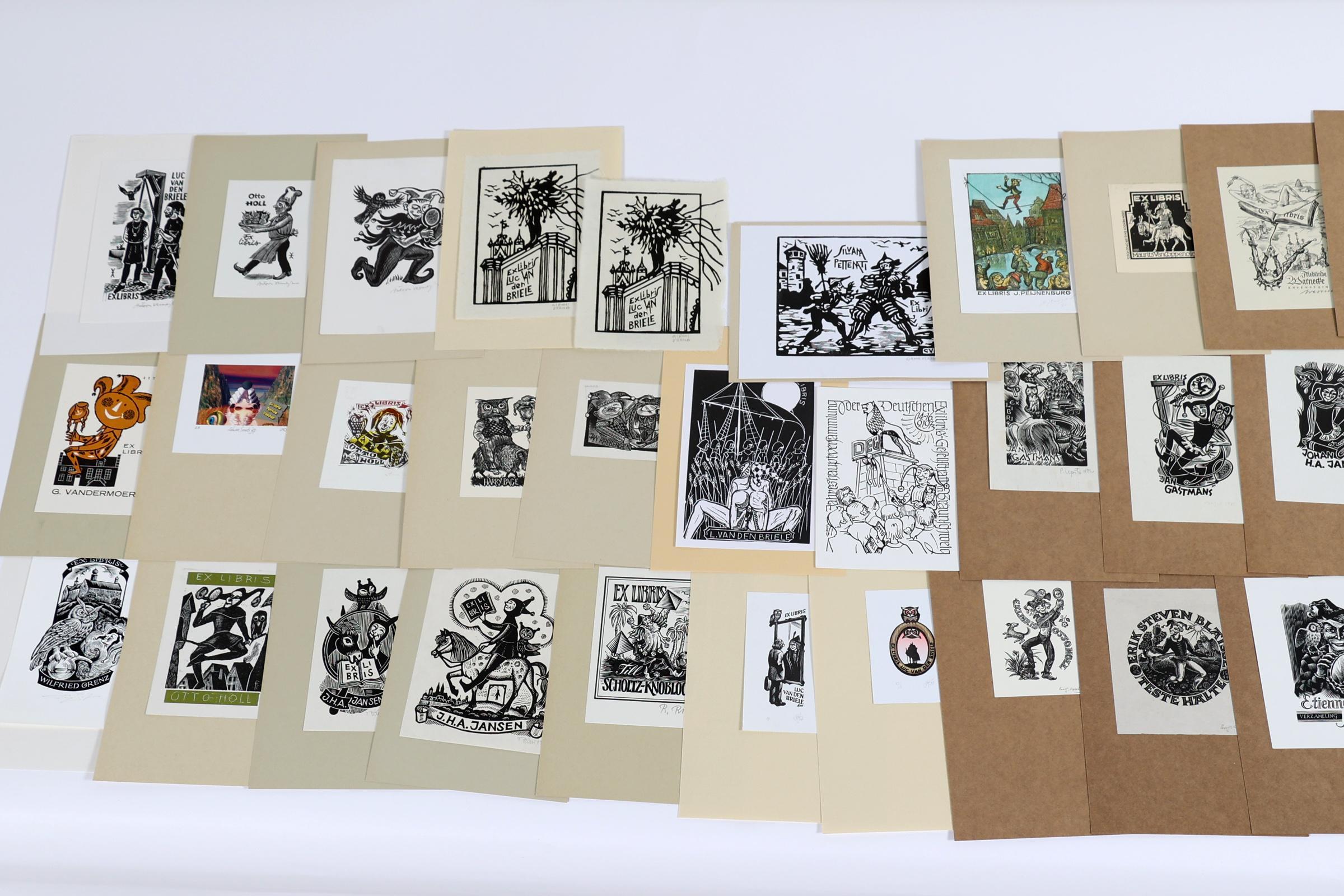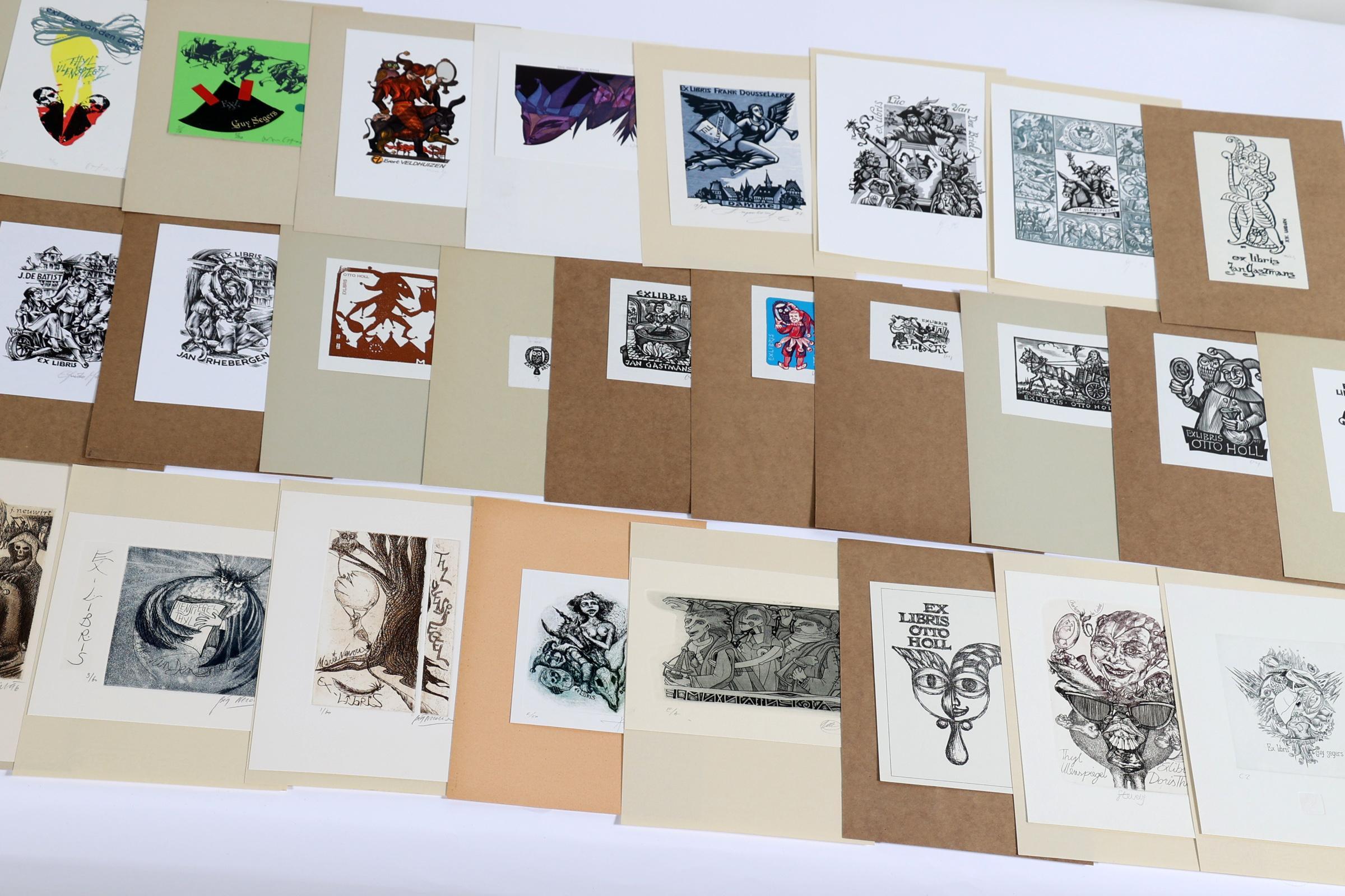 collectie van plm. 90 exlibris, thema: Tyl UIlenspiegel / De Koster. Gemaakt door kunstenaars L t/m Z, plm. 19 x diepdruk, rest hoogdruk / vlakdruk. Deels gesigneerd, opgeplakt. Kunstenaars o.a. Nagy, Neuwirt, Vereschagin, Mommen, Stevens, Tarasco, Theumer, Lazarov, Mariman, Pauwels, Ott, Pugachevsky, Richter, Rueter, Strik, Valjal, Vermeylen