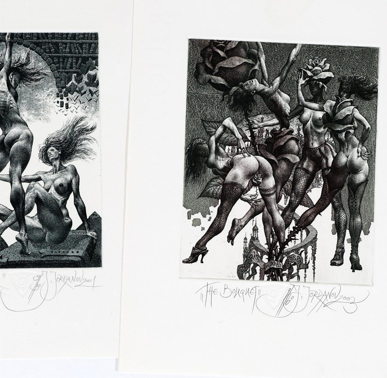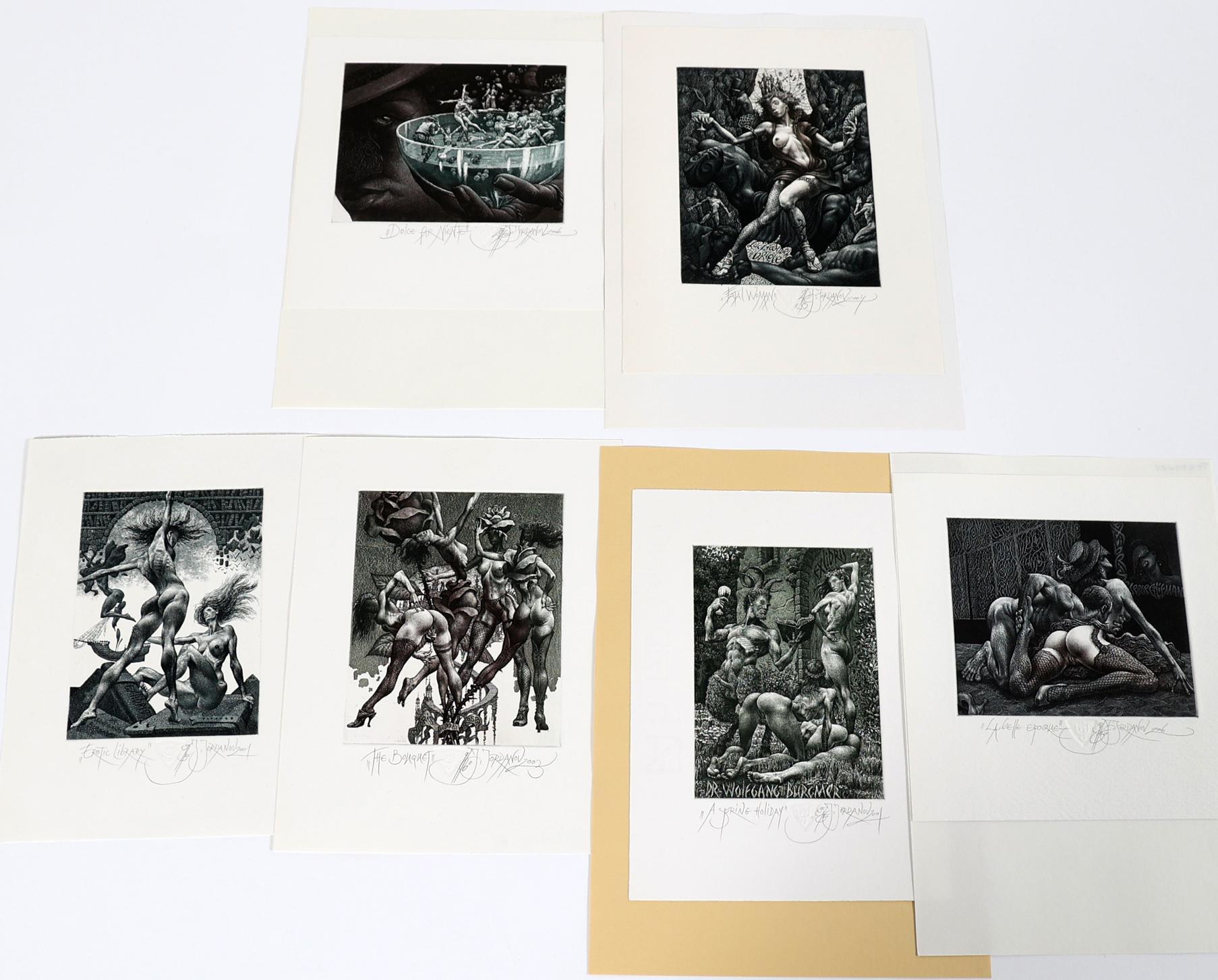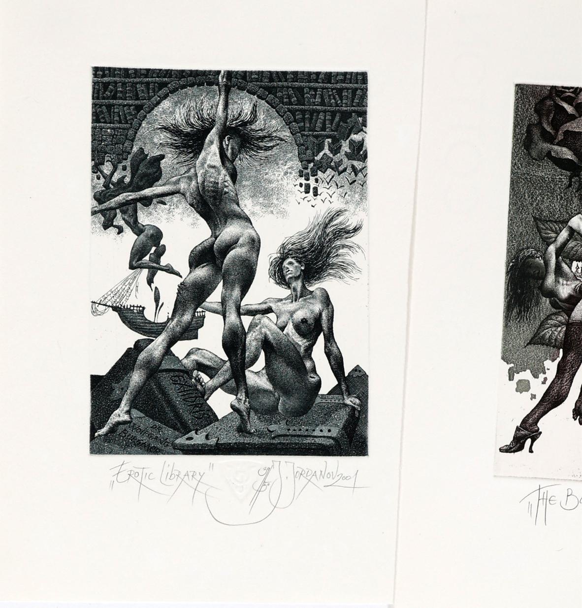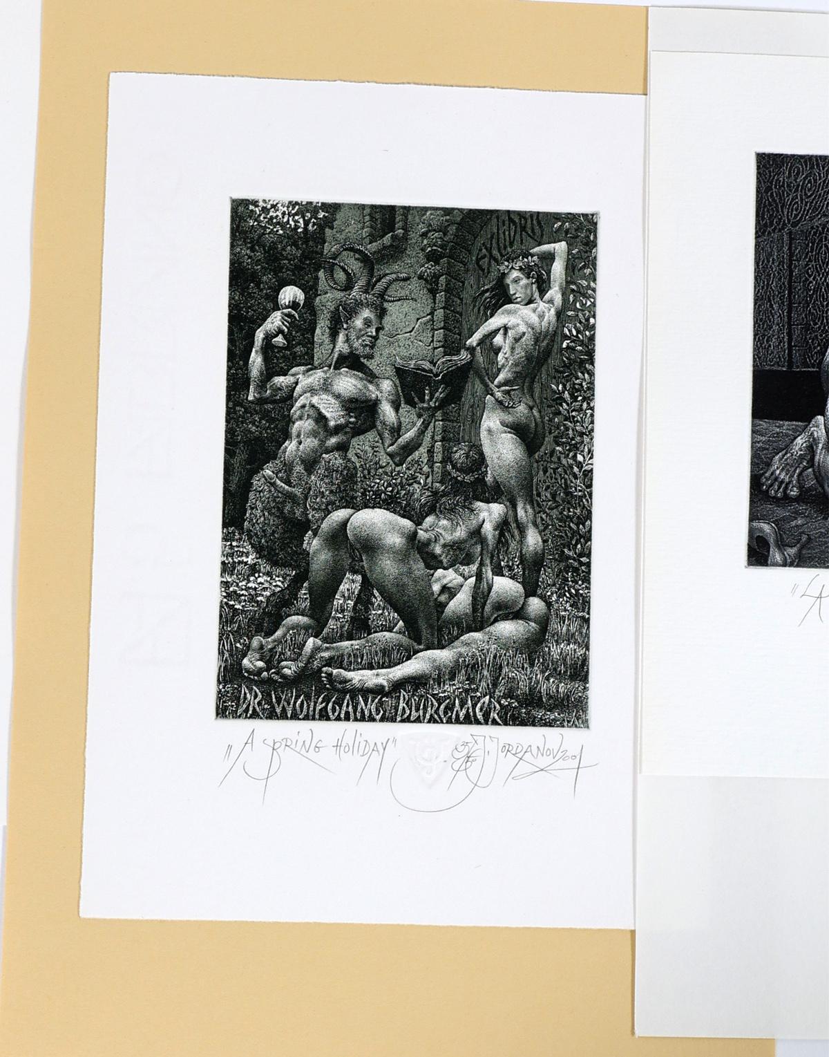 Jordanov, J., 6 exlibris, C3C5, thema: naakt / erotiek. Alle gesigneerd, opgeplakt / gewest. Voor Burgmer, Rosen, Golifman, Viaene, Van den Briele