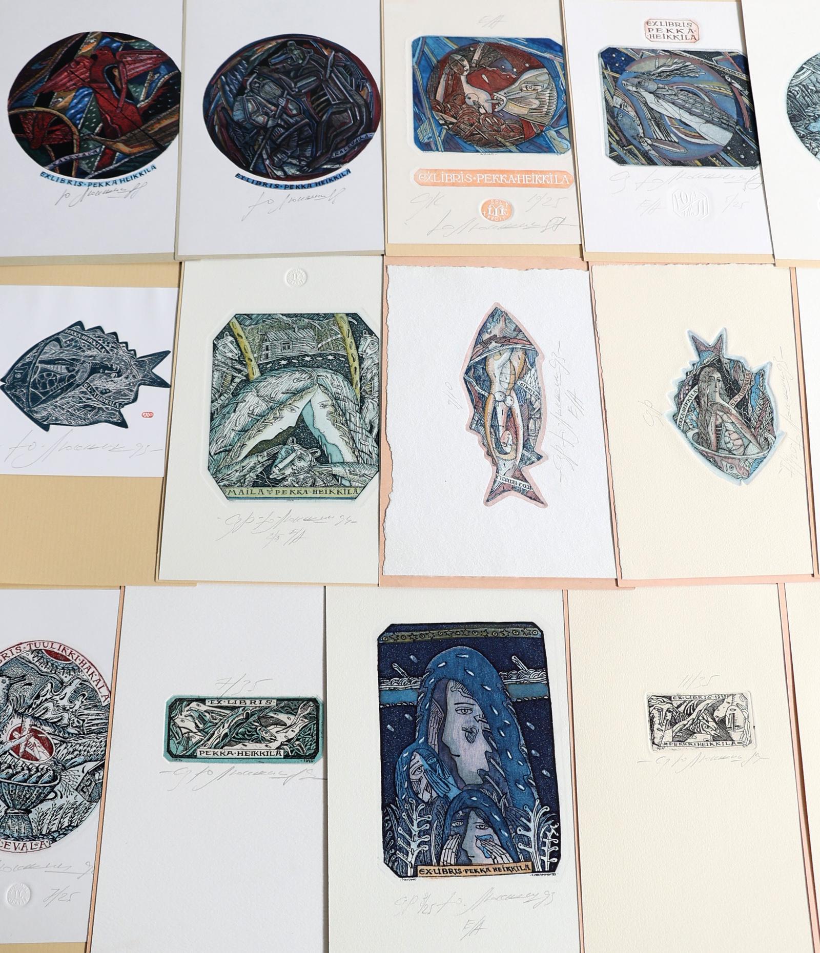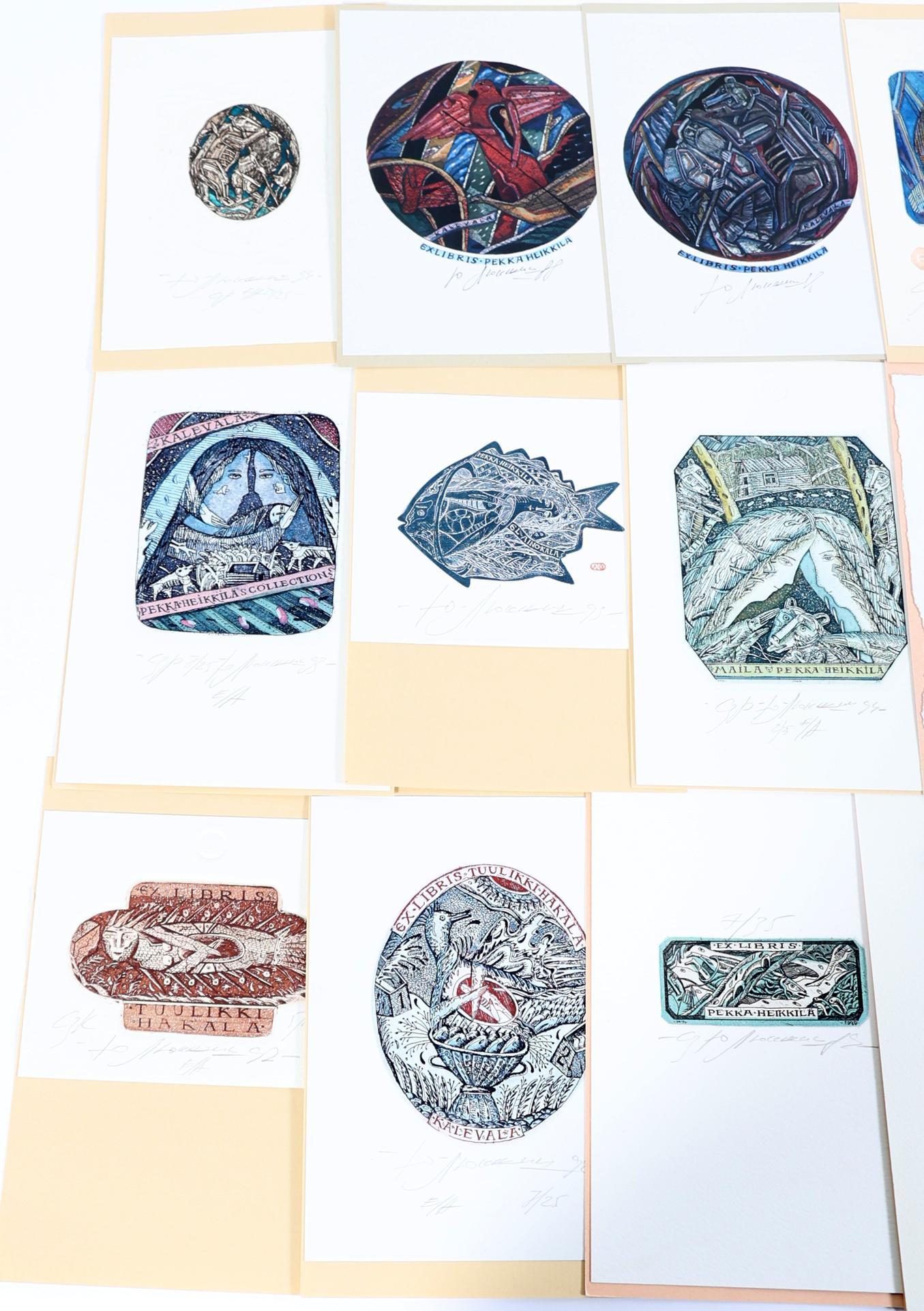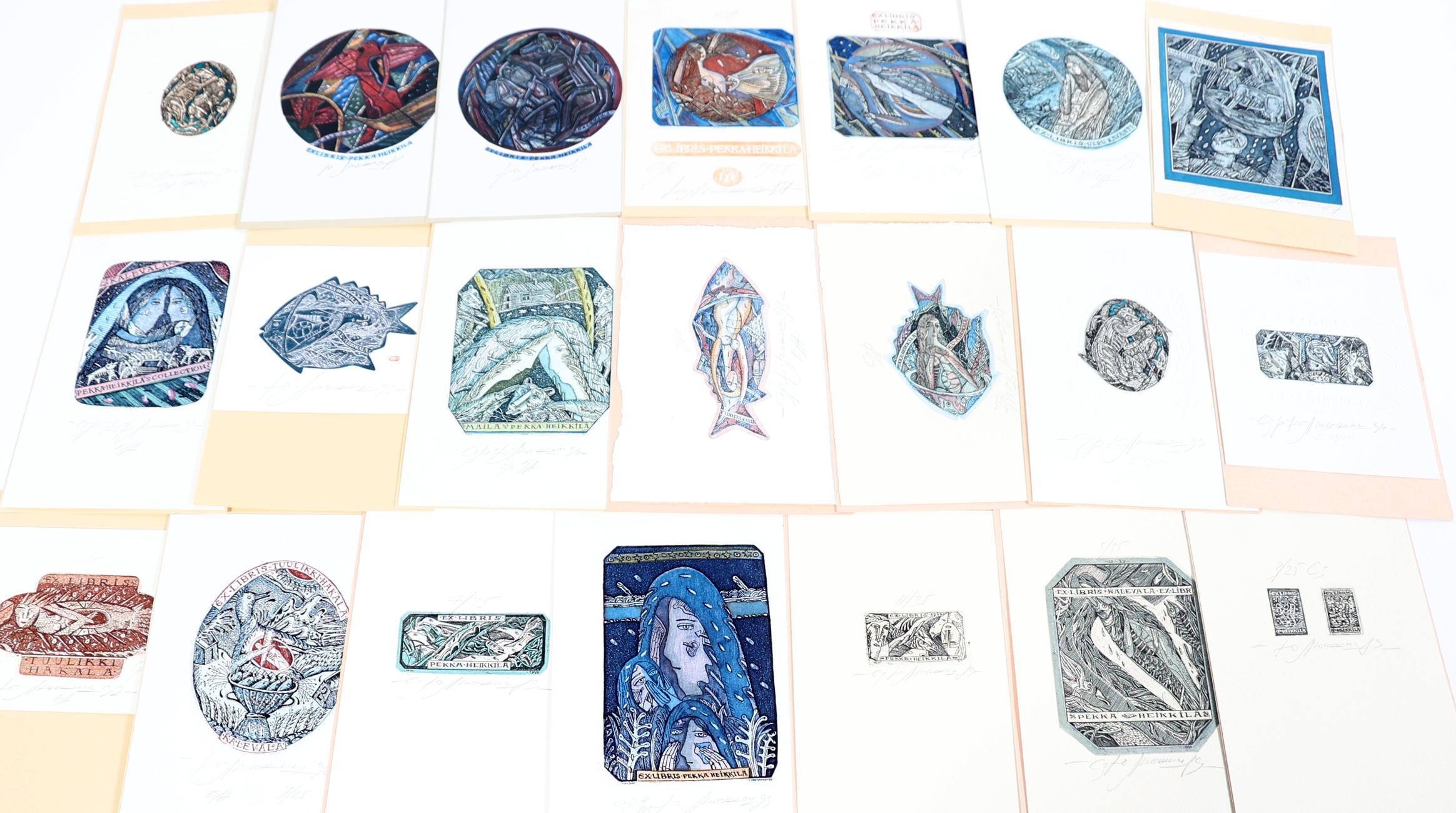 Liukshin, Y., plm. 21 exlibris, 19 x diepdruk, rest vlakdruk. Diepdrukken zijn deels (13 x) handgekleurd. Opgeplakt, alle gesigneerd. Veel voor P. Pekka Heikkila, Kalevela