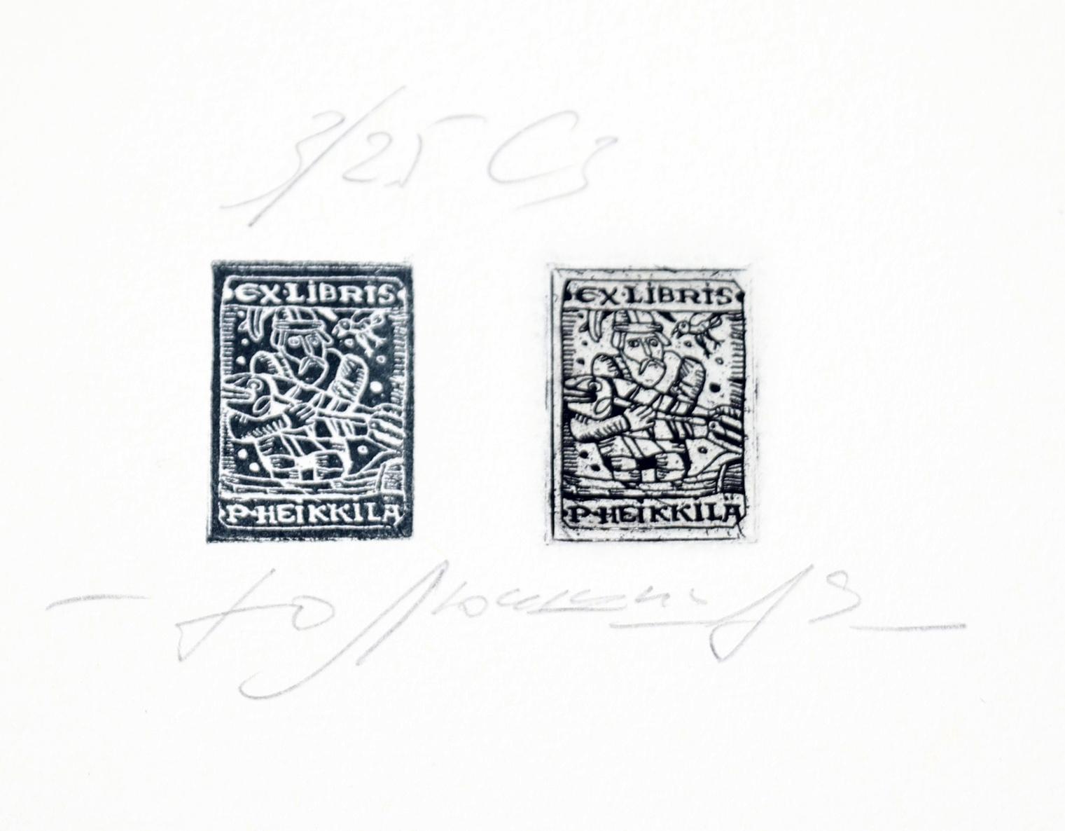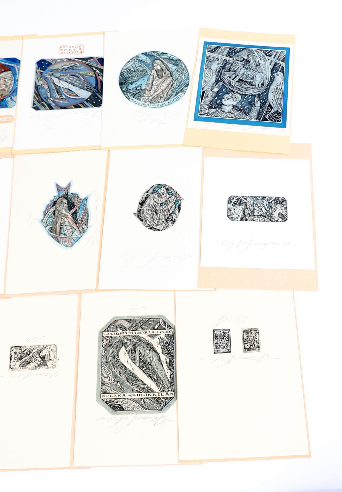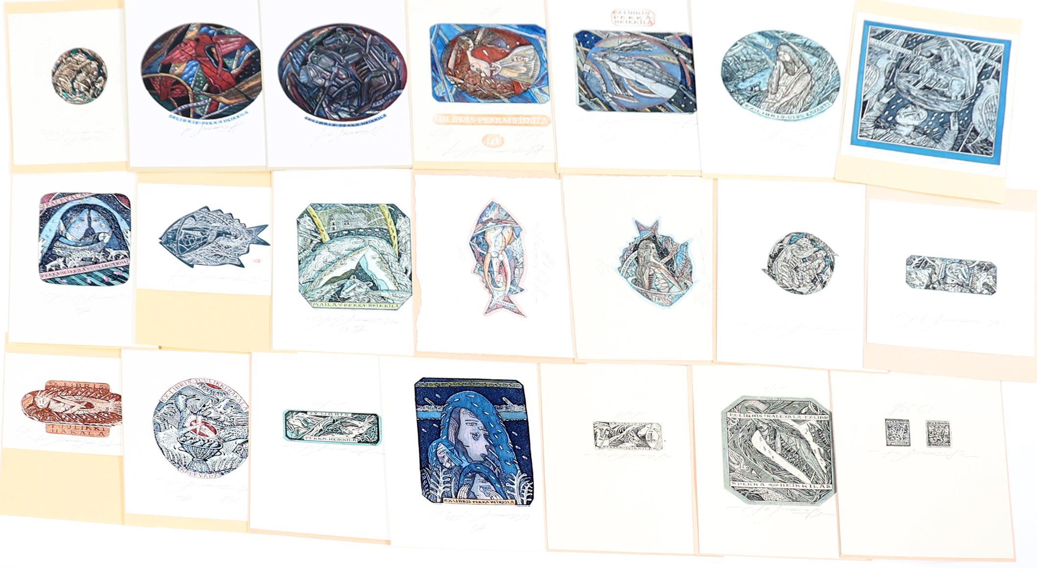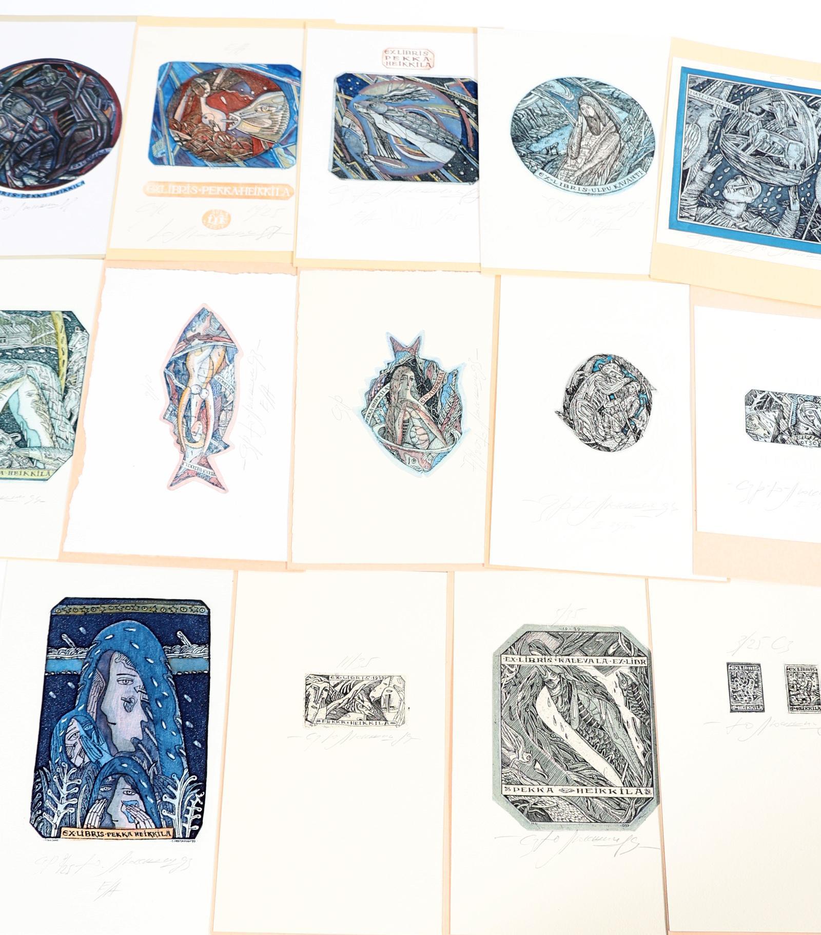 Liukshin, Y., plm. 21 exlibris, 19 x diepdruk, rest vlakdruk. Diepdrukken zijn deels (13 x) handgekleurd. Opgeplakt, alle gesigneerd. Veel voor P. Pekka Heikkila, Kalevela