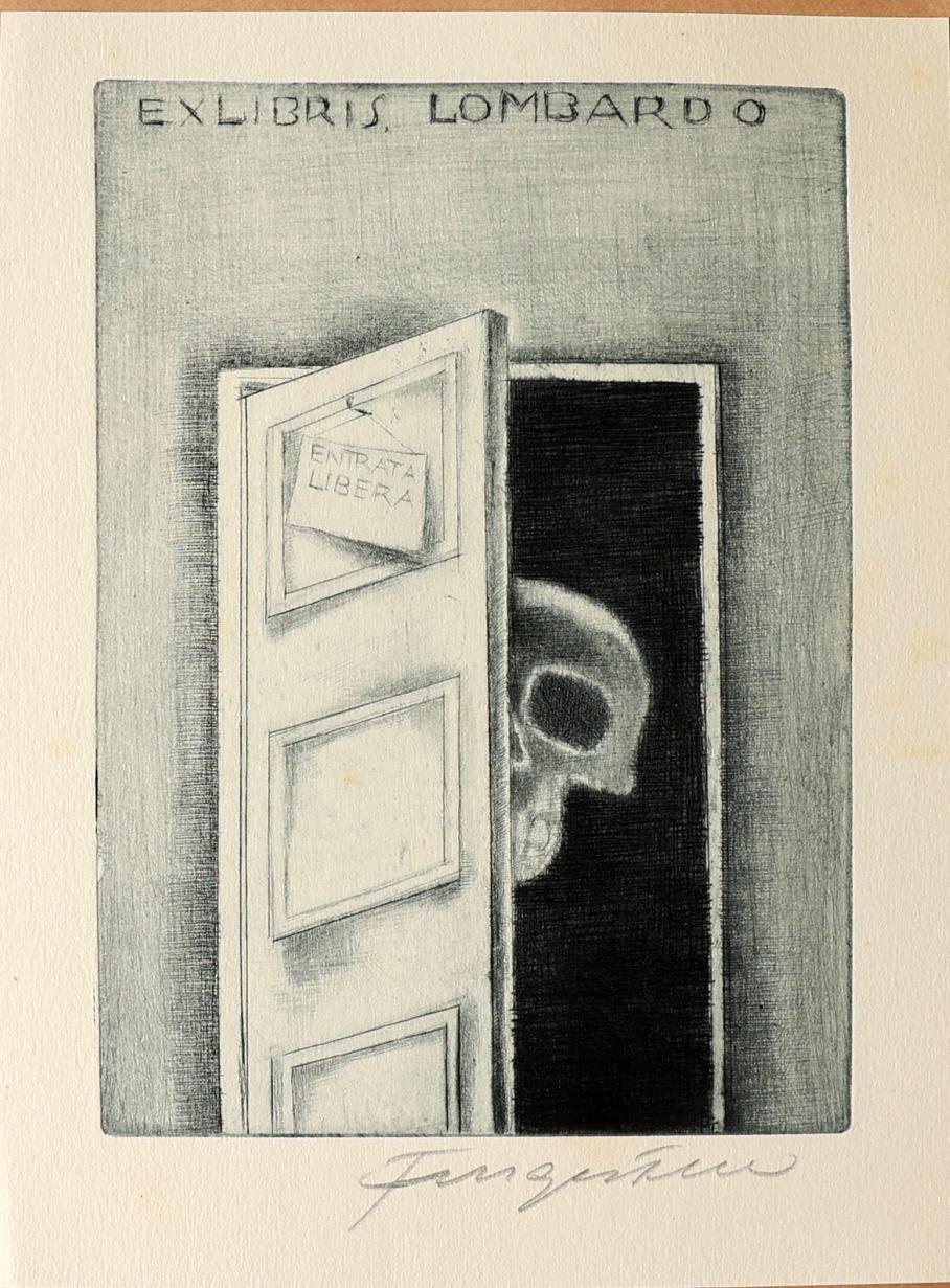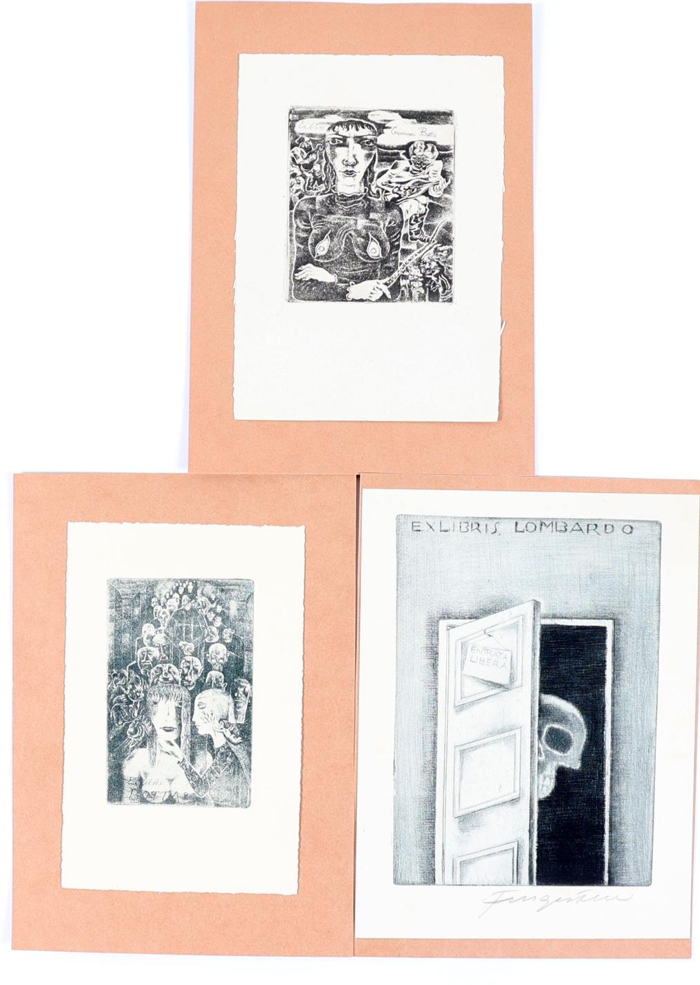 Fingesten, M.,3 exlibris, C3, 1 x gesigneerd. Voor Lombardo, Botta (2x). Opgeplakt.