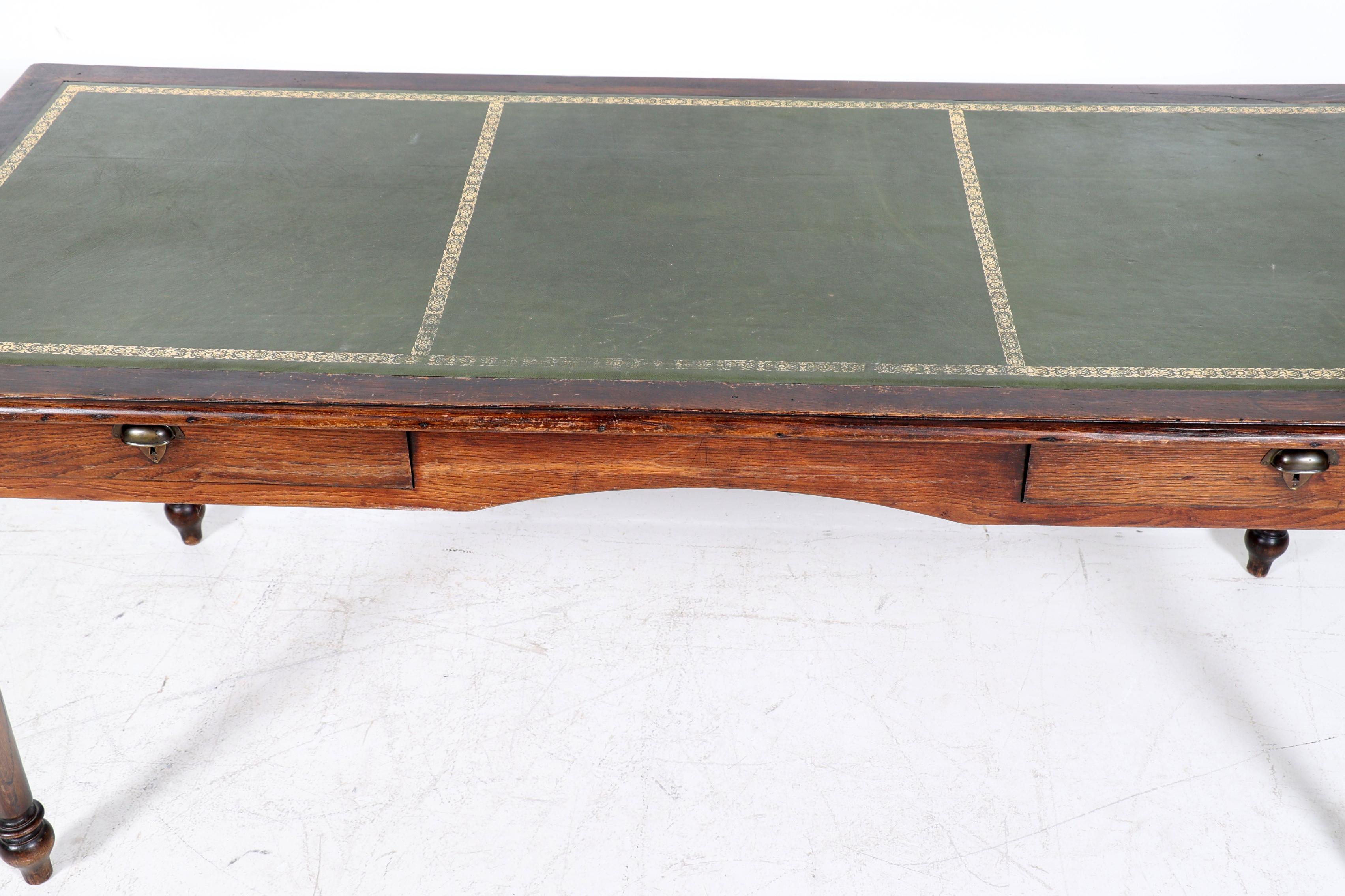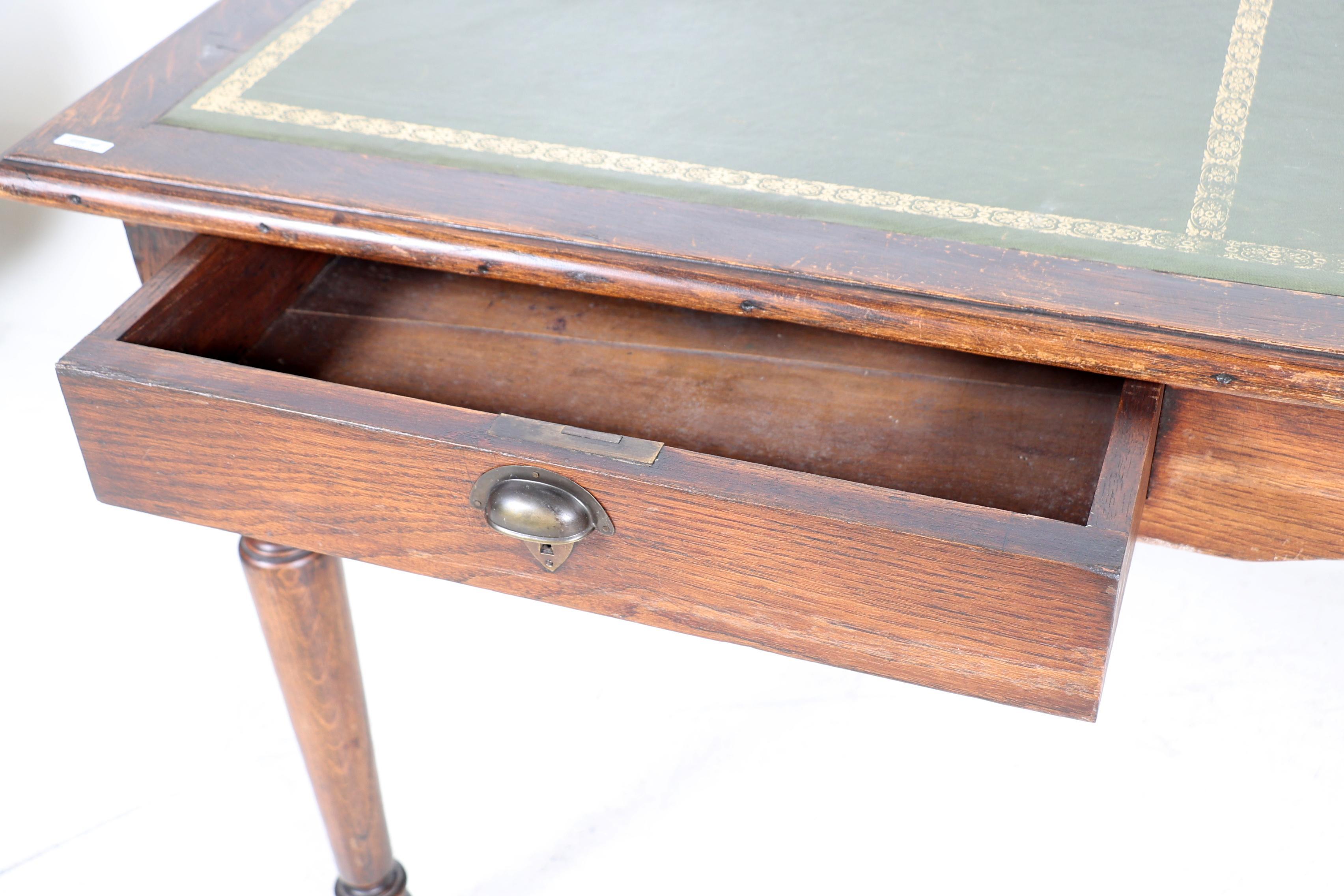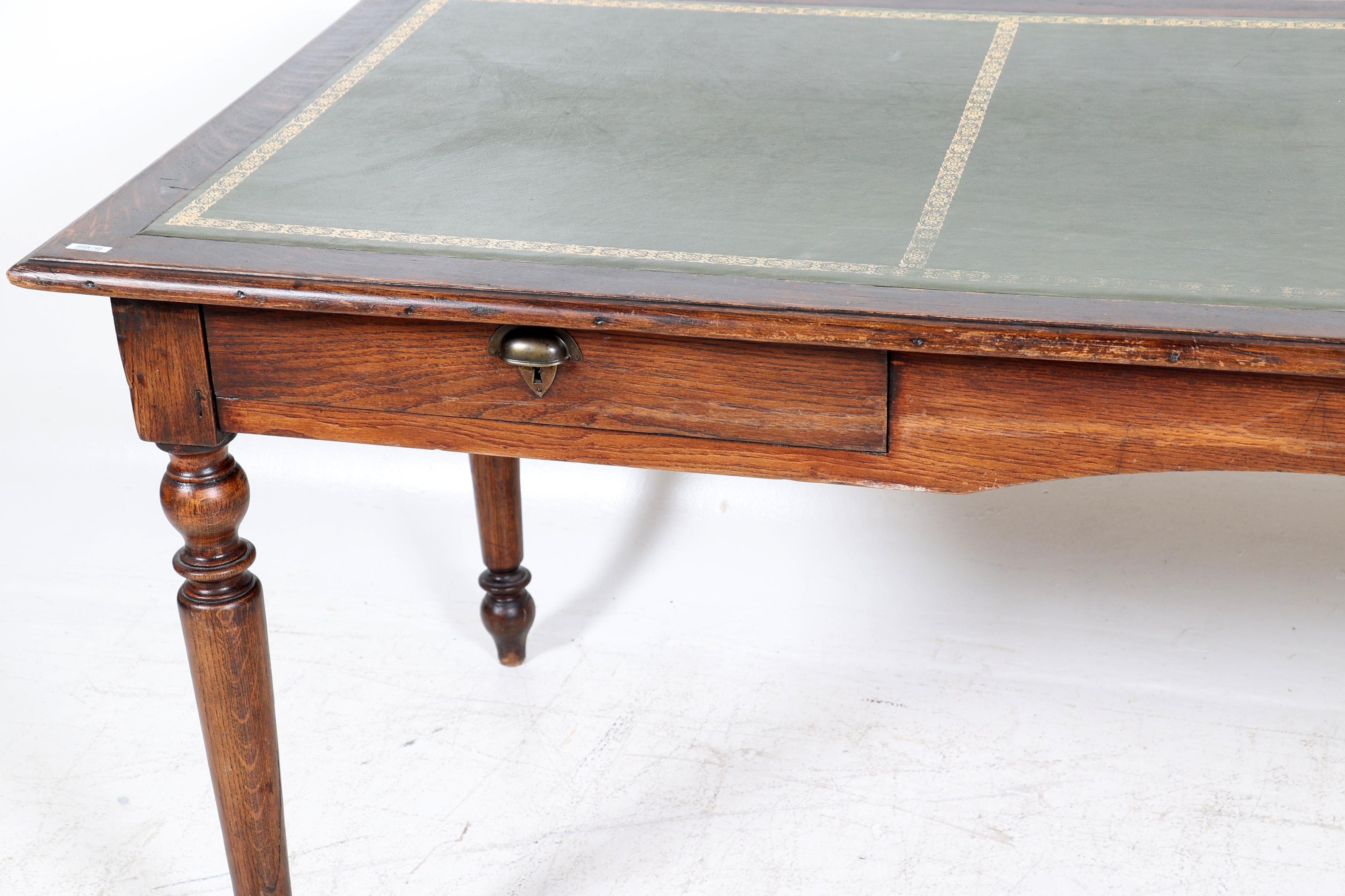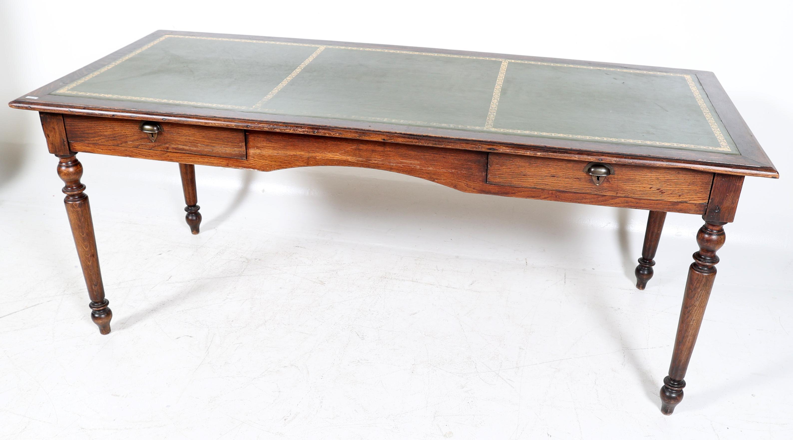 Antiek eikenhouten bureau met groen lederen blad en 2 laden, h.76 x b.184 x d.80 cm.