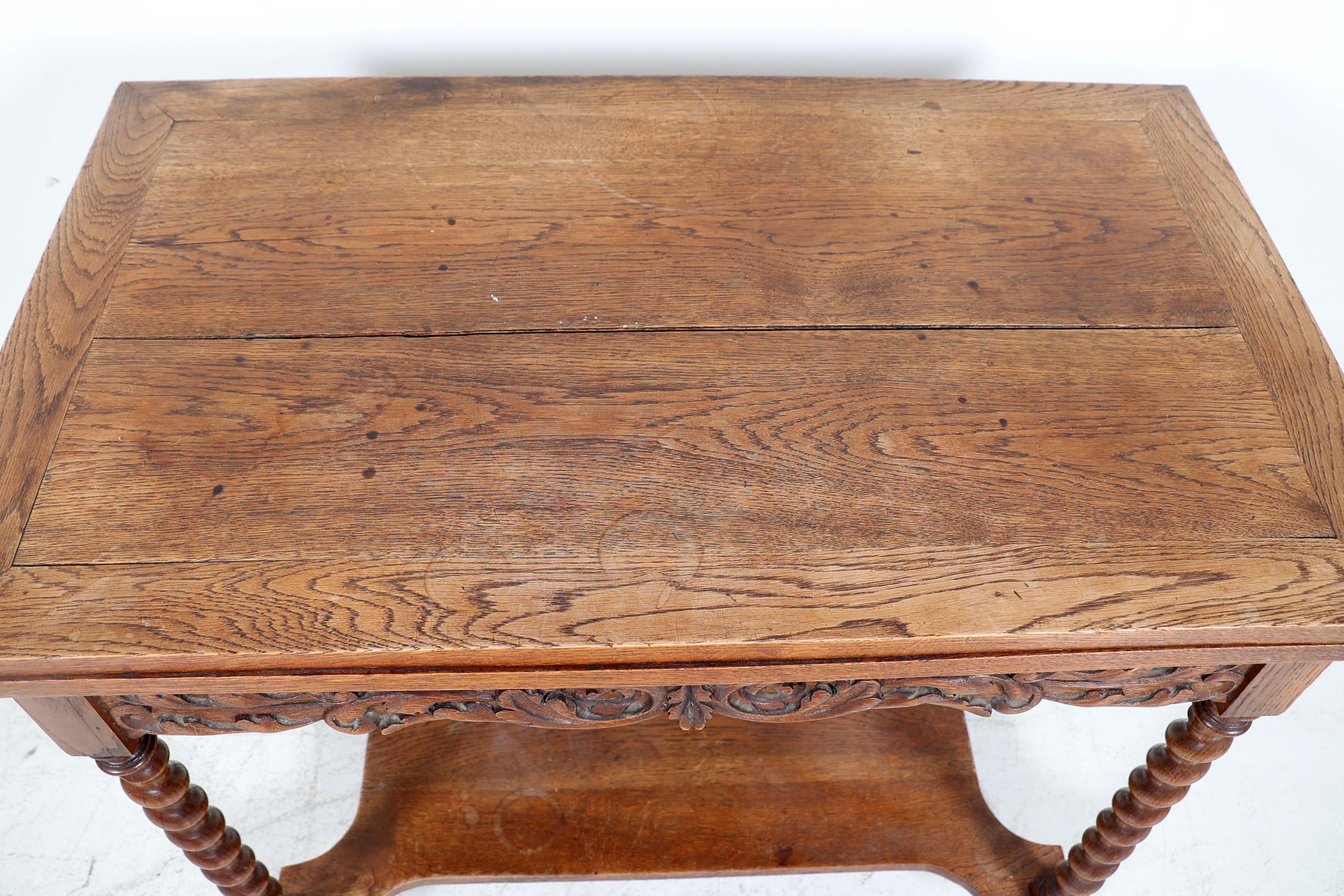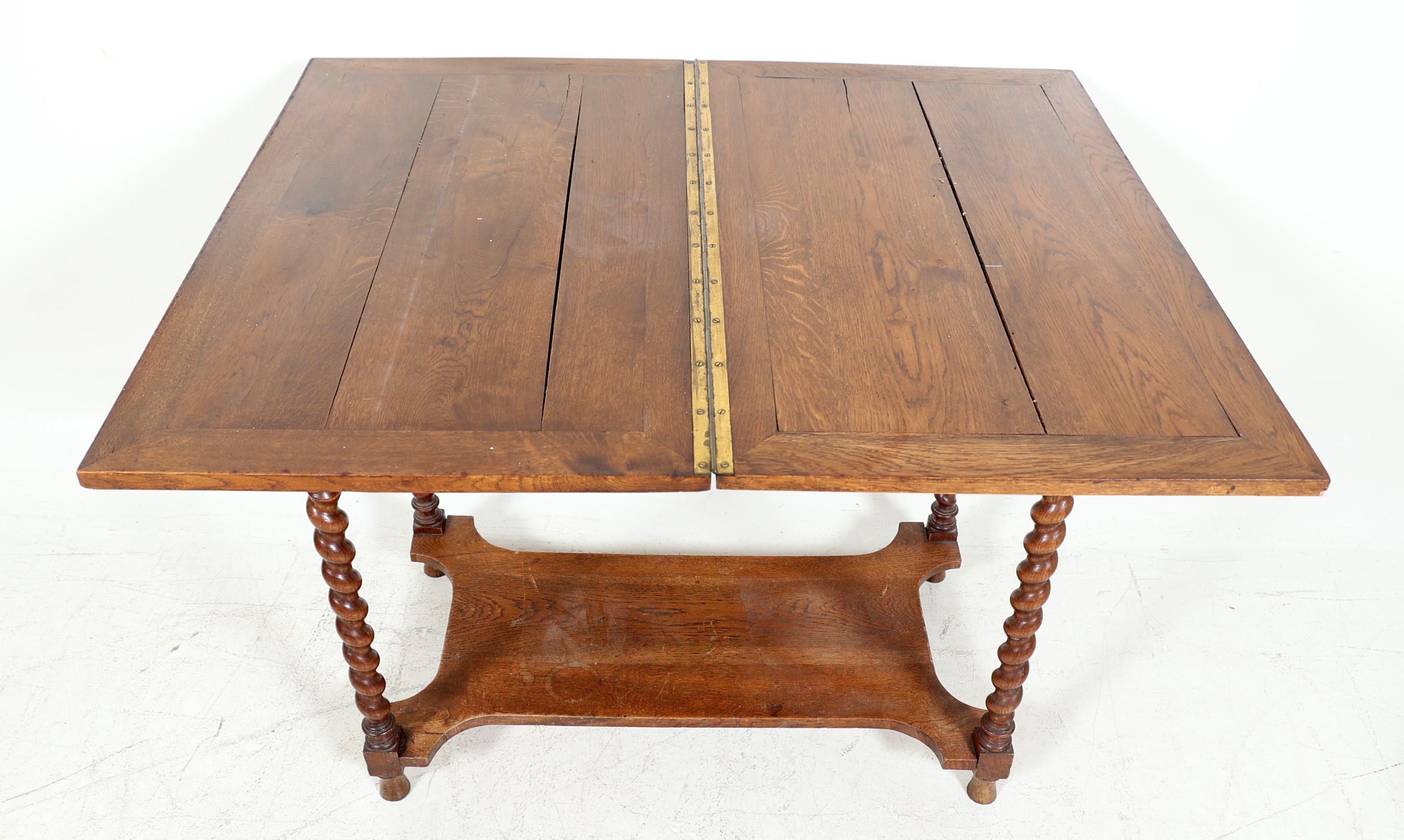 Eikenhouten bijzettafel met uitklapbaar blad, rustend op getorste poten, h.75 x b.87 x d.51 cm.