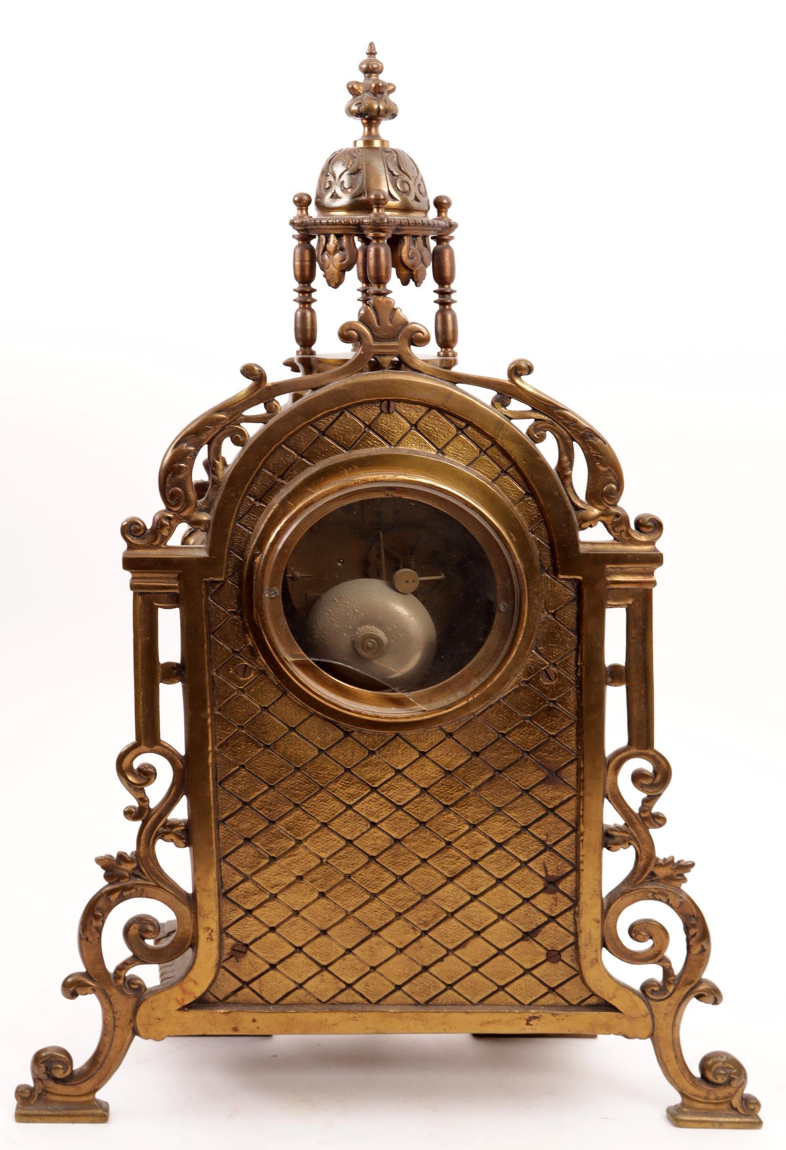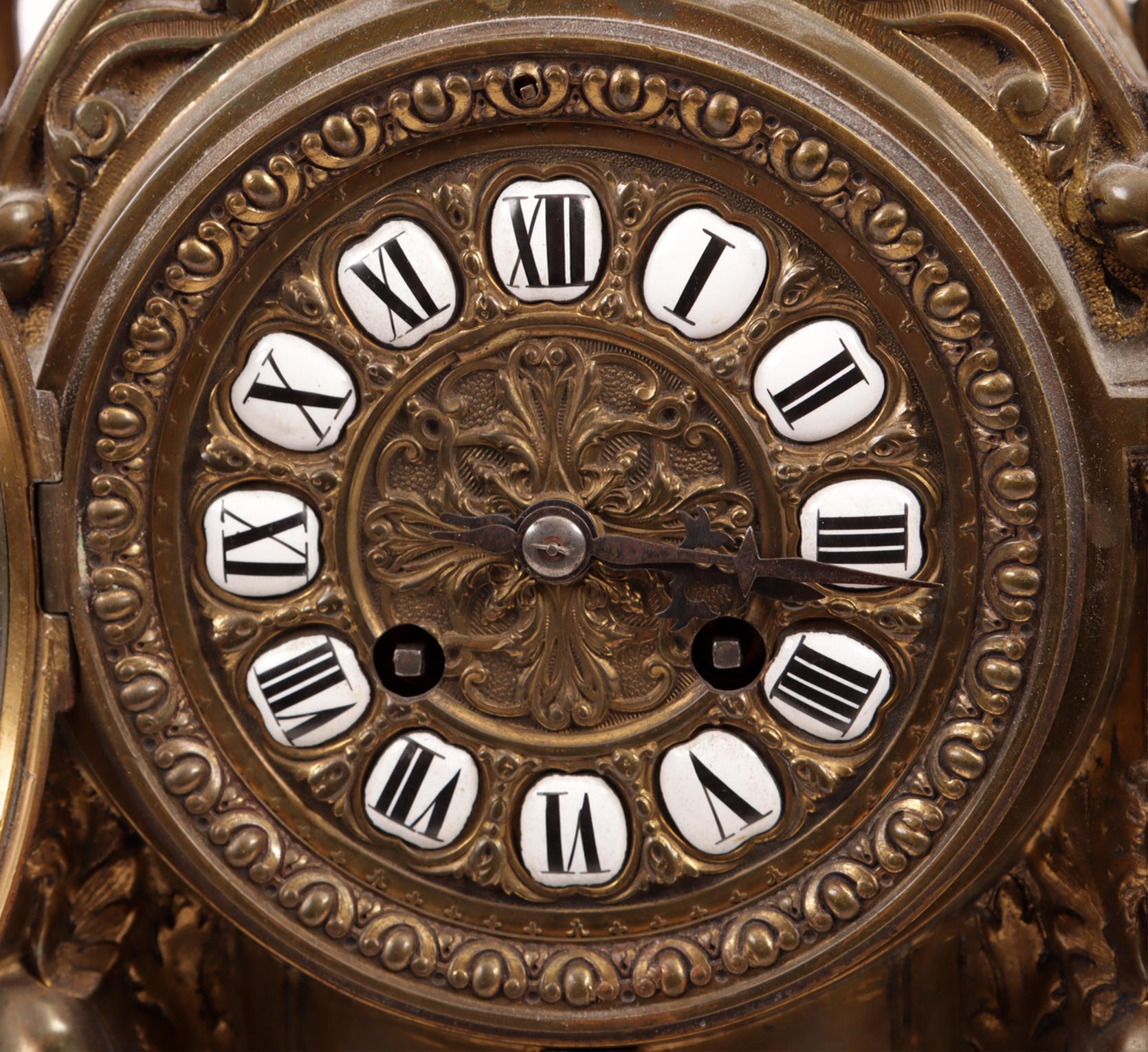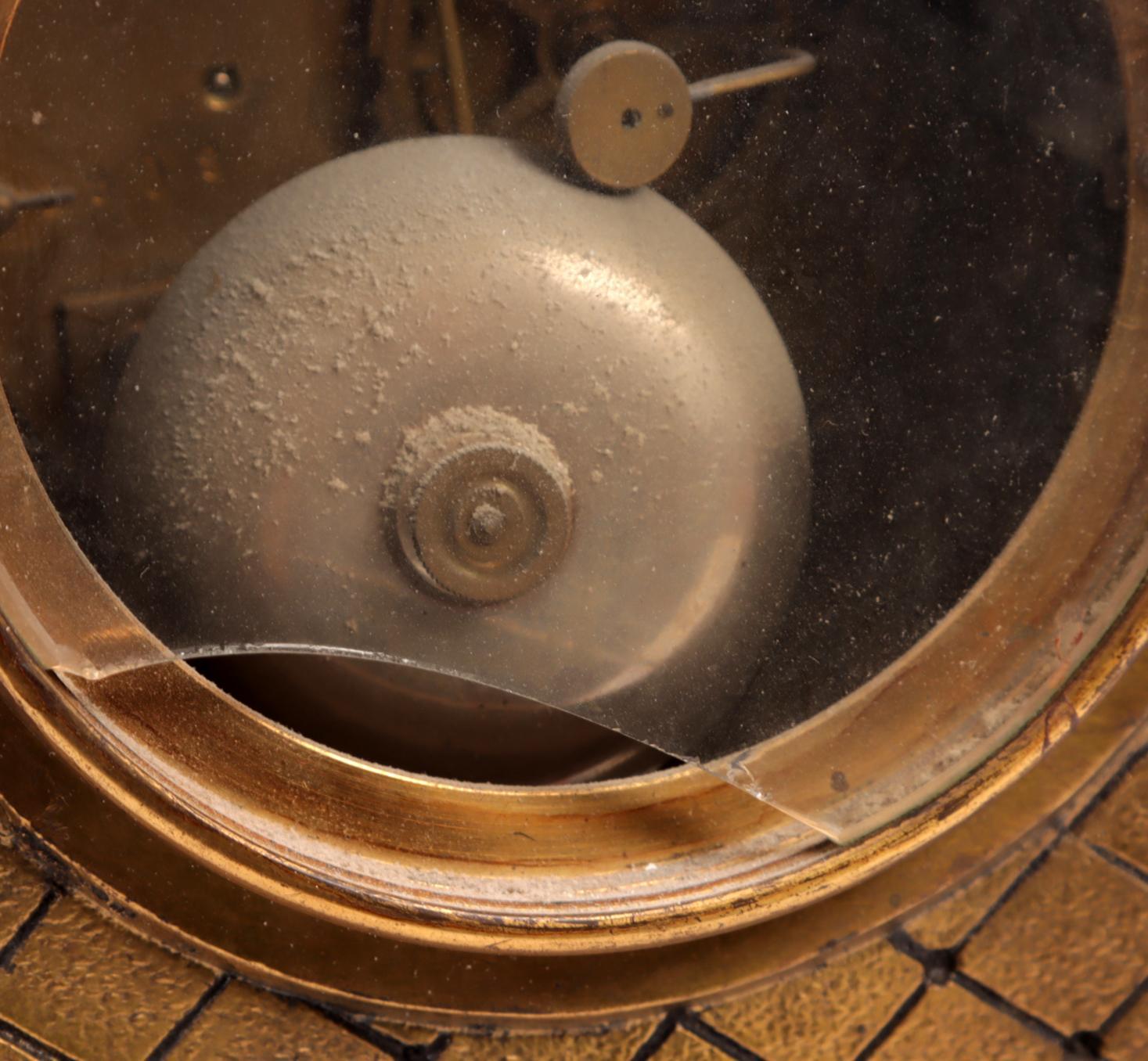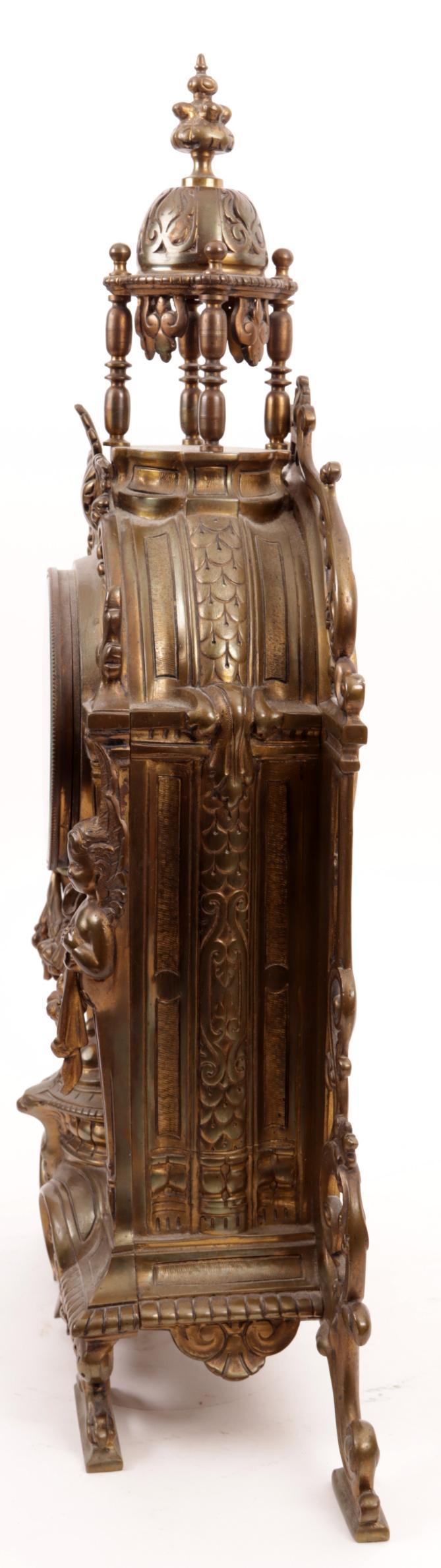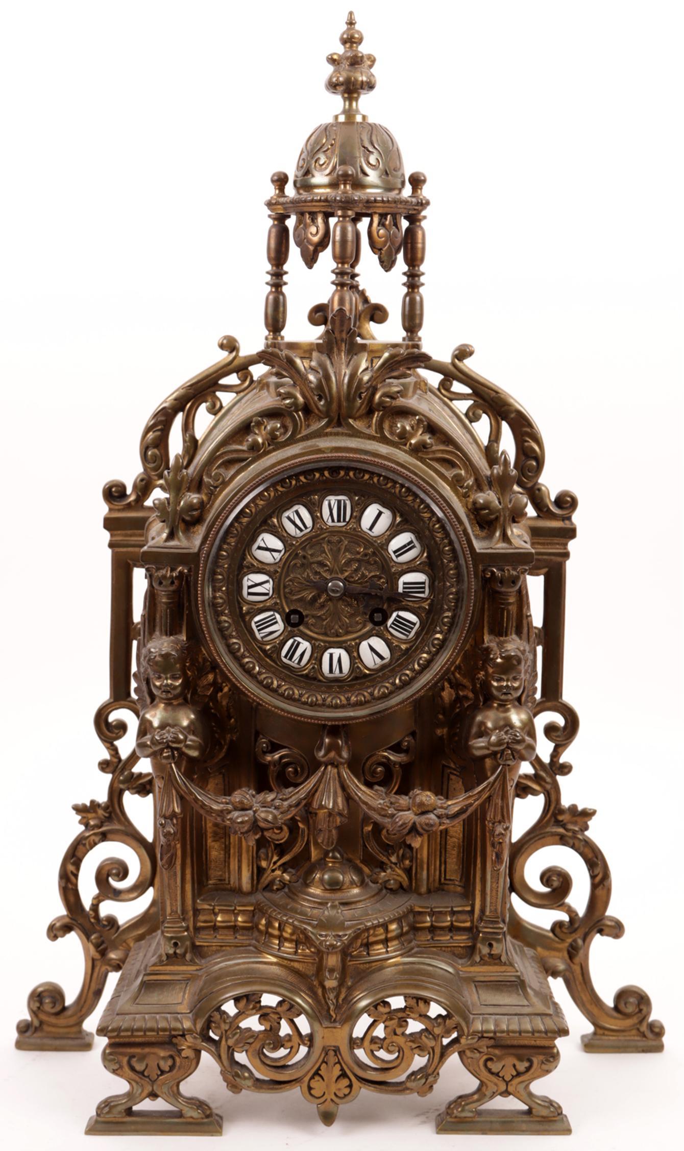 Oude koperen mantelklok, h.52 cm. (glas achterzijde defect)