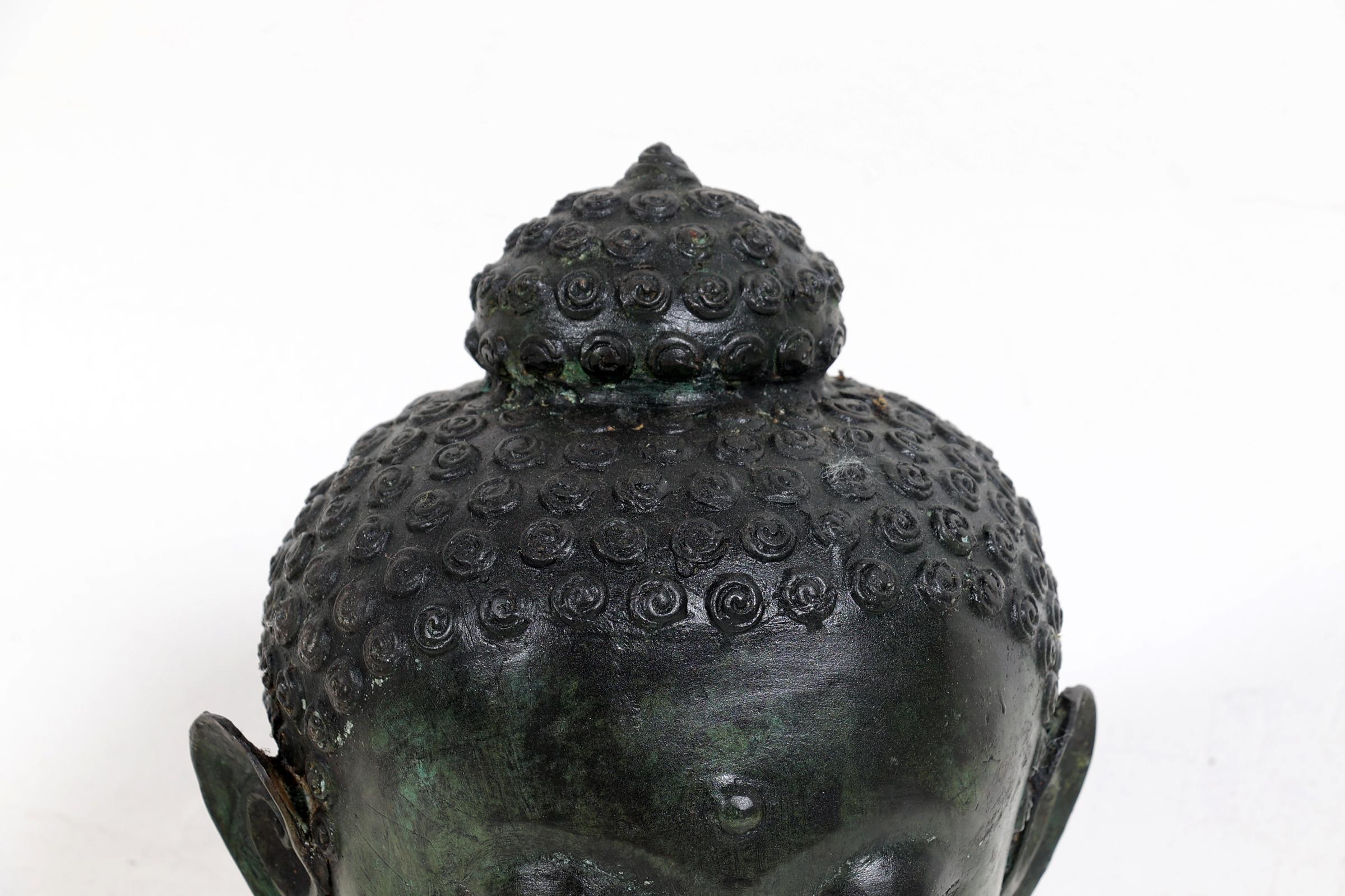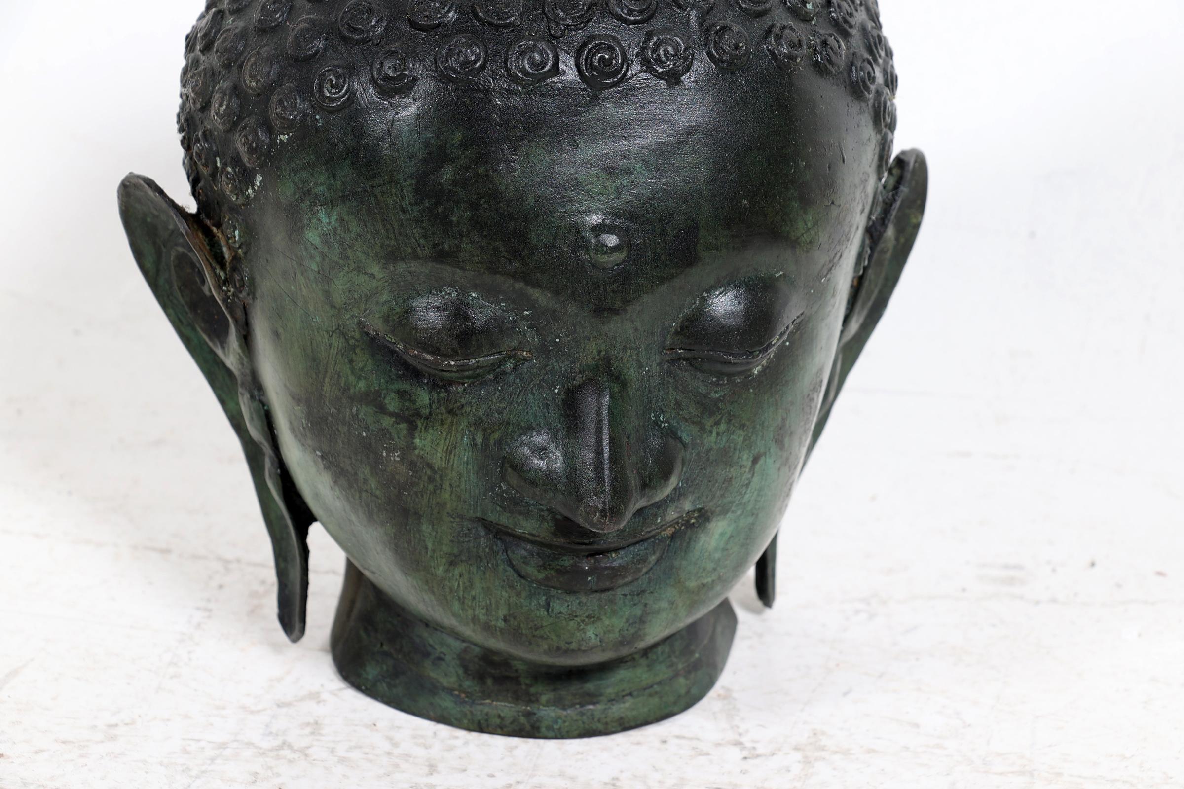 Groen gepatineerd bronzen Boeddha hoofd, h.26 cm.