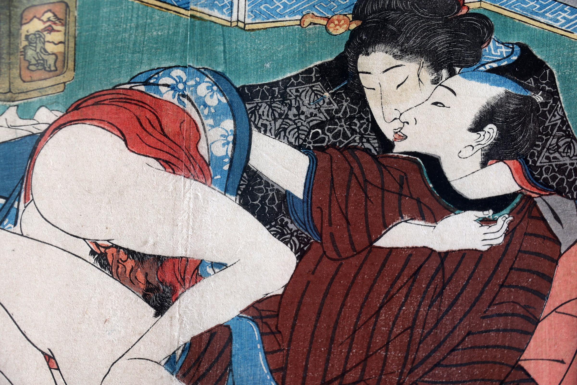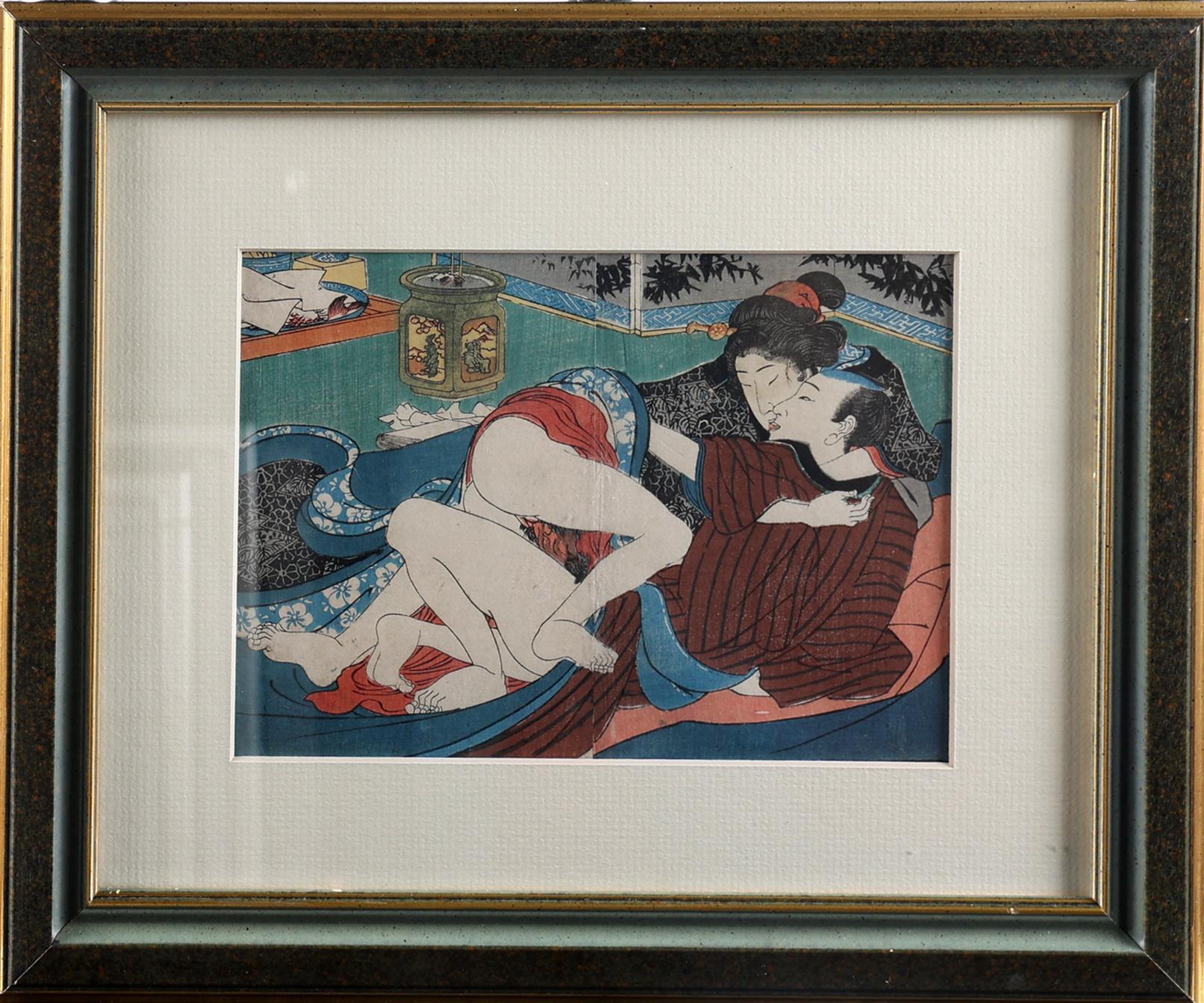 Kuniyoshi, Erotische voorstelling van man en vrouw, houtsnede, 15 x 21 cm.