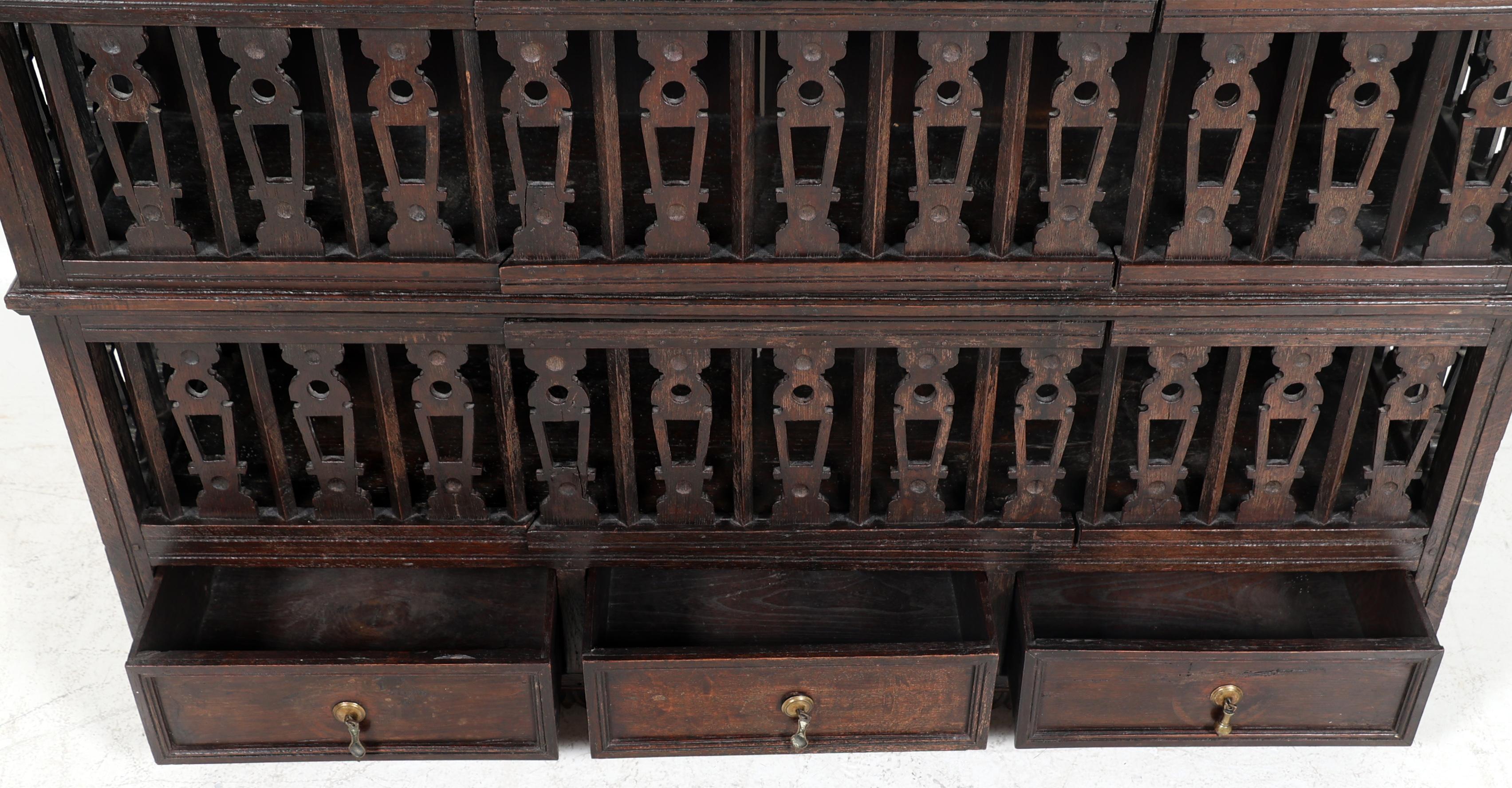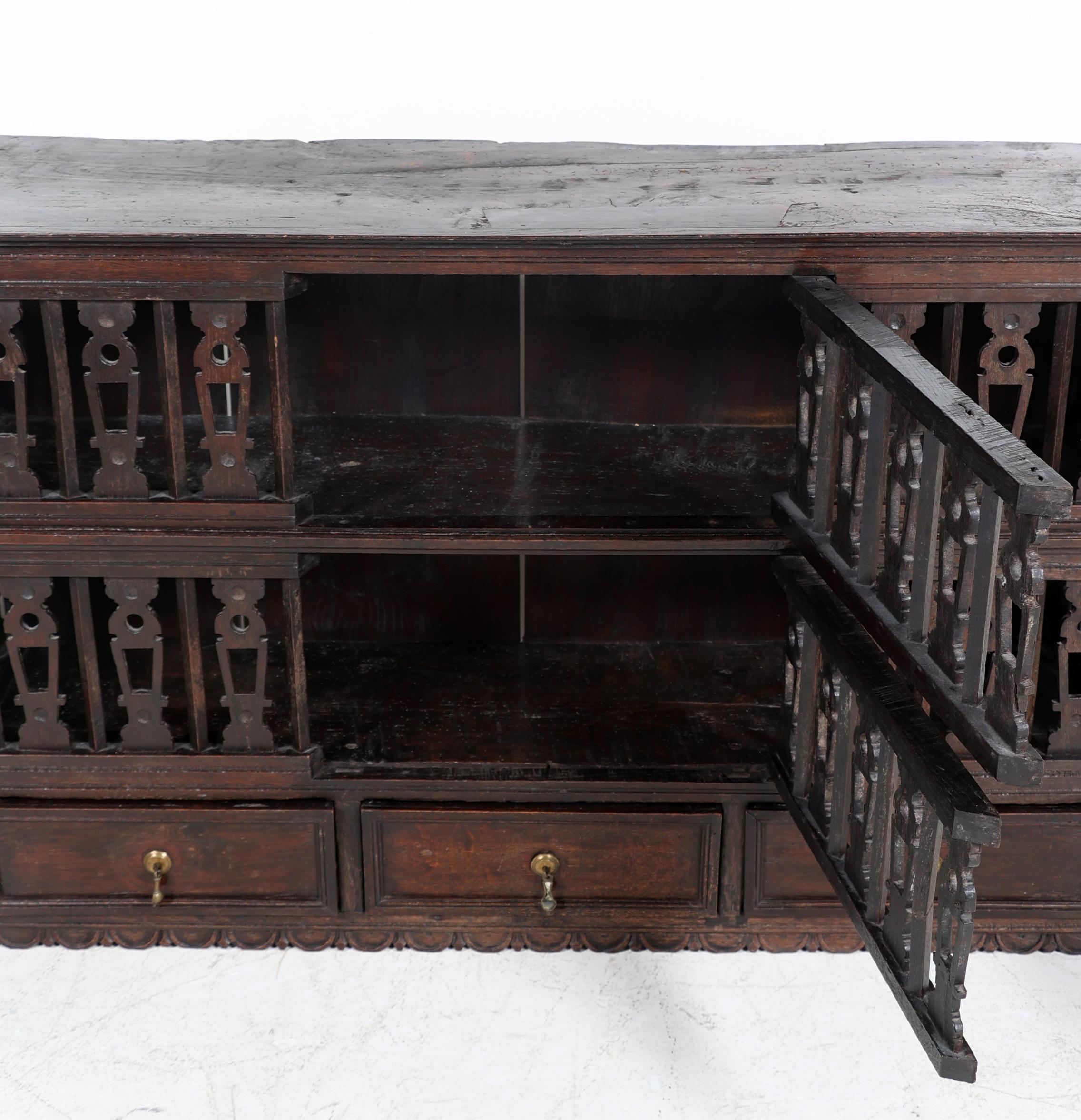 Antieke eienhouten wand/kaaskast met opengewerkte zijkanten en voorkant, h.76 x b.122 x d.32 cm.