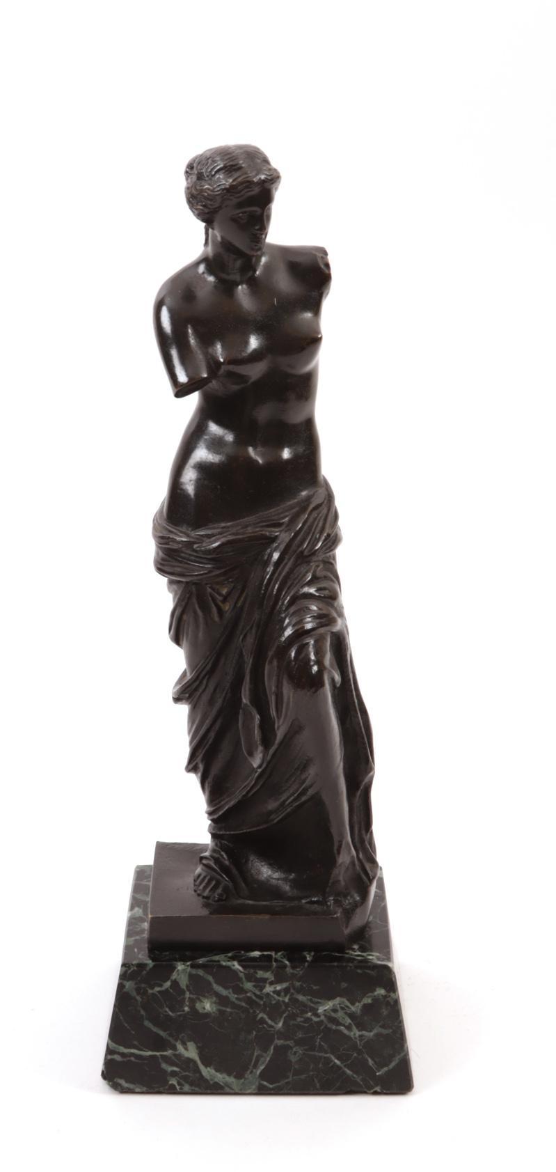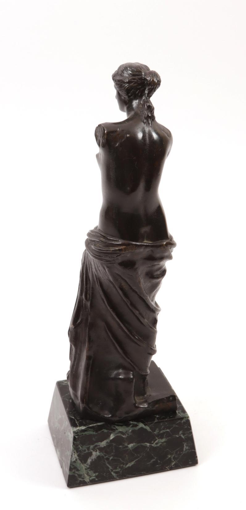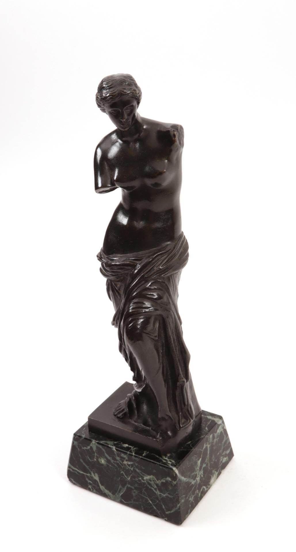 Bronzen sculptuur van de 'Venus de Milo' op groen marmeren voetstuk, gemerkt op achterzijde Ernst Kraas, h.30 cm.