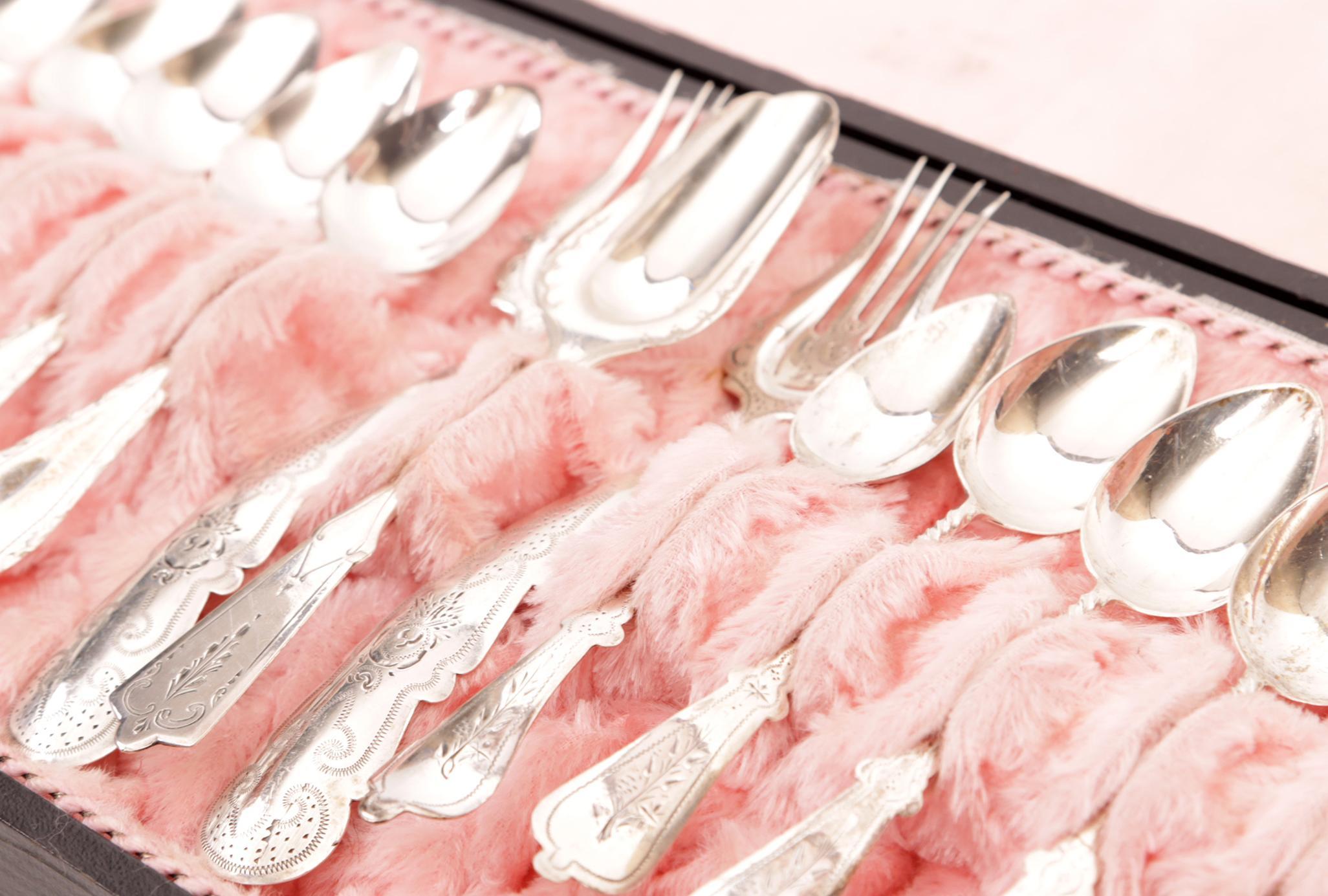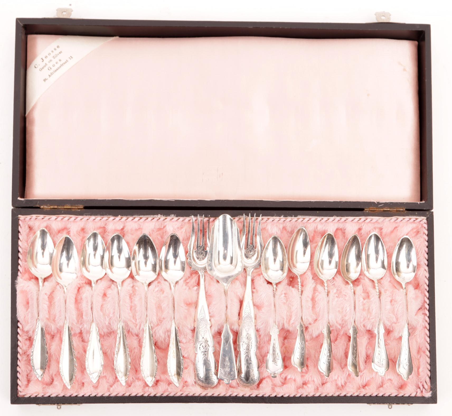 12 Diverse zilveren lepeltjes, suikerschepje en 2 vorkjes in etui