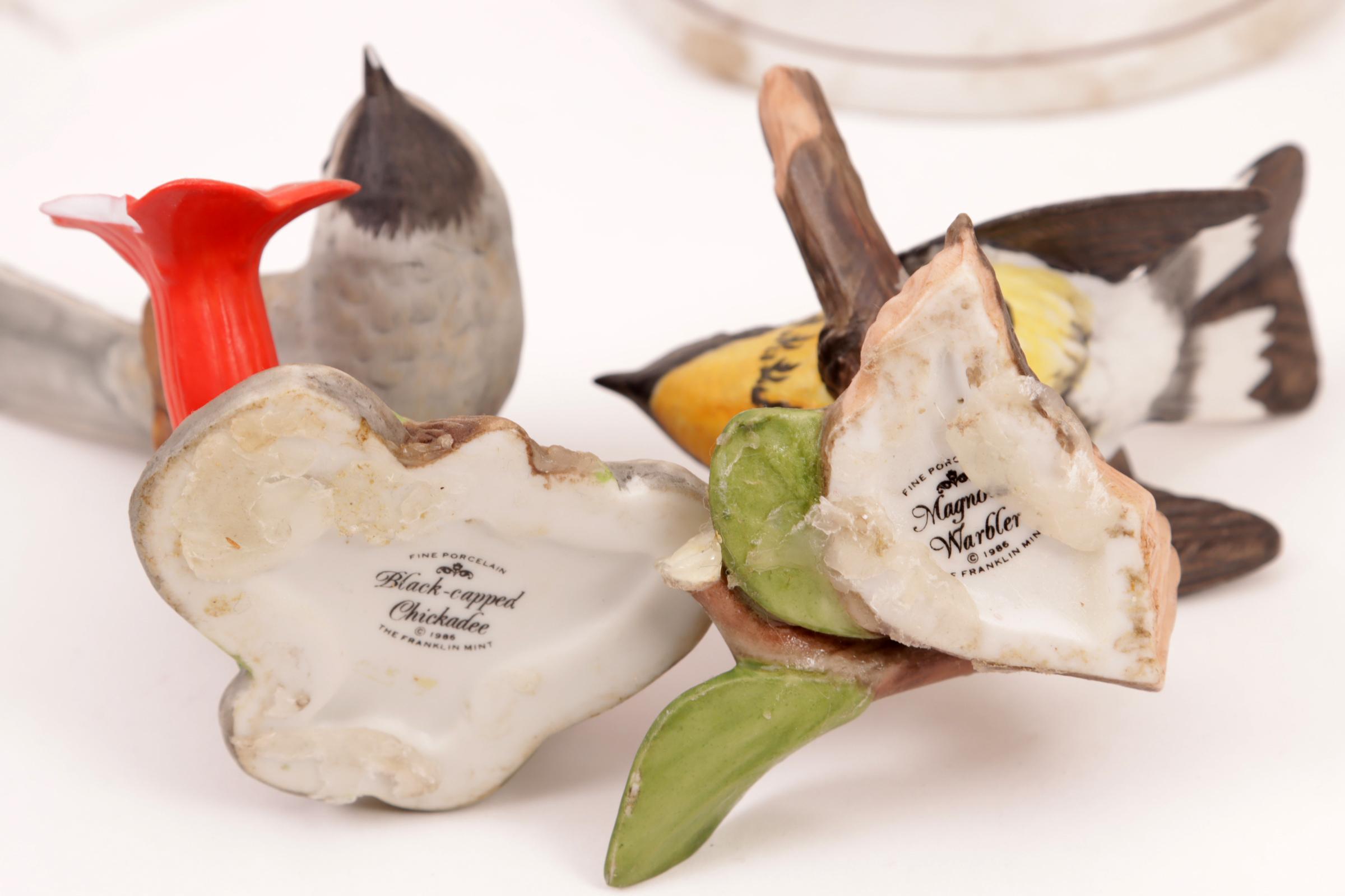 Akita, 2 wit porseleinen duiven en diverse porseleinen vogels