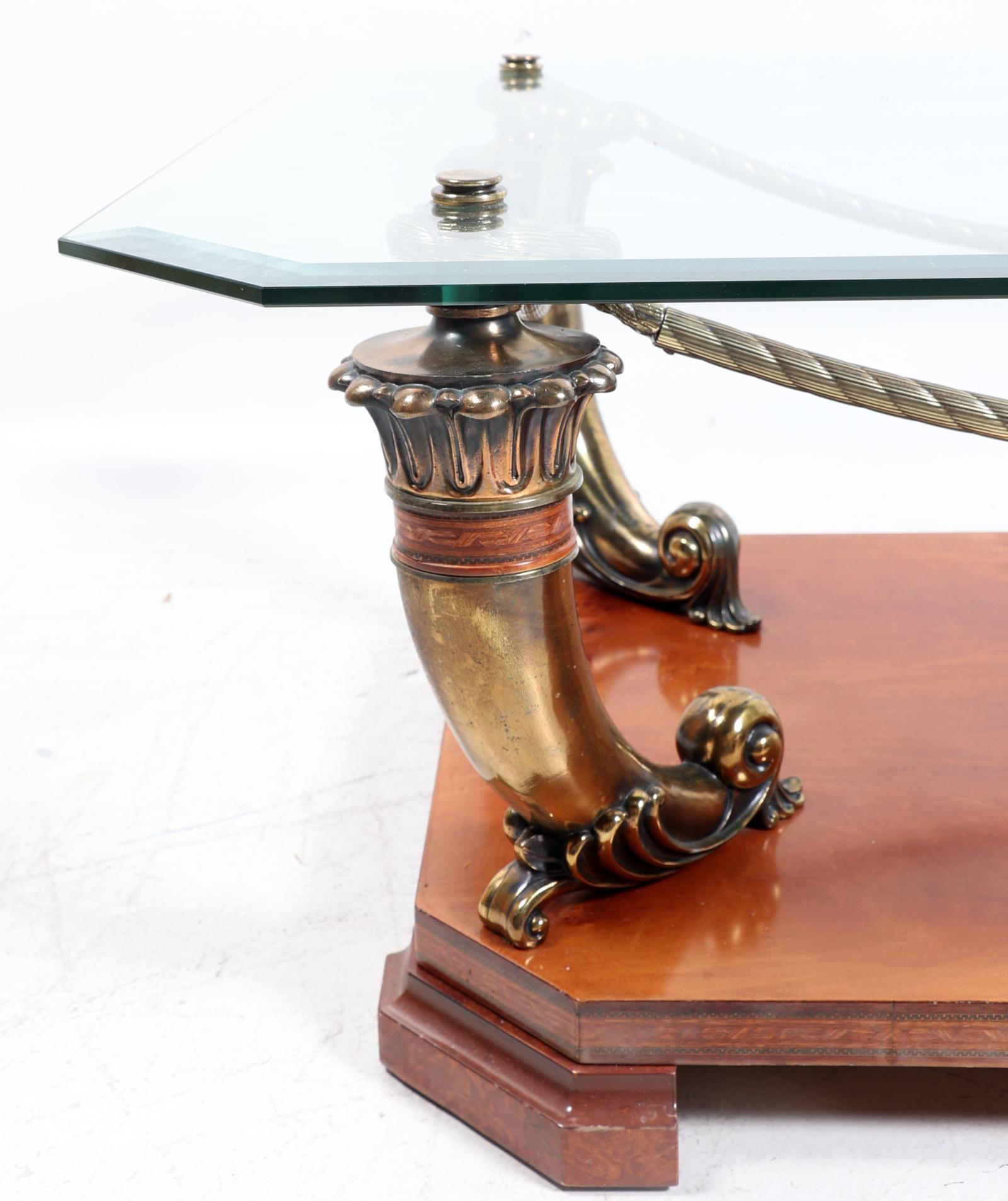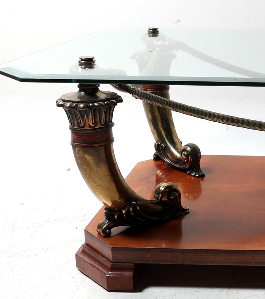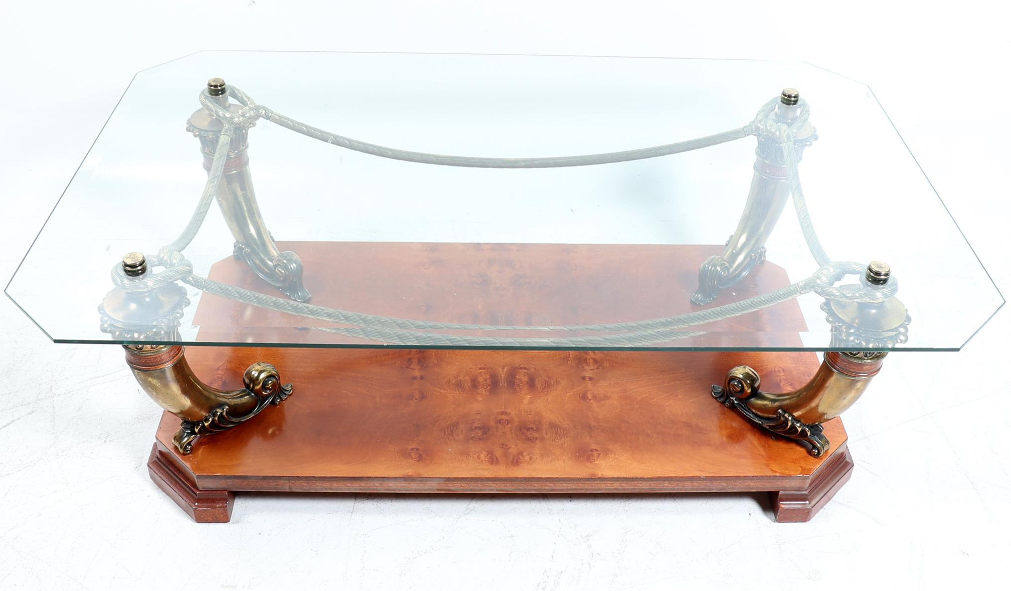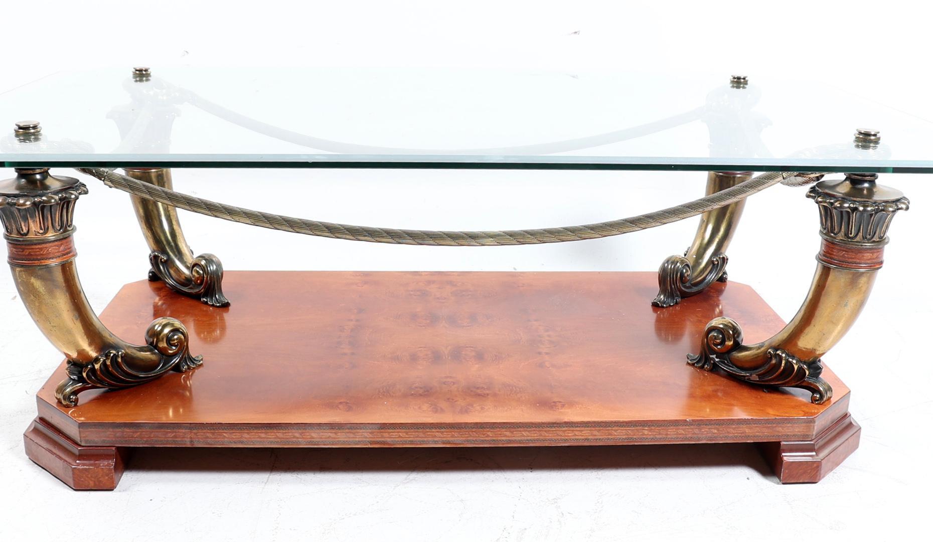 Notenhouten met koperen salontafel afgedekt met een glasplaat h.47 x b.140 x d.90 cm.