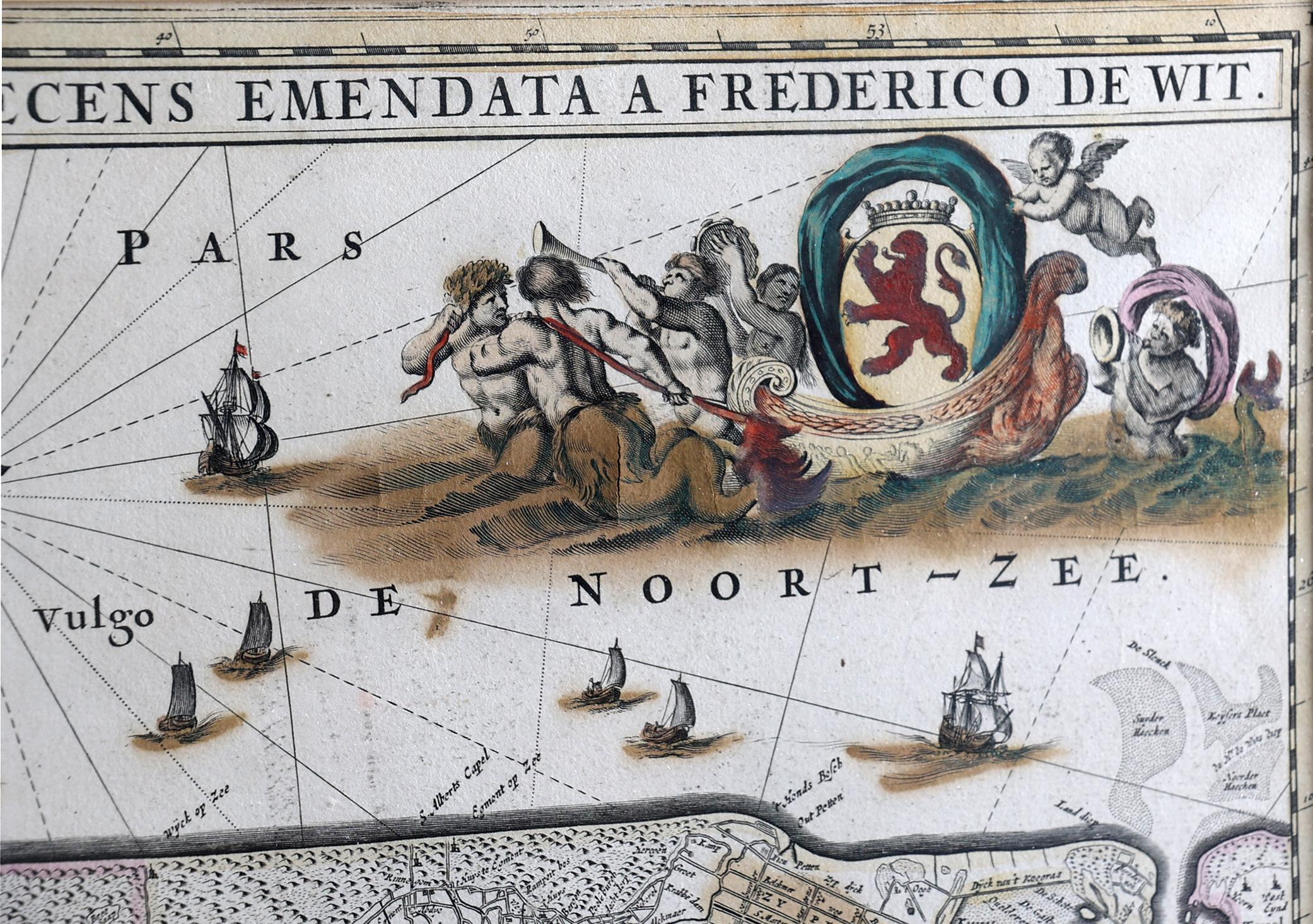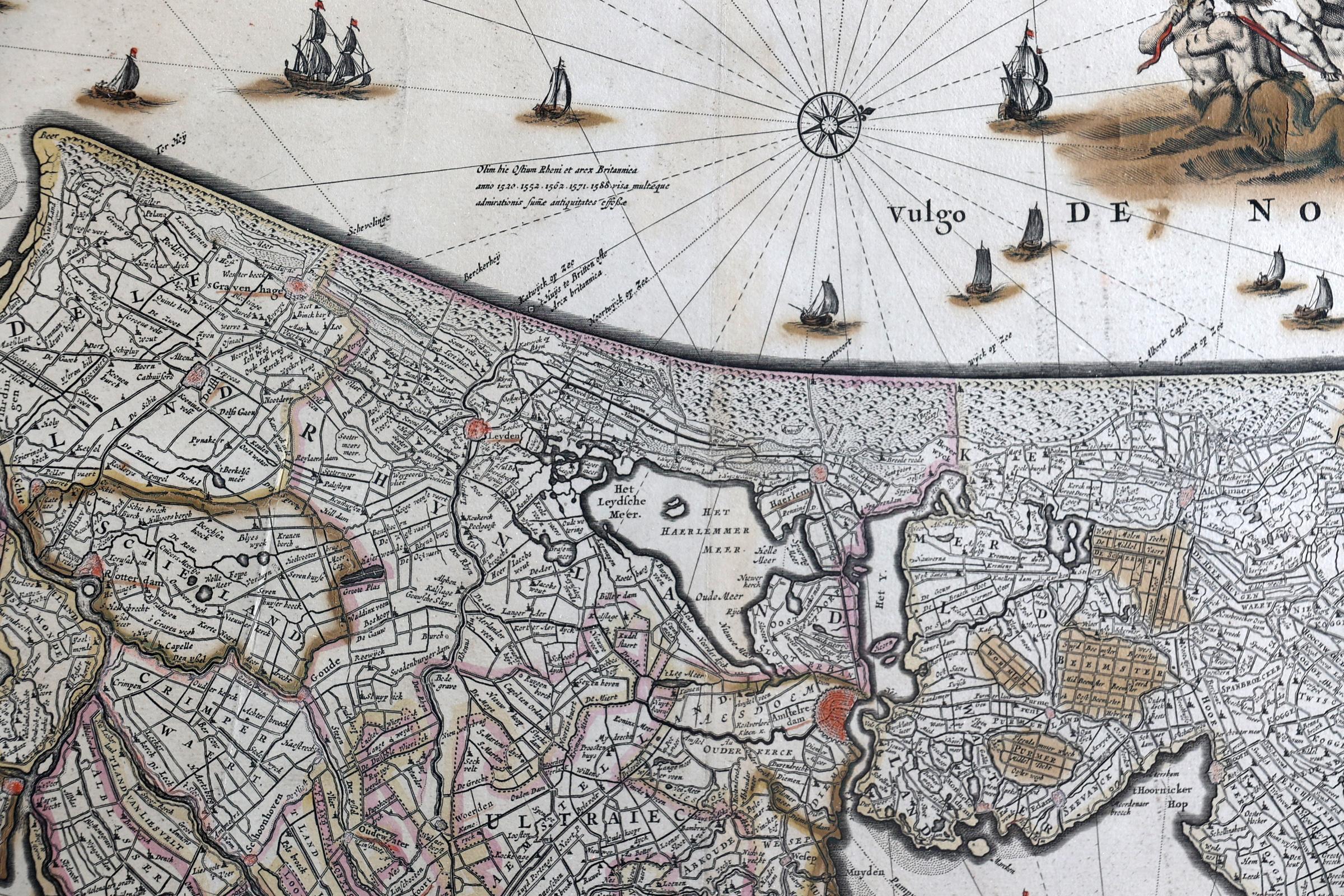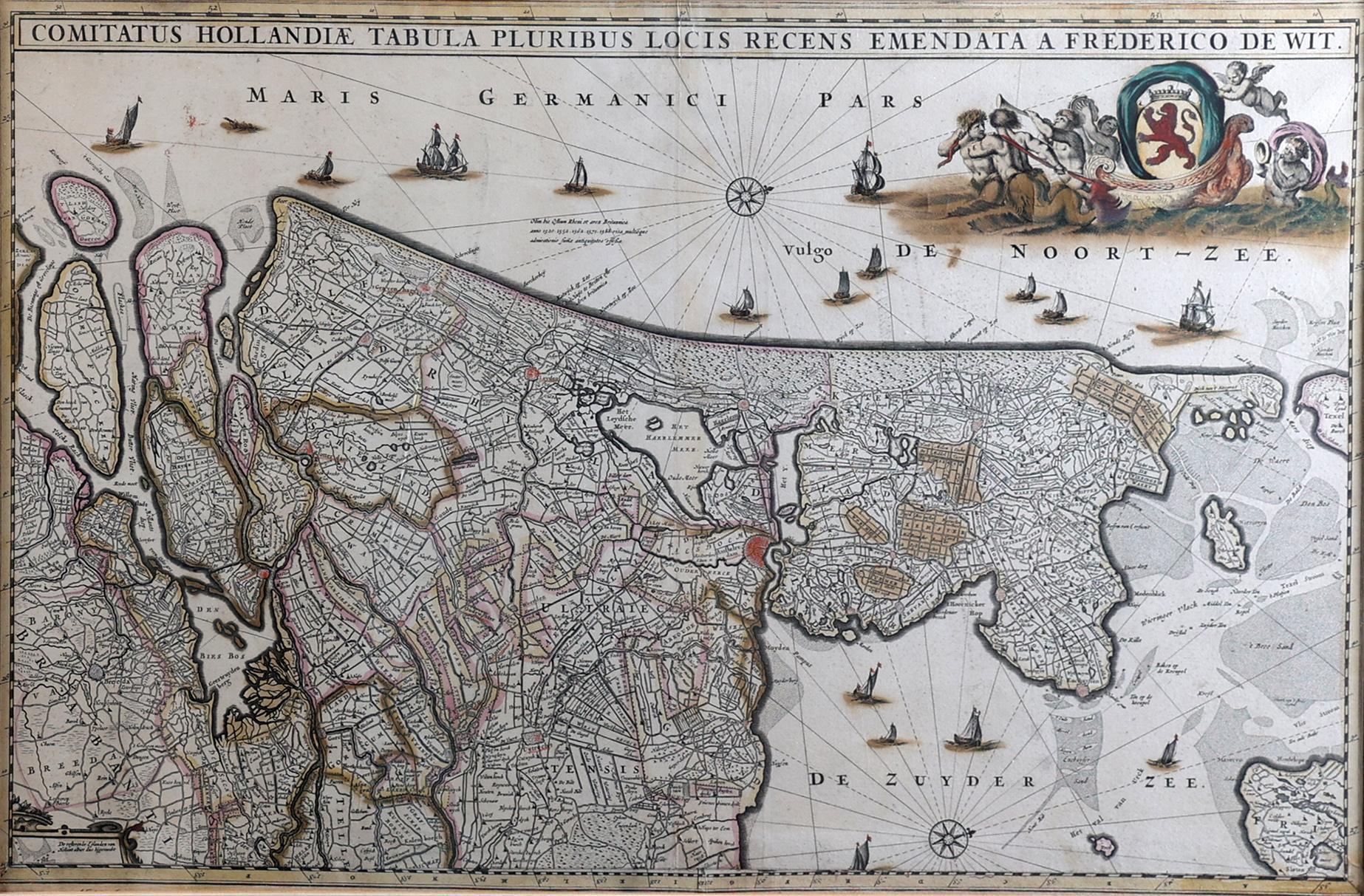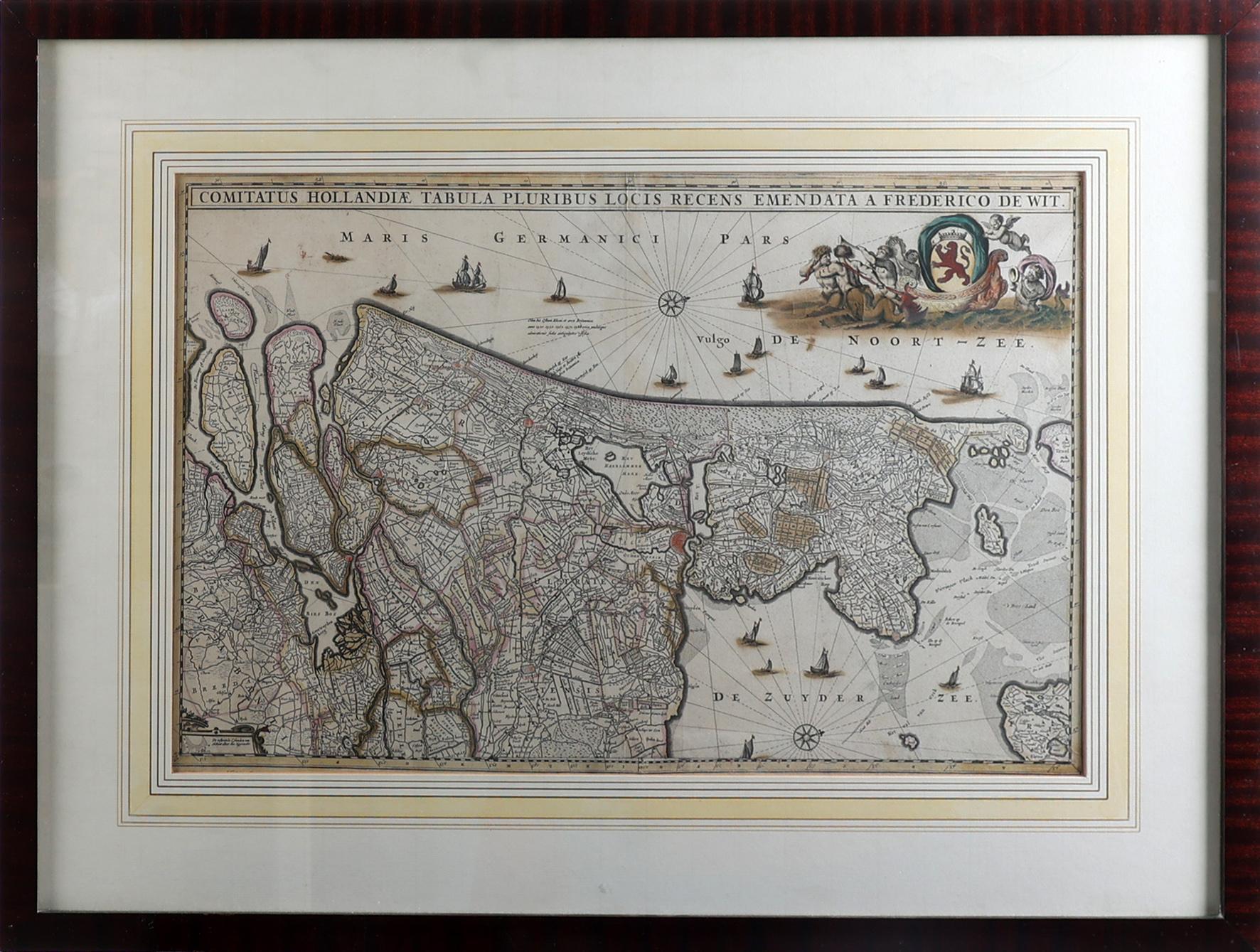 F. de Wit, circa 1680, ingekleurde antieke landkaart van Nederland 'Comitatus Hollandiae Tabula Pluribus Locis Recens Emendata A Frederico De Wit', 37 x 56 cm.