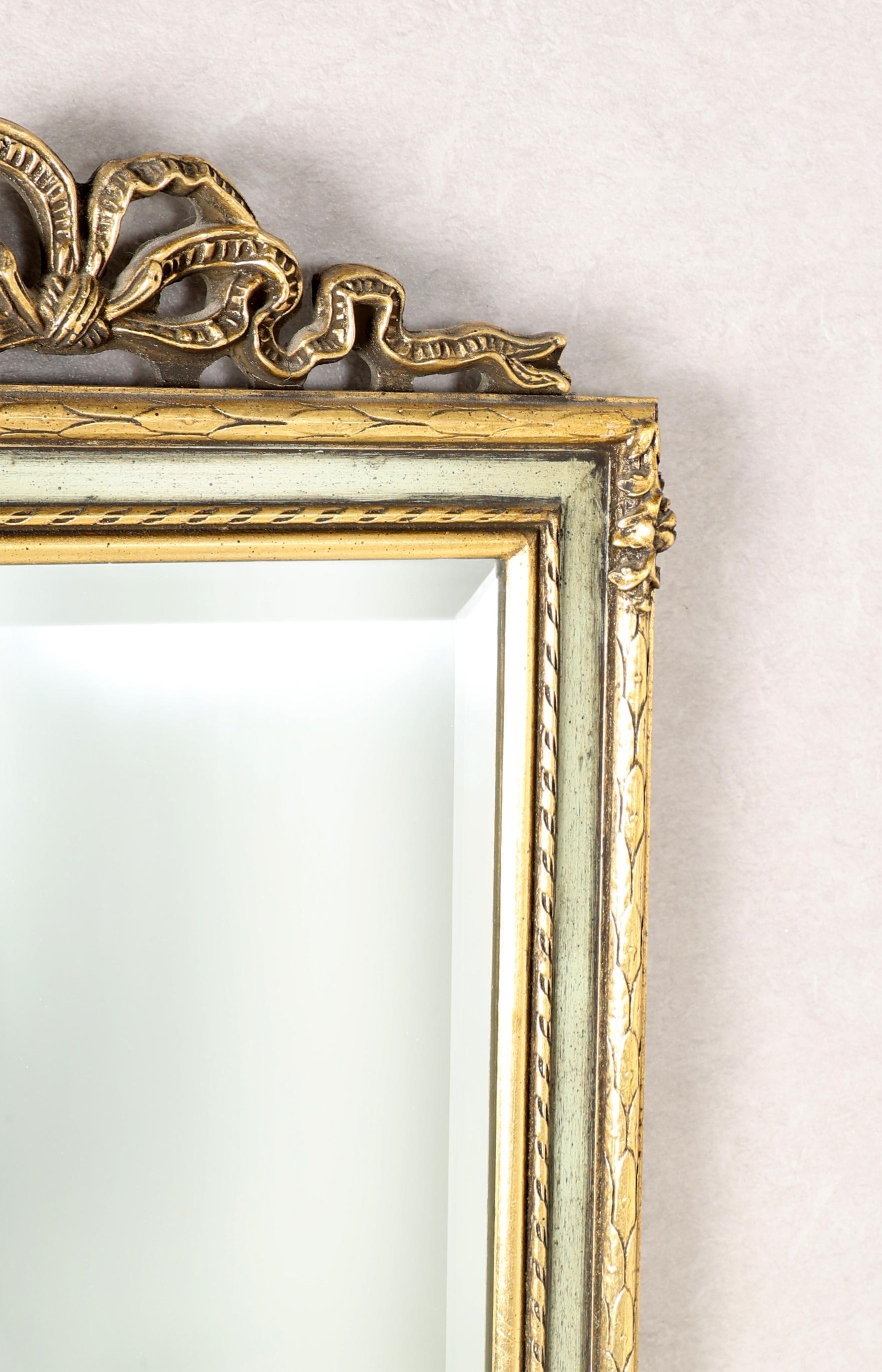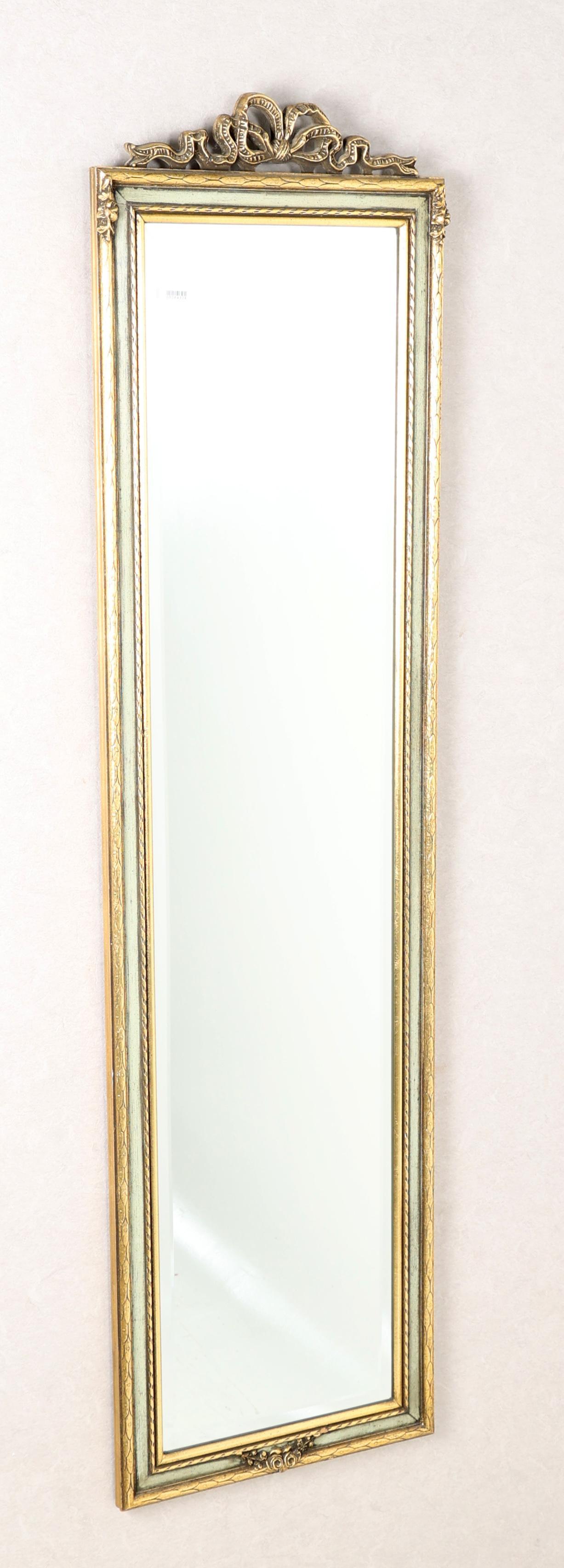 Geslepen spiegel in opengewerkte kuif/striklijst, h.136 x b.36 cm.