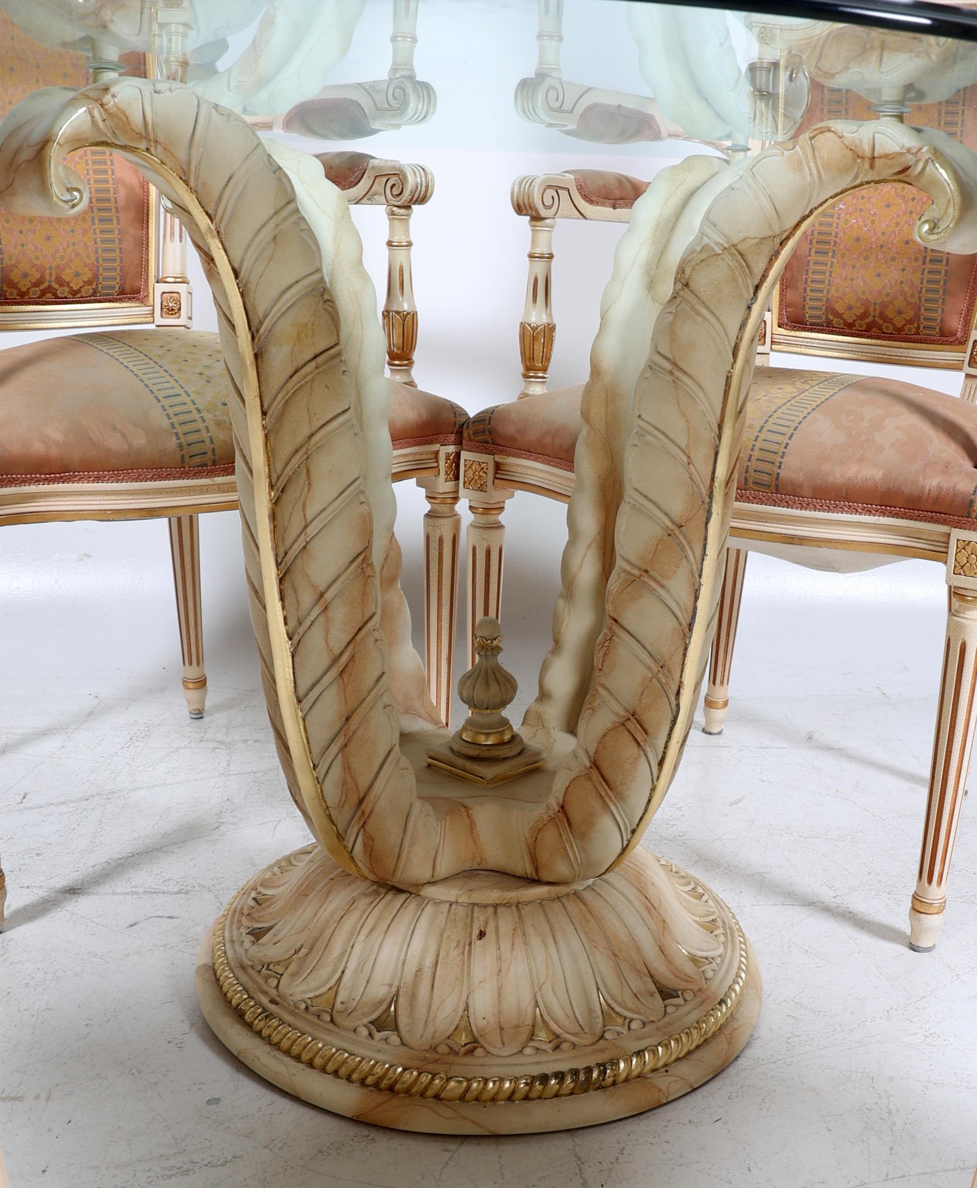 Goud met lakékleurige eetkamertafel afgedekt met geslepen glasplaat, h.82 x diam.110 cm. met 4 bijpassende lakékleurige stoelen met twee verschillende soorten bekleding