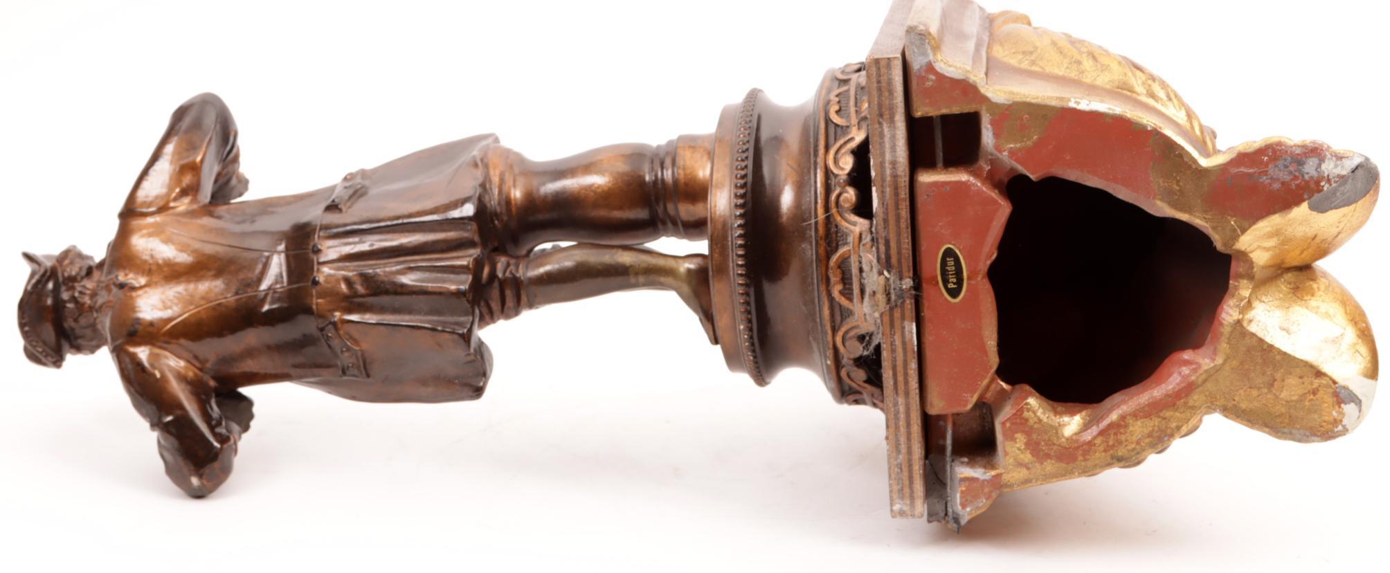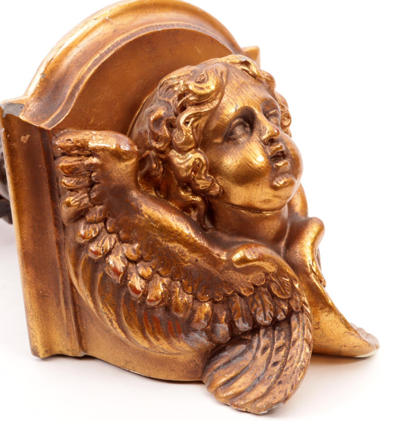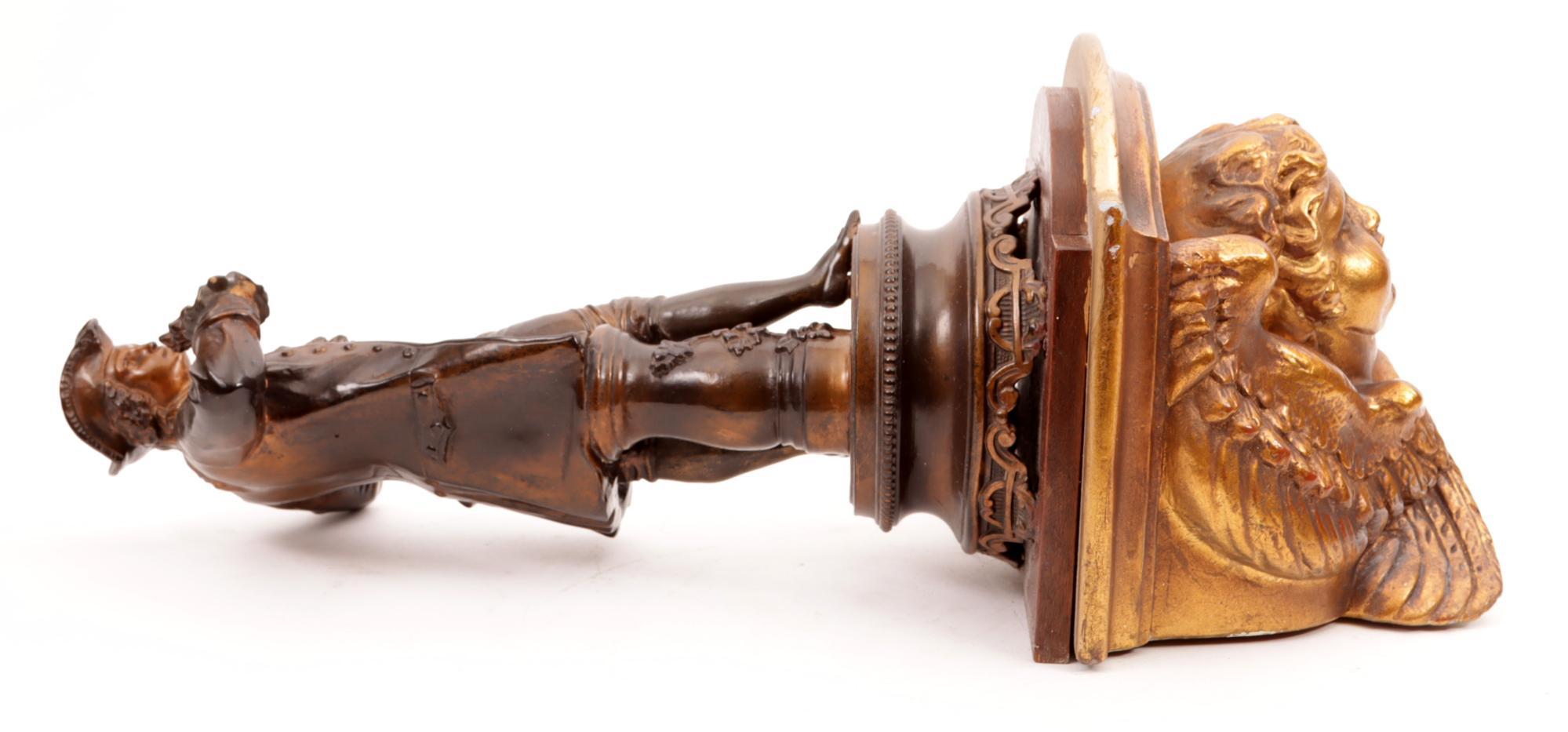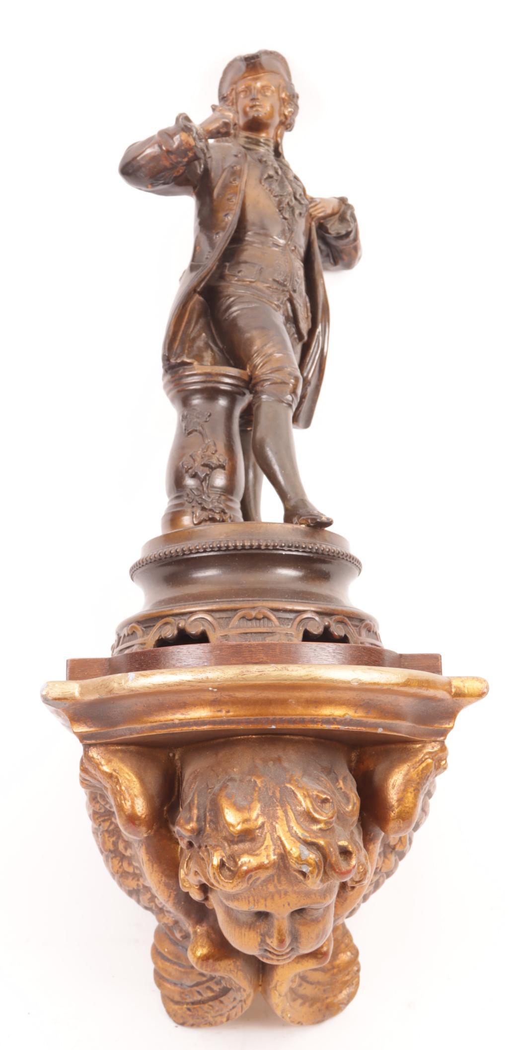 Goudkleurige muurconsole i.v.v. een engel met bronskleurig legering beeld van een edelman, h.63 cm.