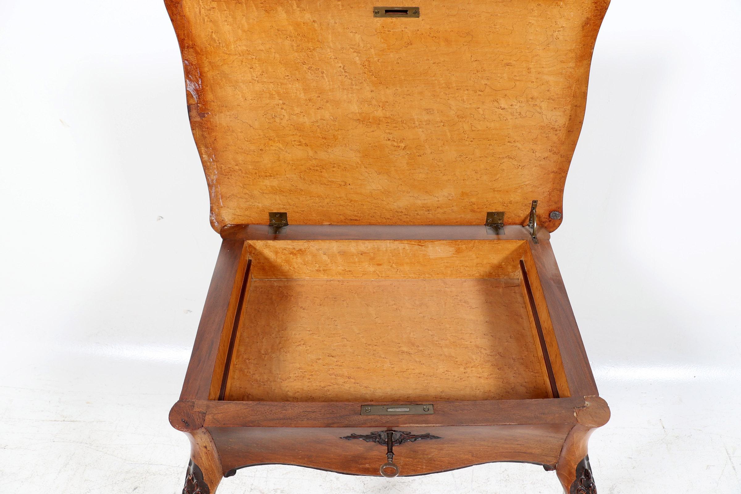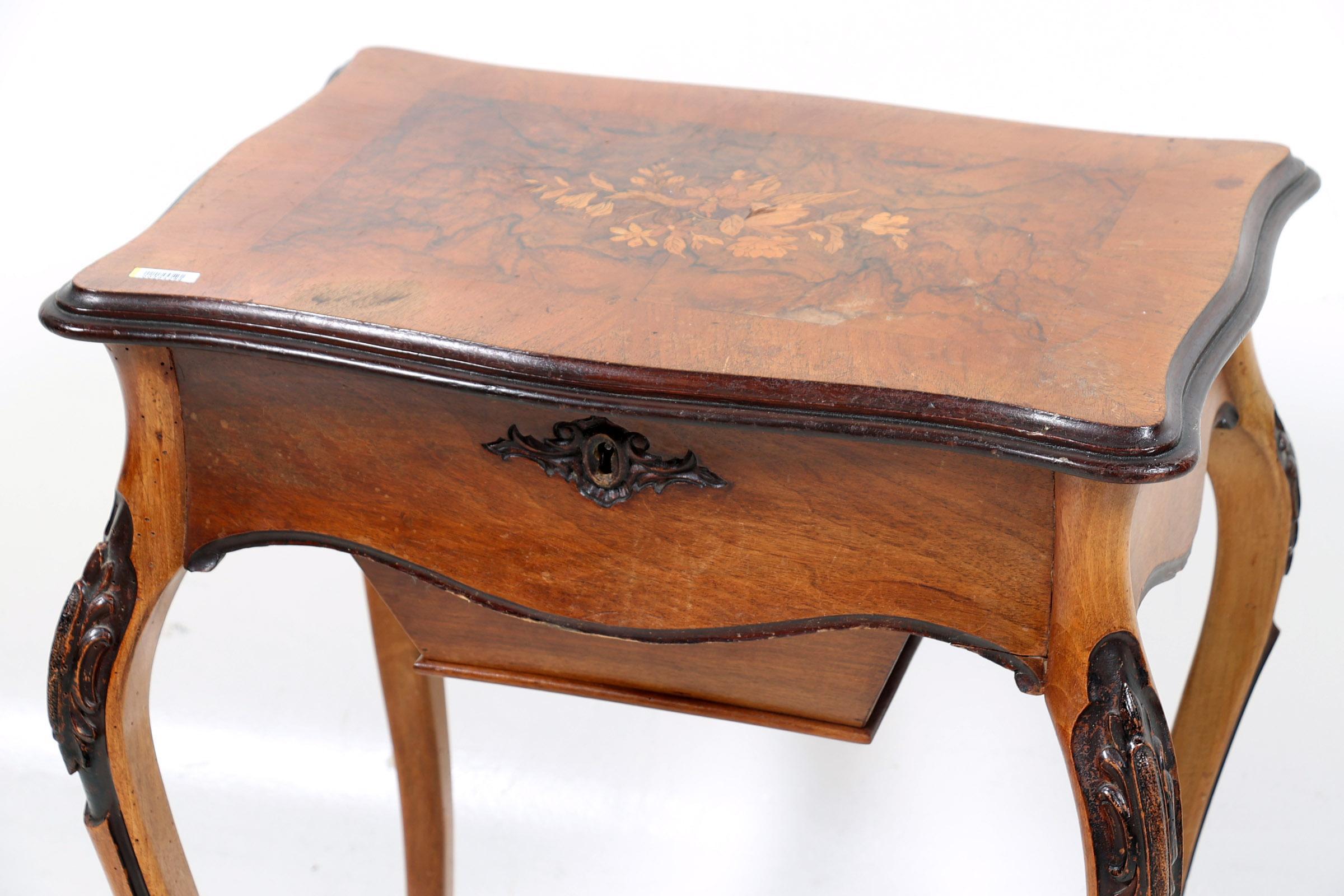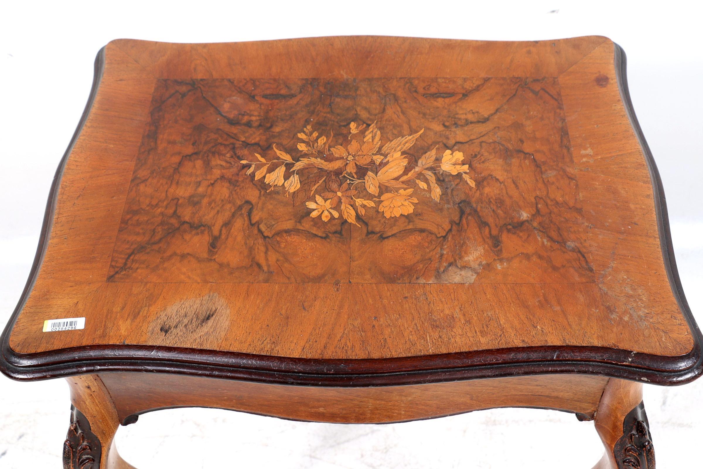 Met diverse houtsoorten ingelegde noten met wortelnotenhouten werktafel, h.73 x b.55 x d.40 cm.