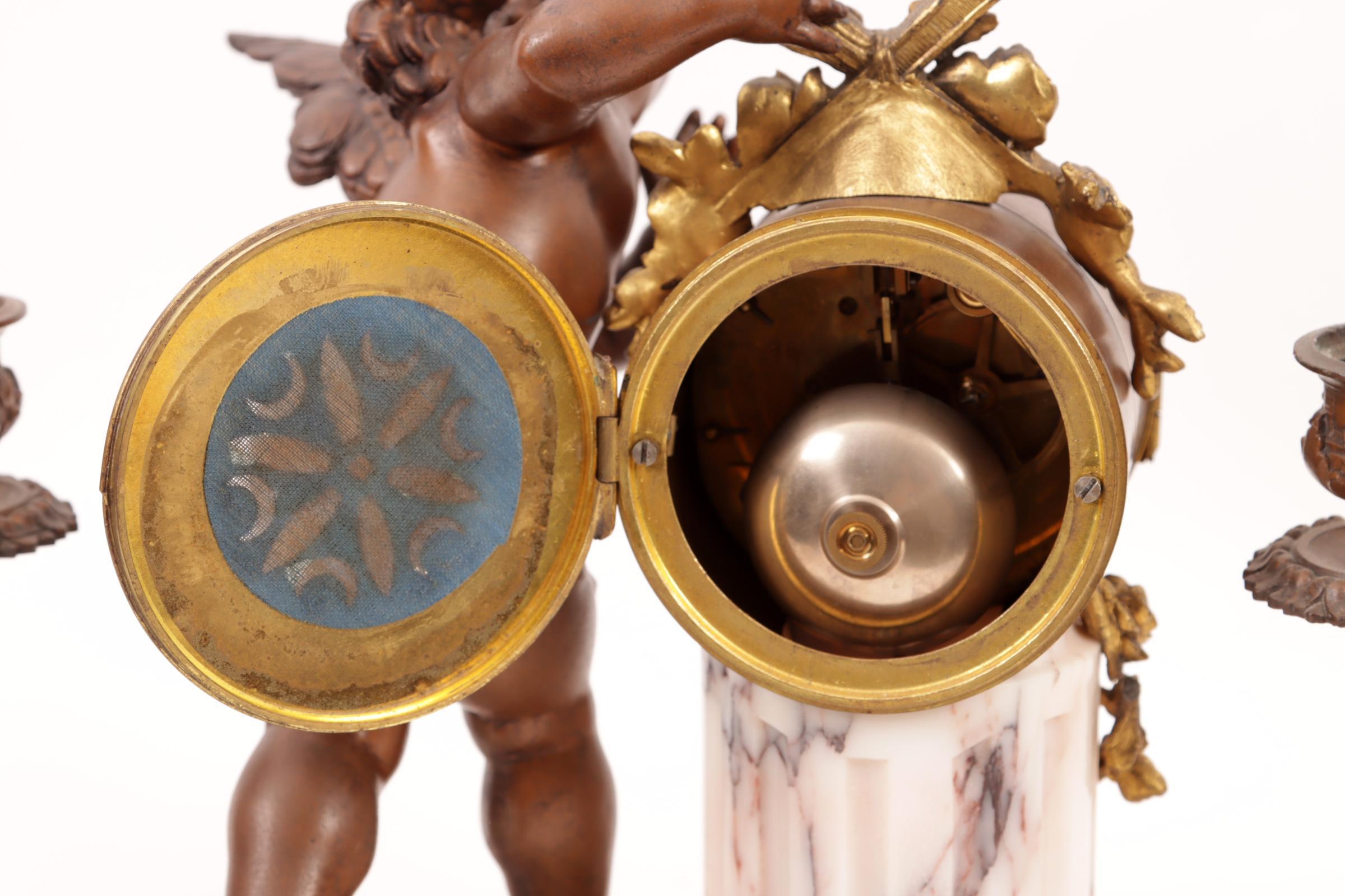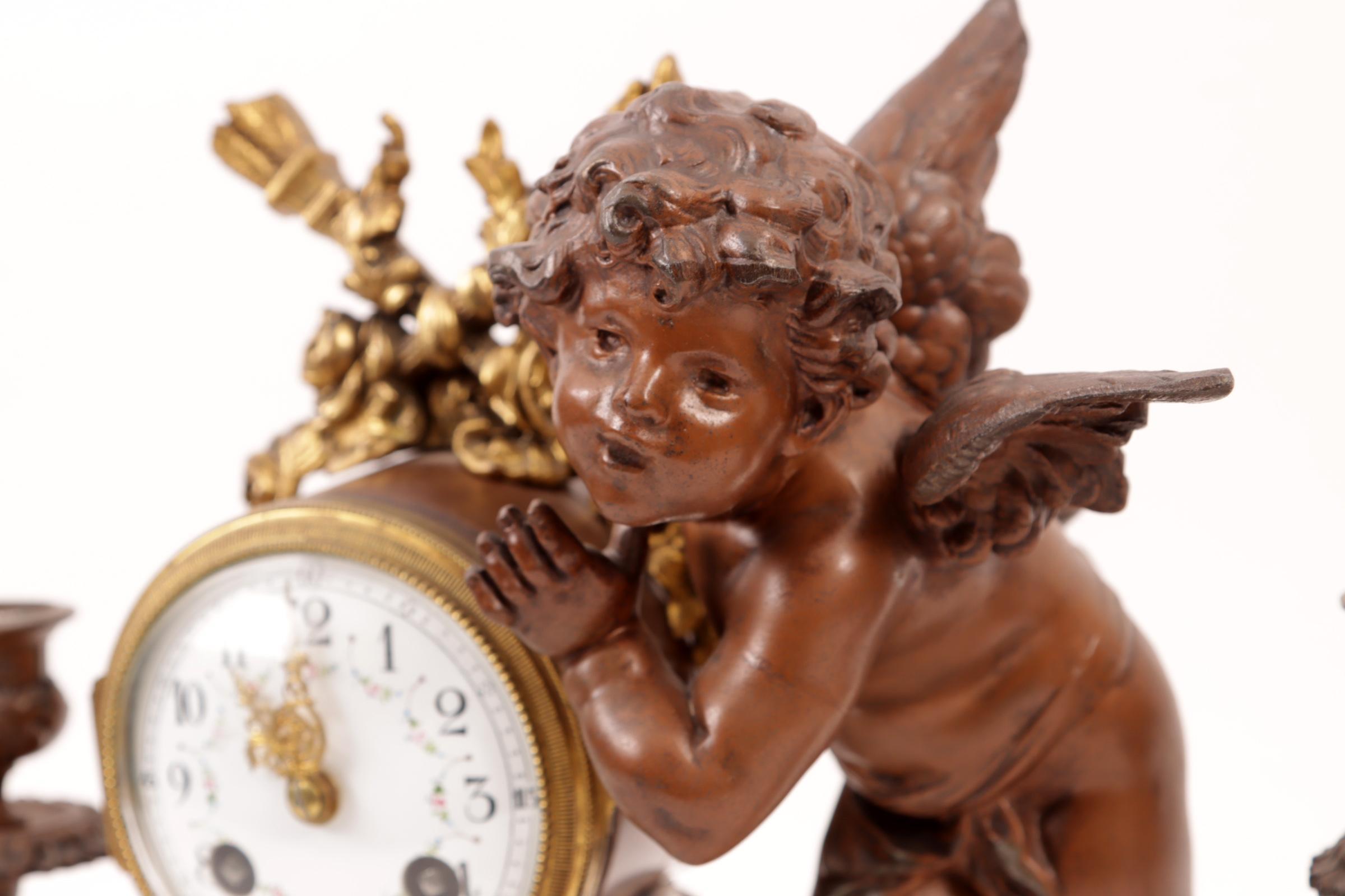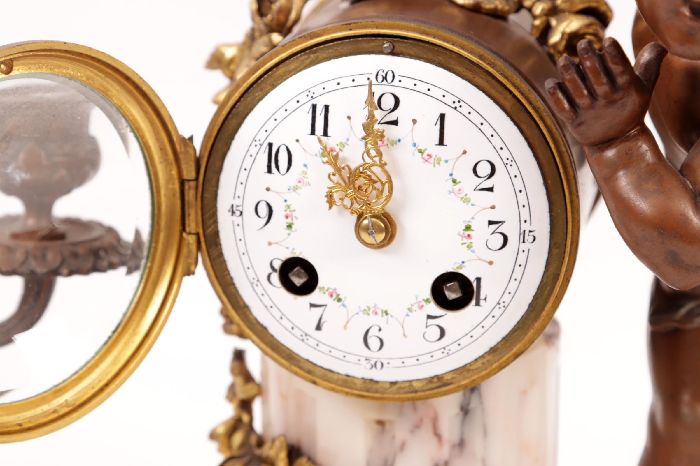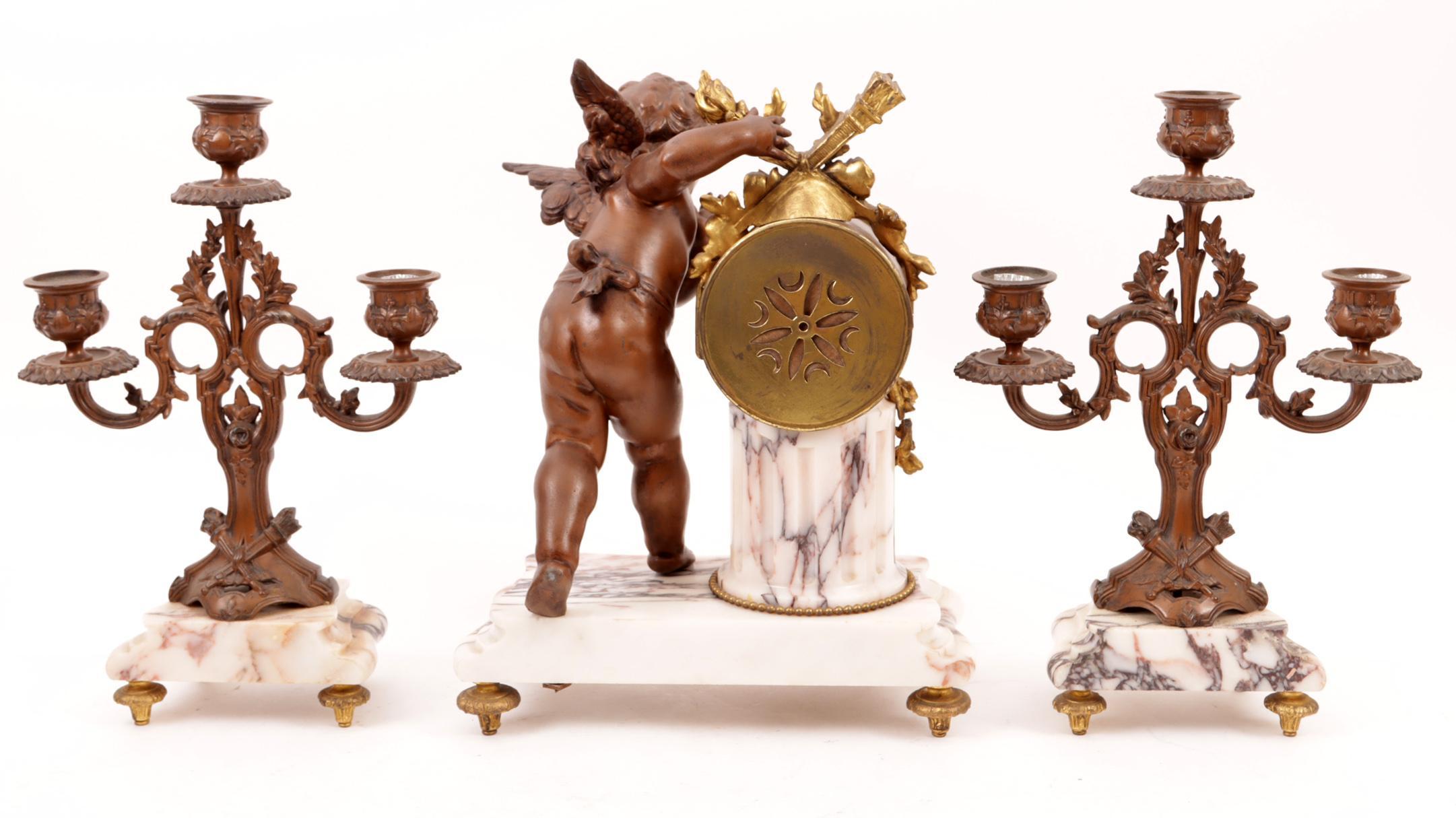 Marmeren 3-delig klokkenstel met naast het uurwerk een bronskleurige engel, h.30 cm.