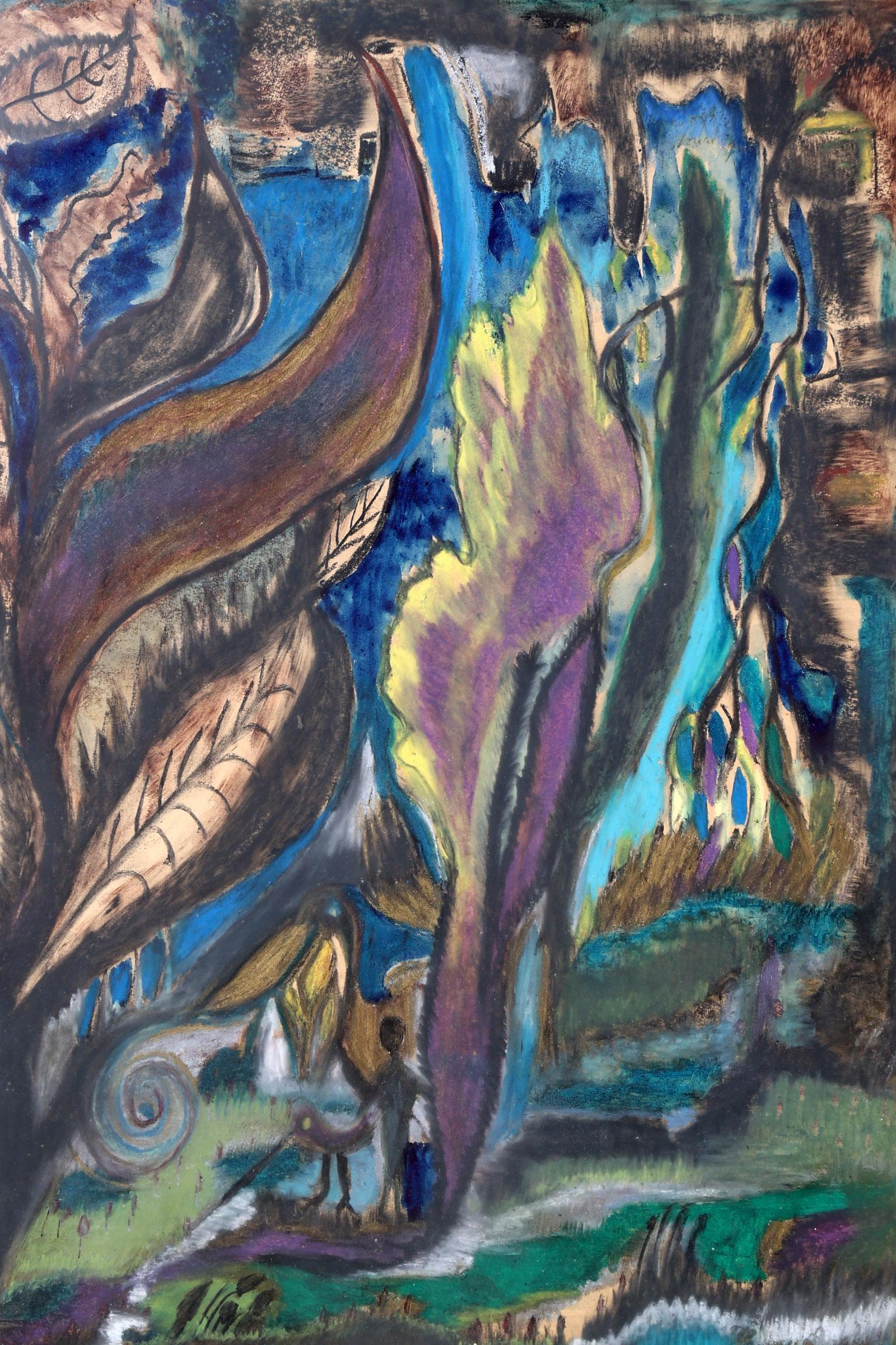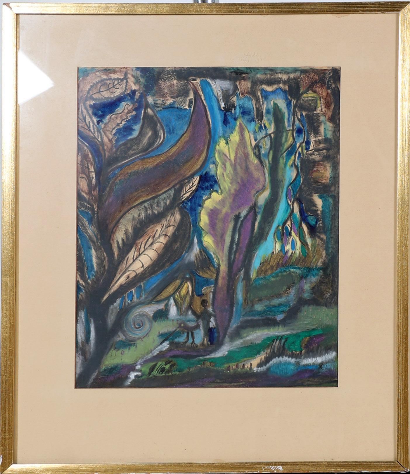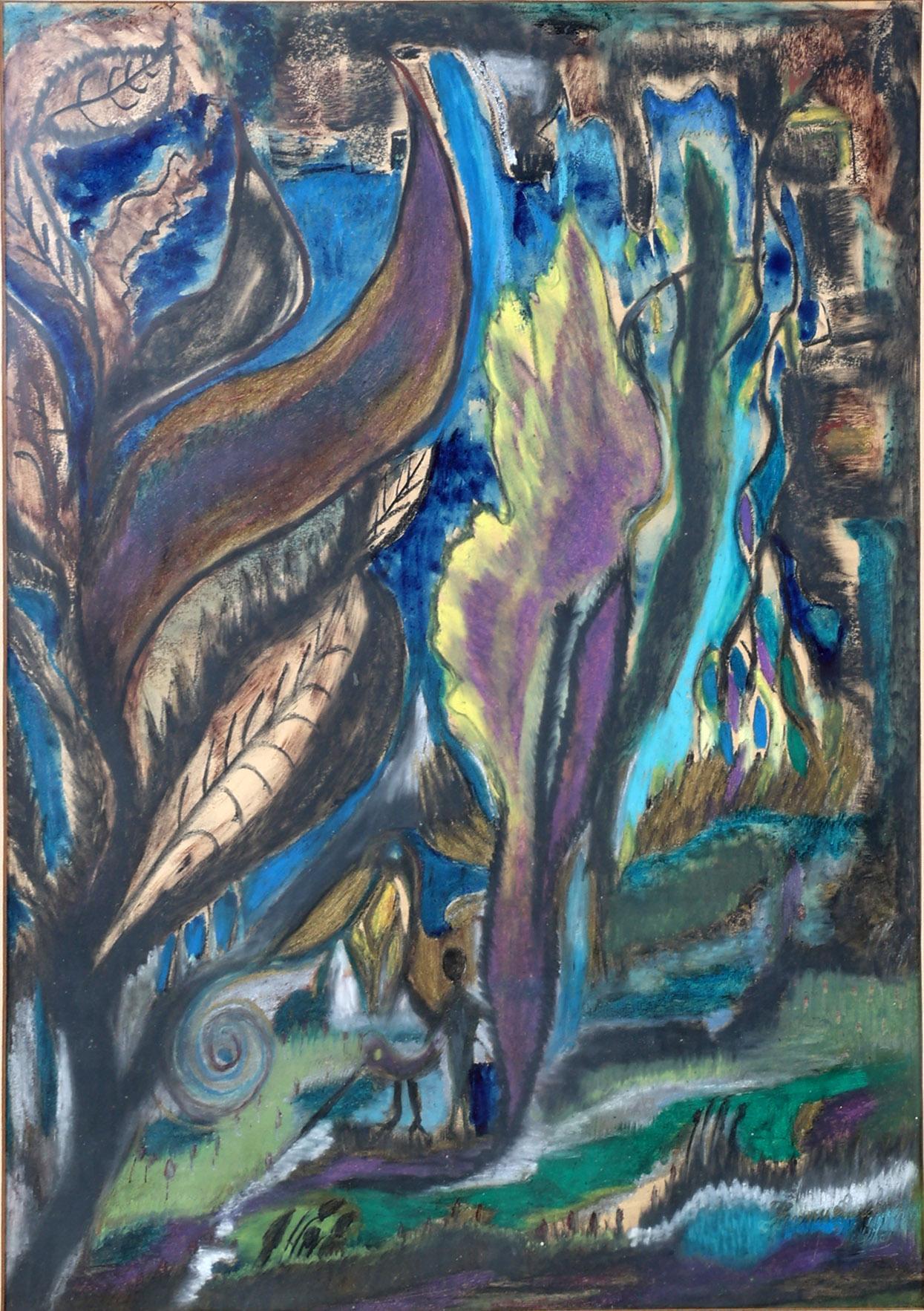 Henny Arkema-Niezen (1902-1984), Landschap met persoon en vogel, pasteltekening, 48 x 36 cm.