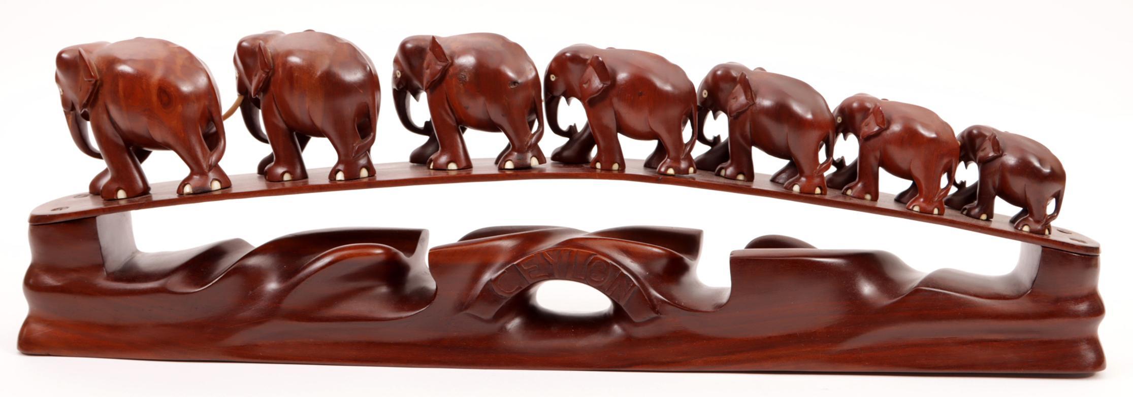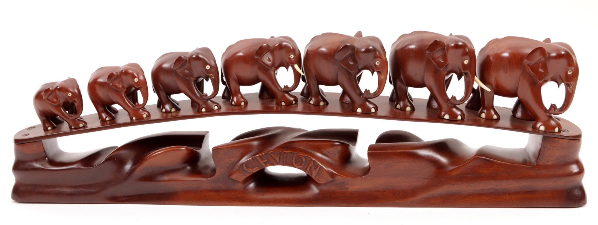 Houten beeld van een groep olifanten, Ceylon, l.62 cm.