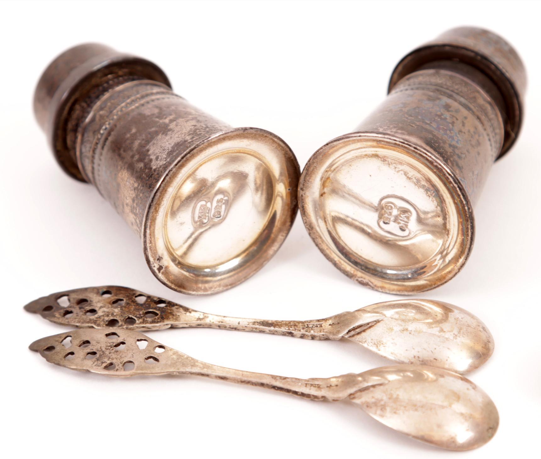 Twee 1e gehalte zilveren strooiers en vijf 2e gehalte zilveren lepeltjes, totaalgewicht 93 gram.