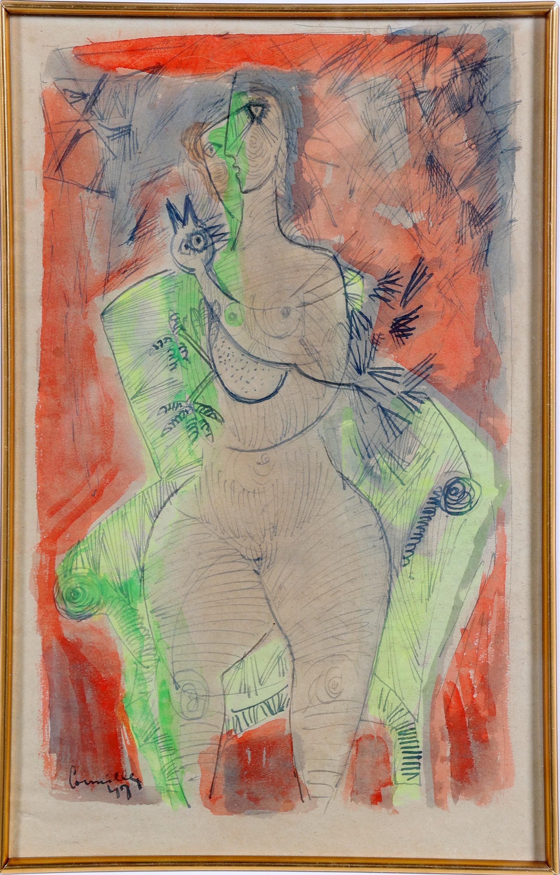 Guillaume Cornelis 'Corneille' van Beverloo (1922-2010), Vrouwelijk naakt met haan, gouache, 30 x 18 cm. of 80 x 65 cm. Provenance: collectie Elisabeth den Bieman de Haas, Amsterdam