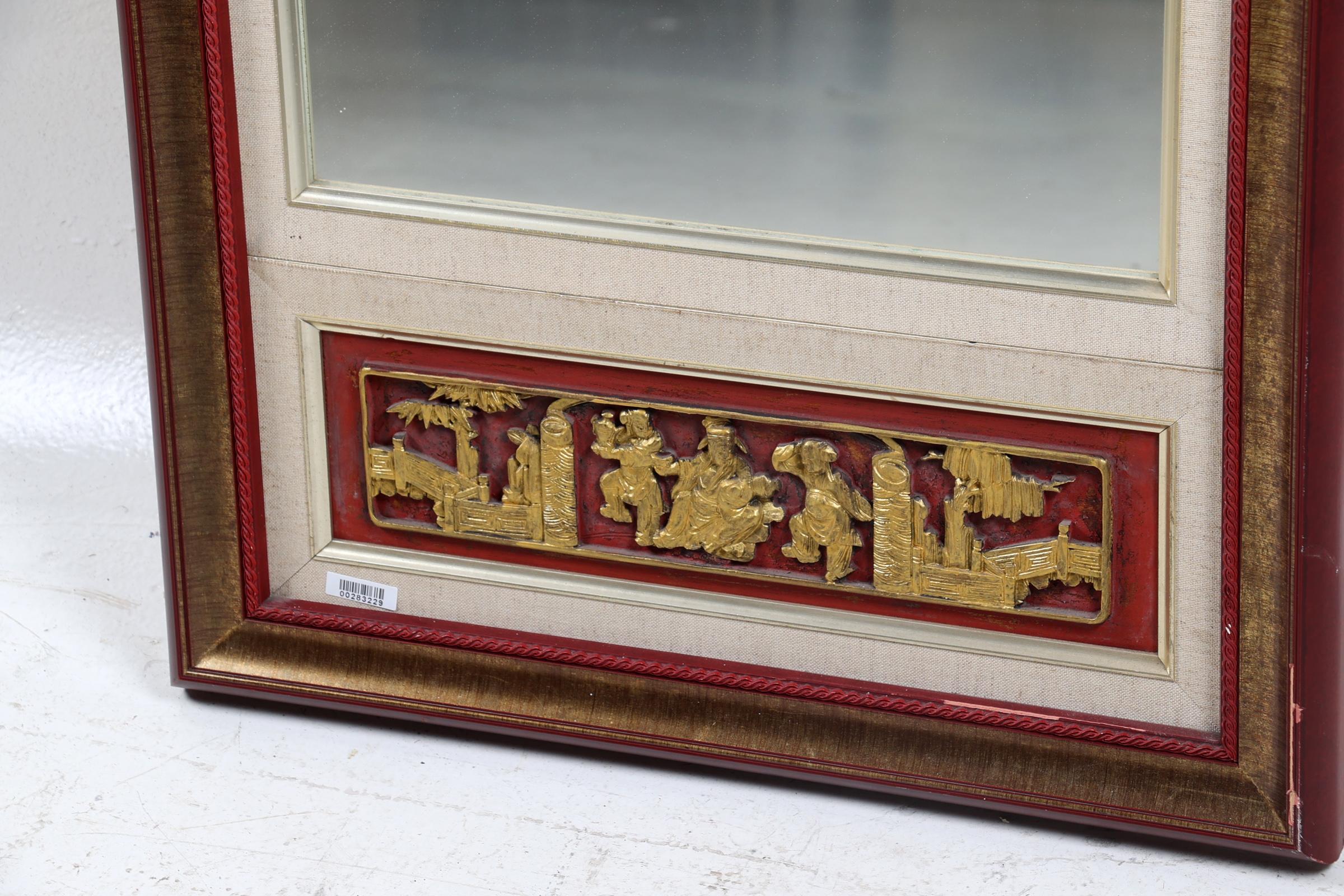 Oude spiegel met houten Chinese ornamenten, 84 x 49 cm. (kleine beschadigingen)