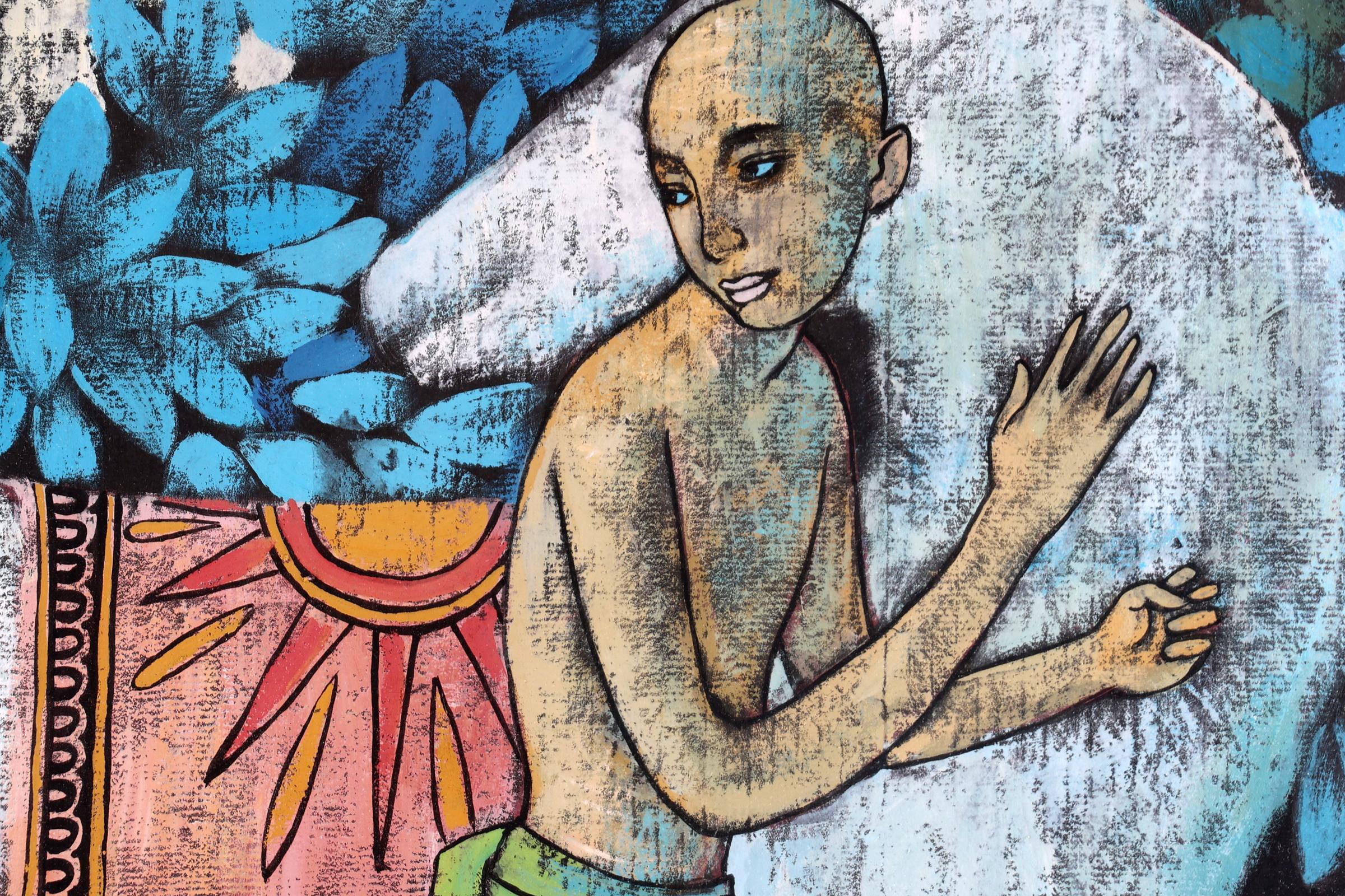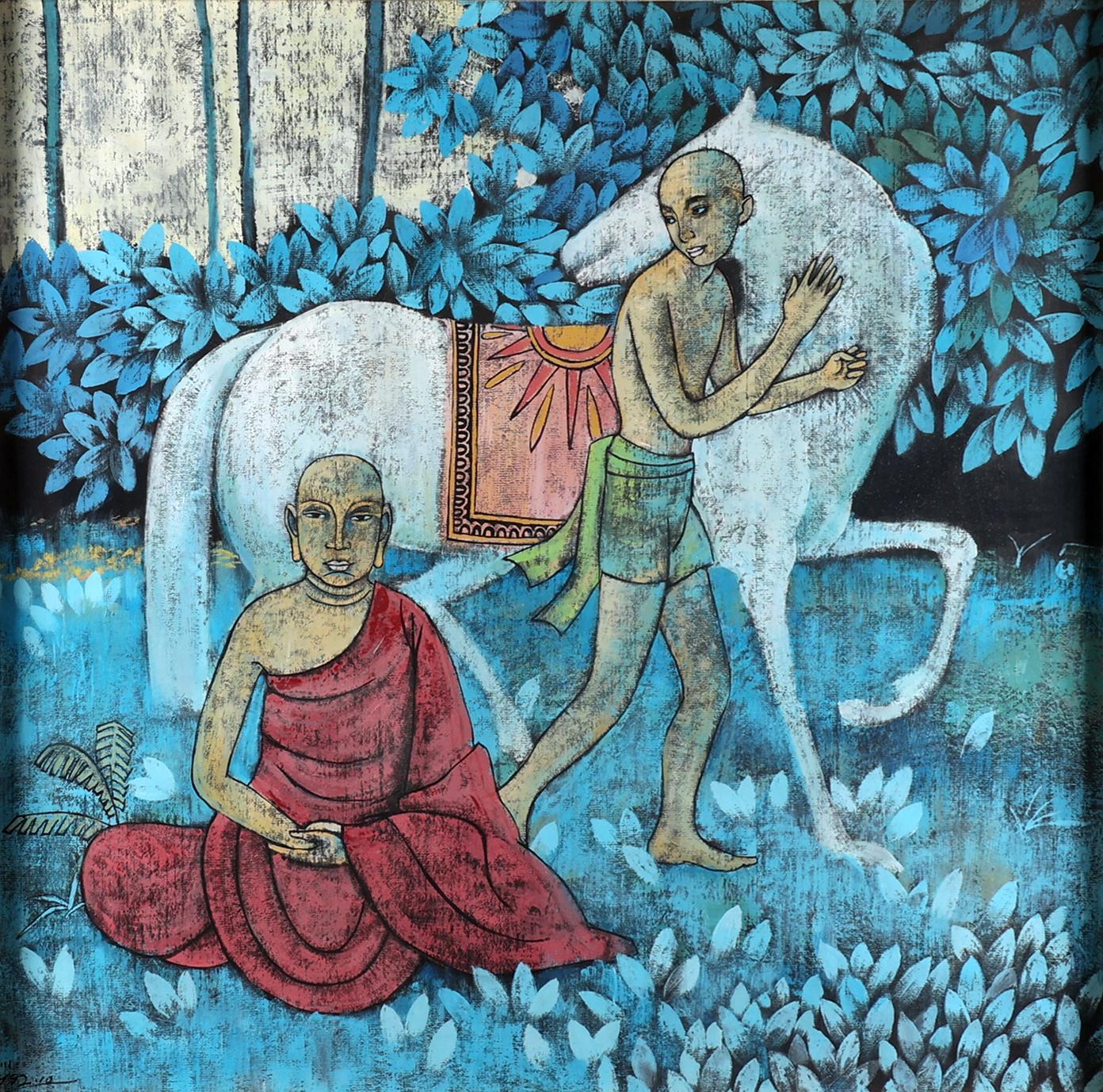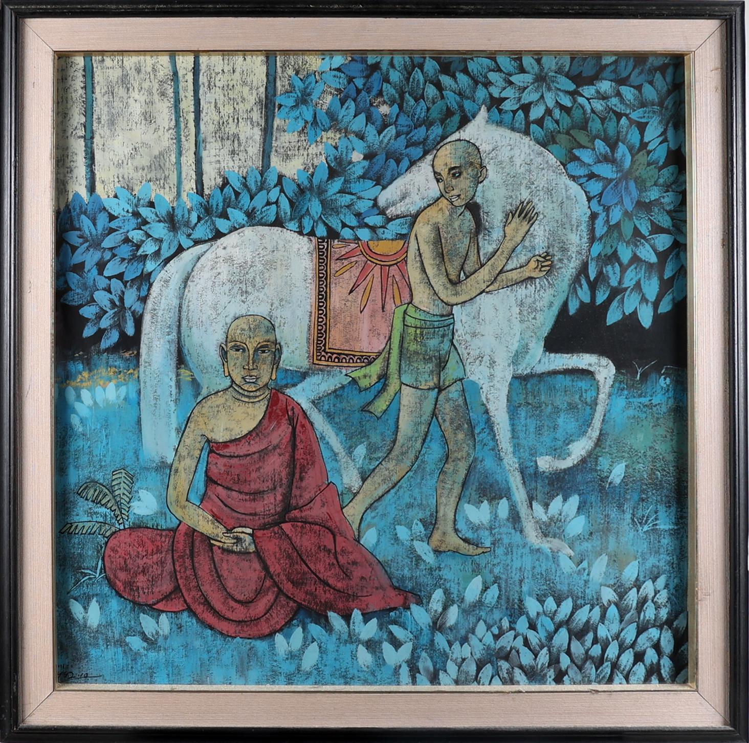 Chinese school, Twee Boeddhistische monniken in landschap met paard, acryl op papier achter glas, gedateerd 1992, 81,5 x 76,5 cm.