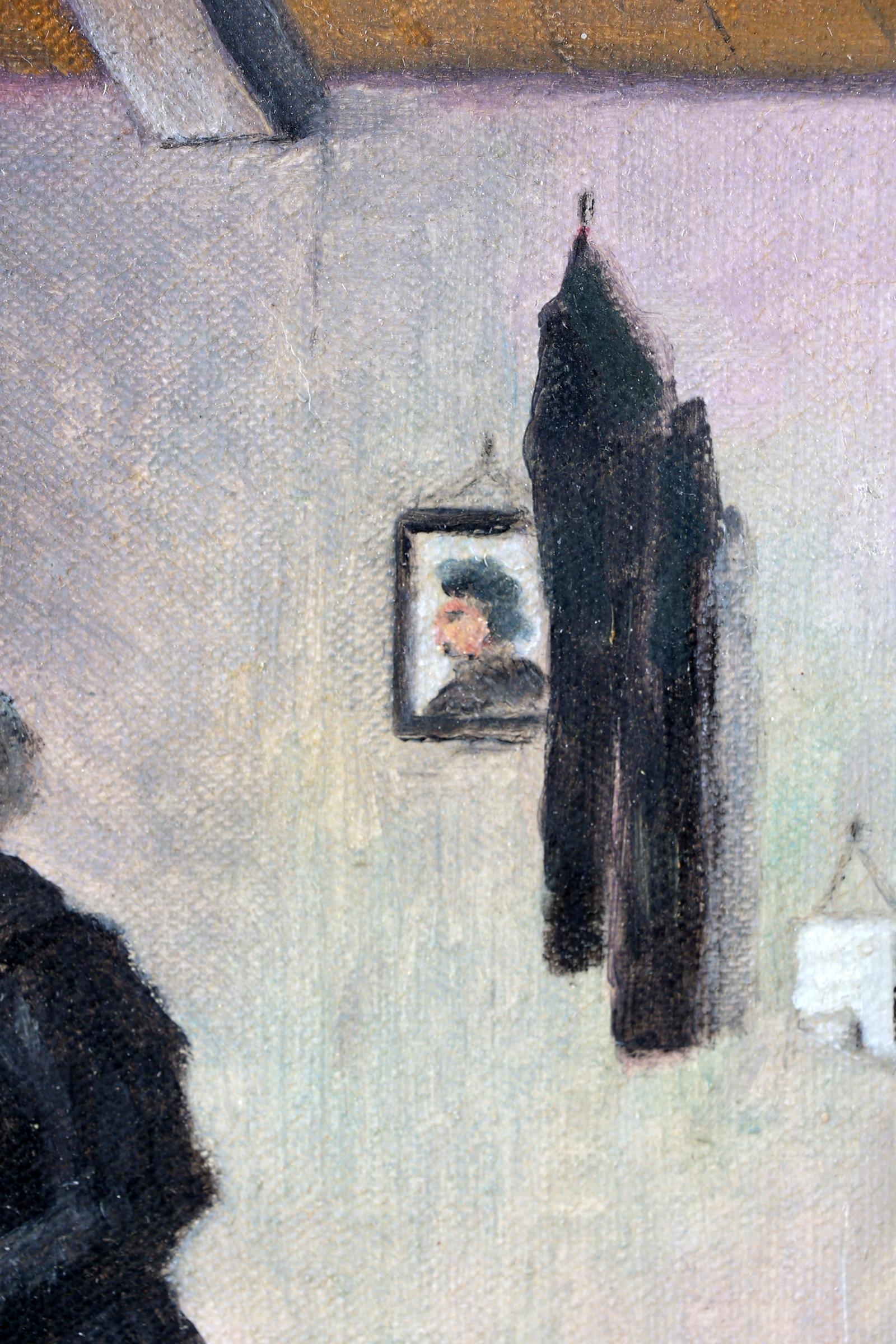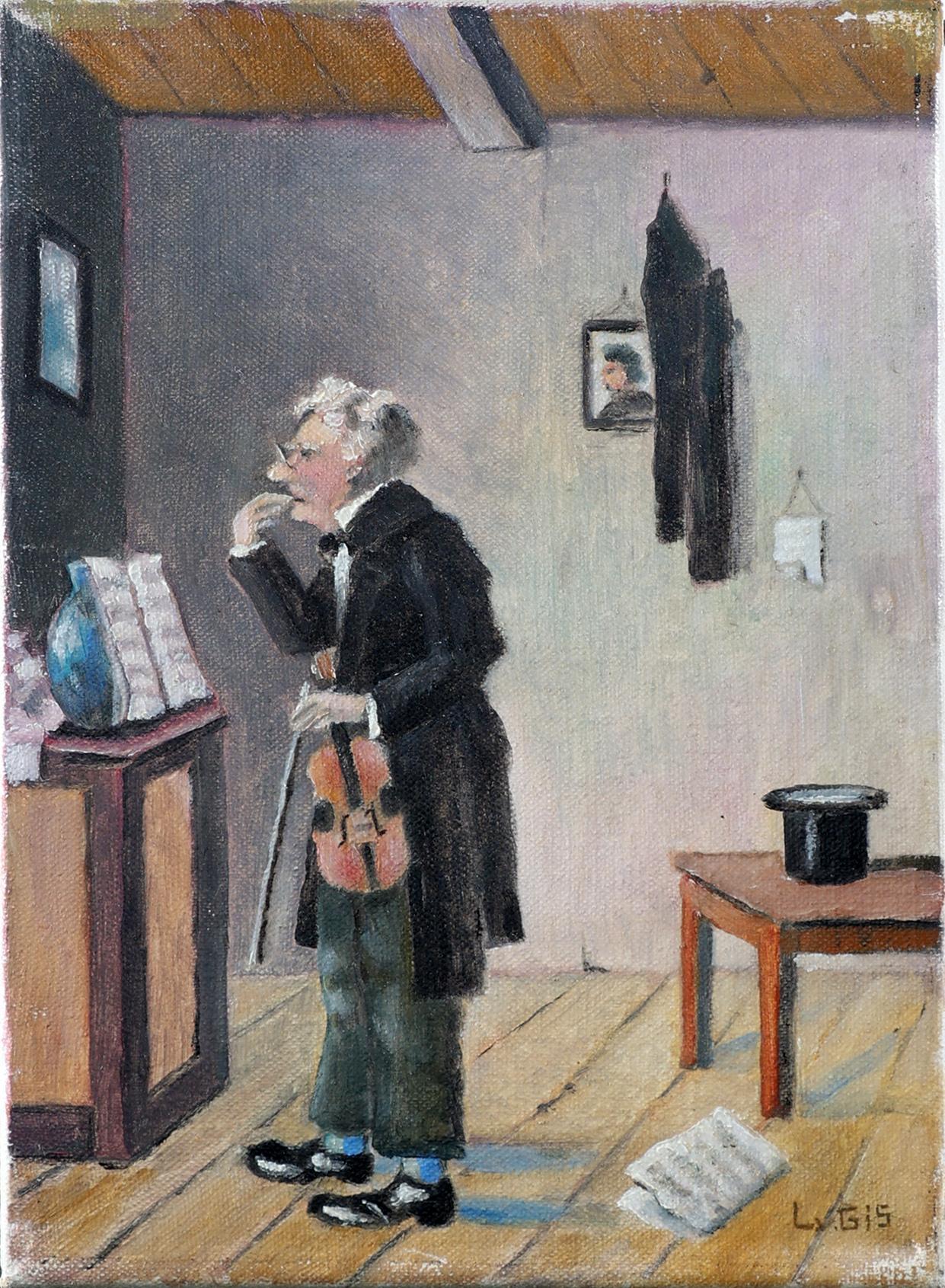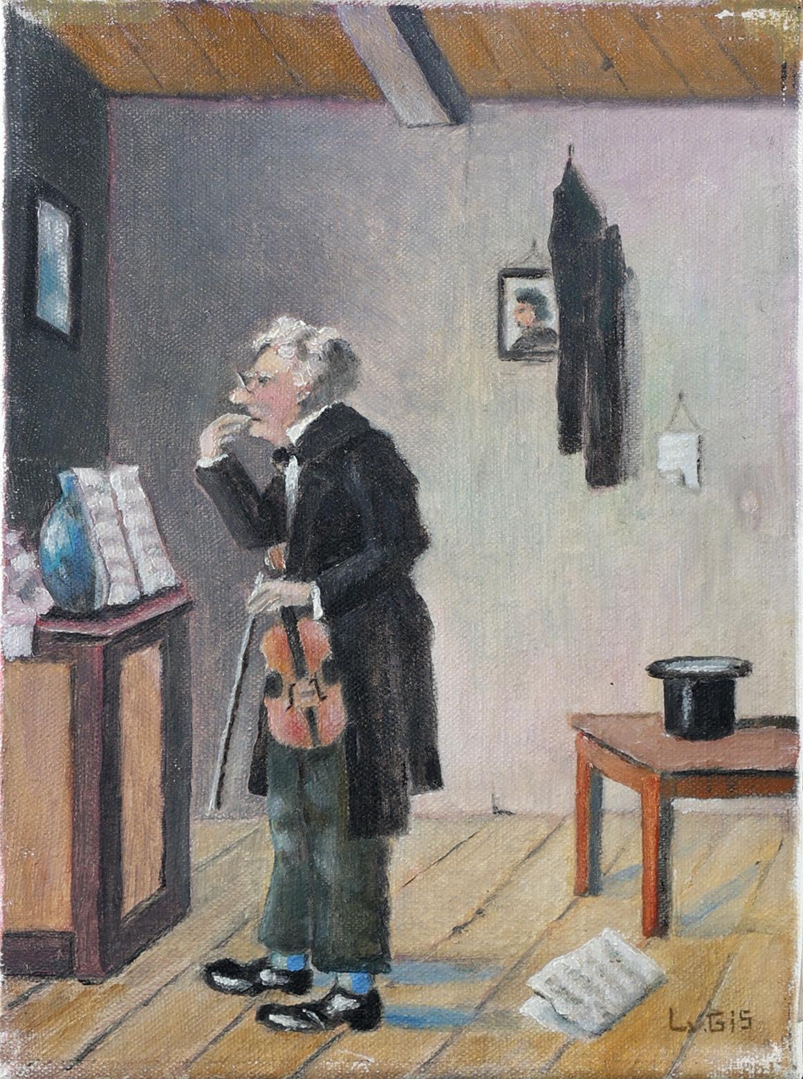 L. van Gis, Vioolspeler in interieur, olieverf op doek, 24,5 x 18 cm.