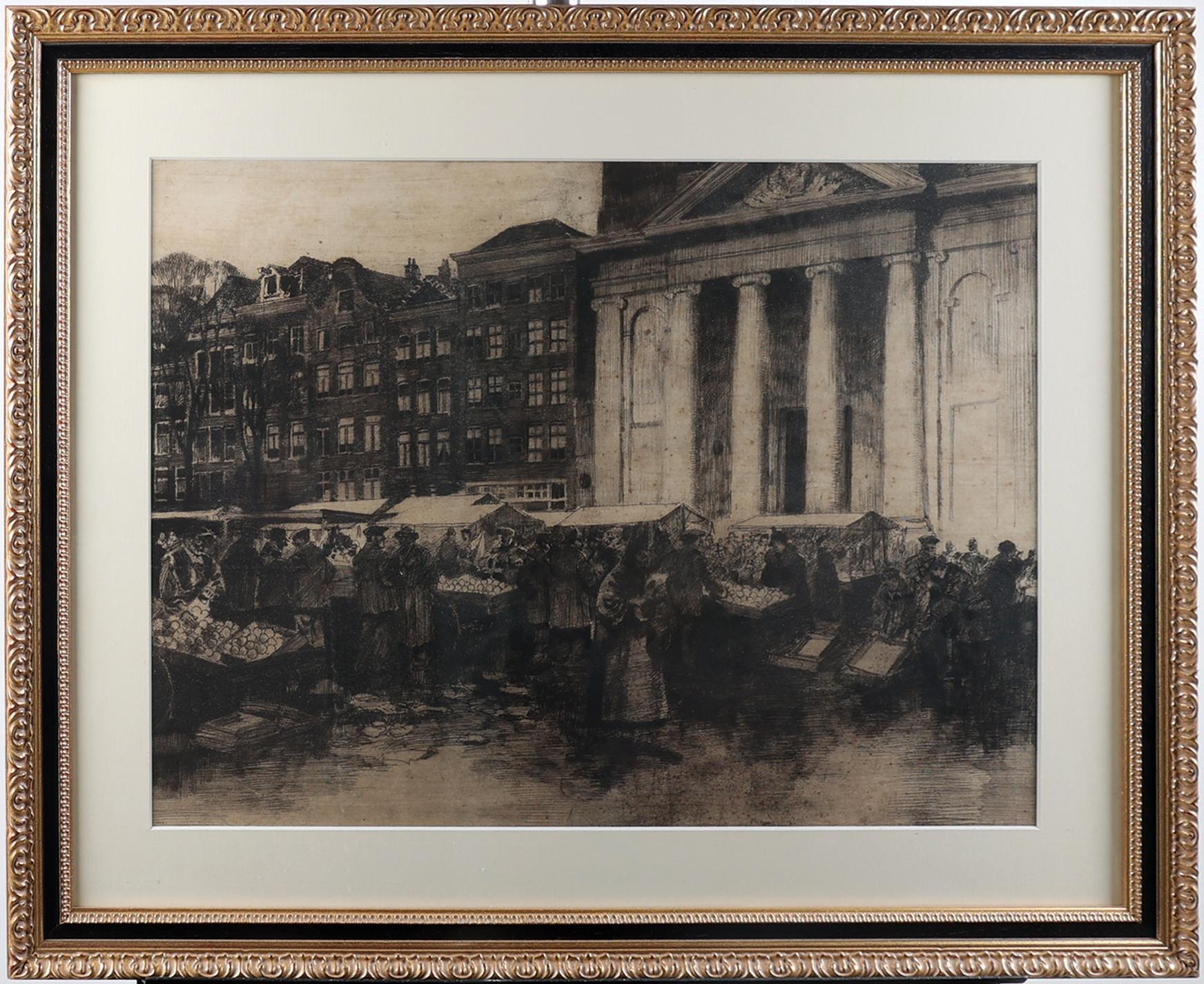 Jos Rovers (1893-1976), Gezicht op de markt op het Waterlooplein te Amsterdam, ets 44,5 x 60 cm.