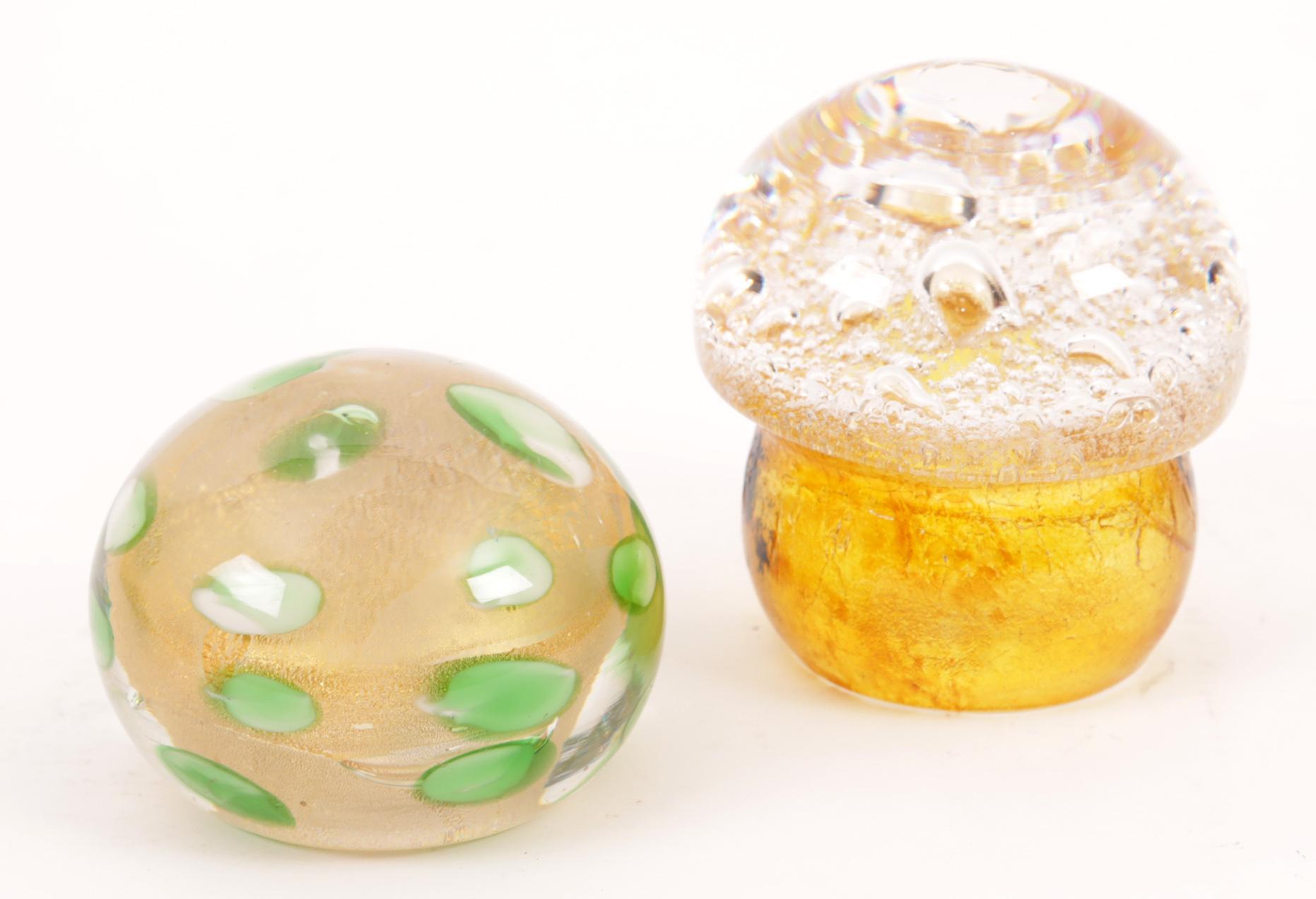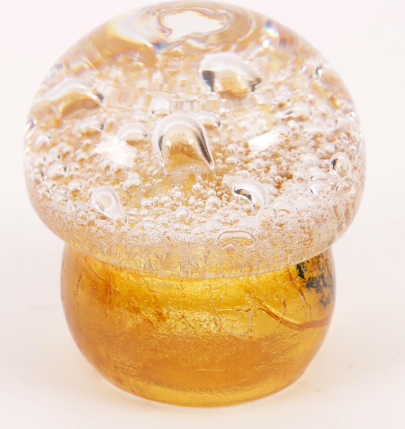 Glazen presse-papier i.v.v. een paddestoel, Göran Wärff voor Kosta Boda en glazen presse-papier, Flavio Poli
