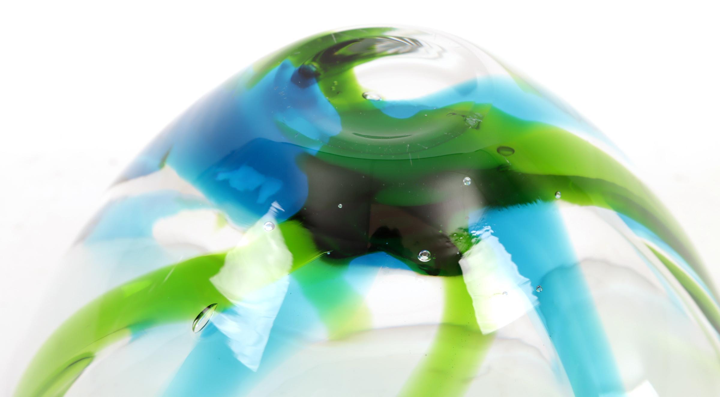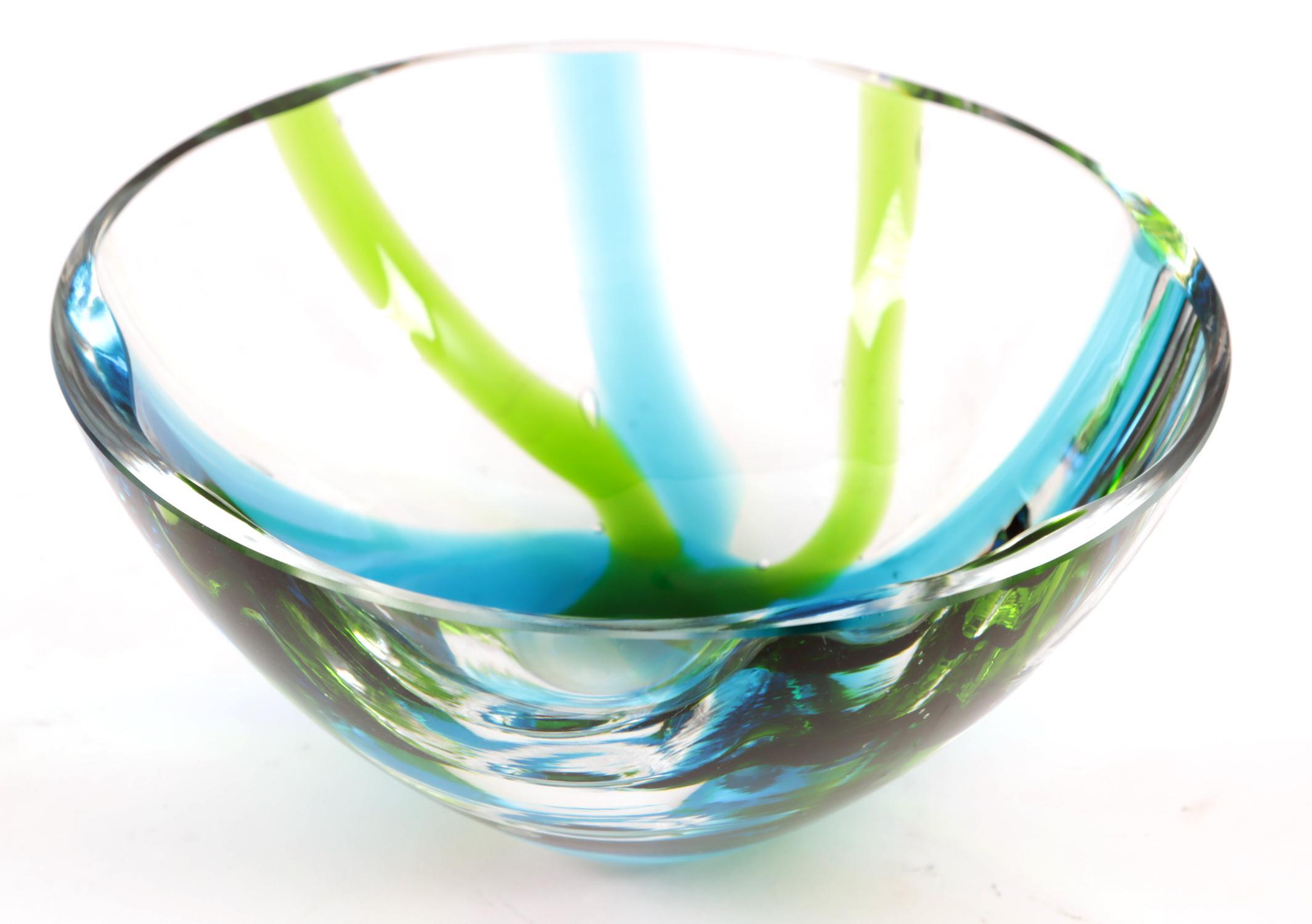 Groen/blauw/wit gestreept schaaltje, Kosta Boda, ontwerp Anna Ehrner, h.7 x diam.15 cm.