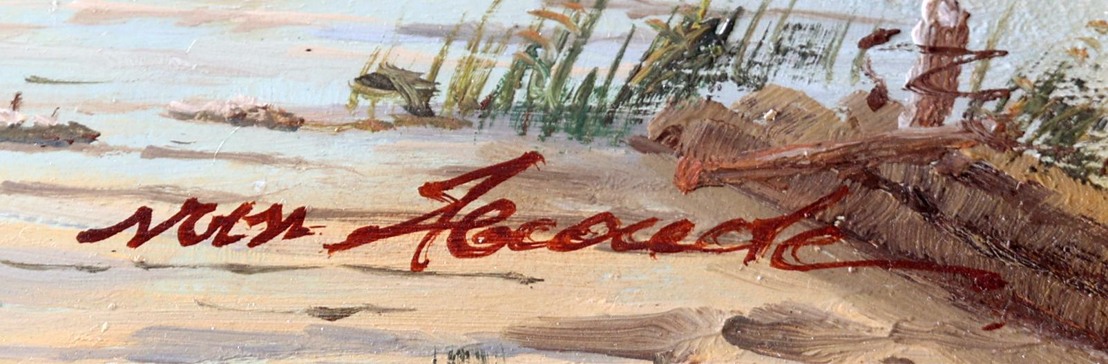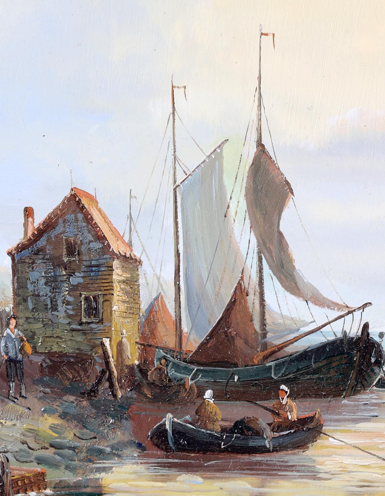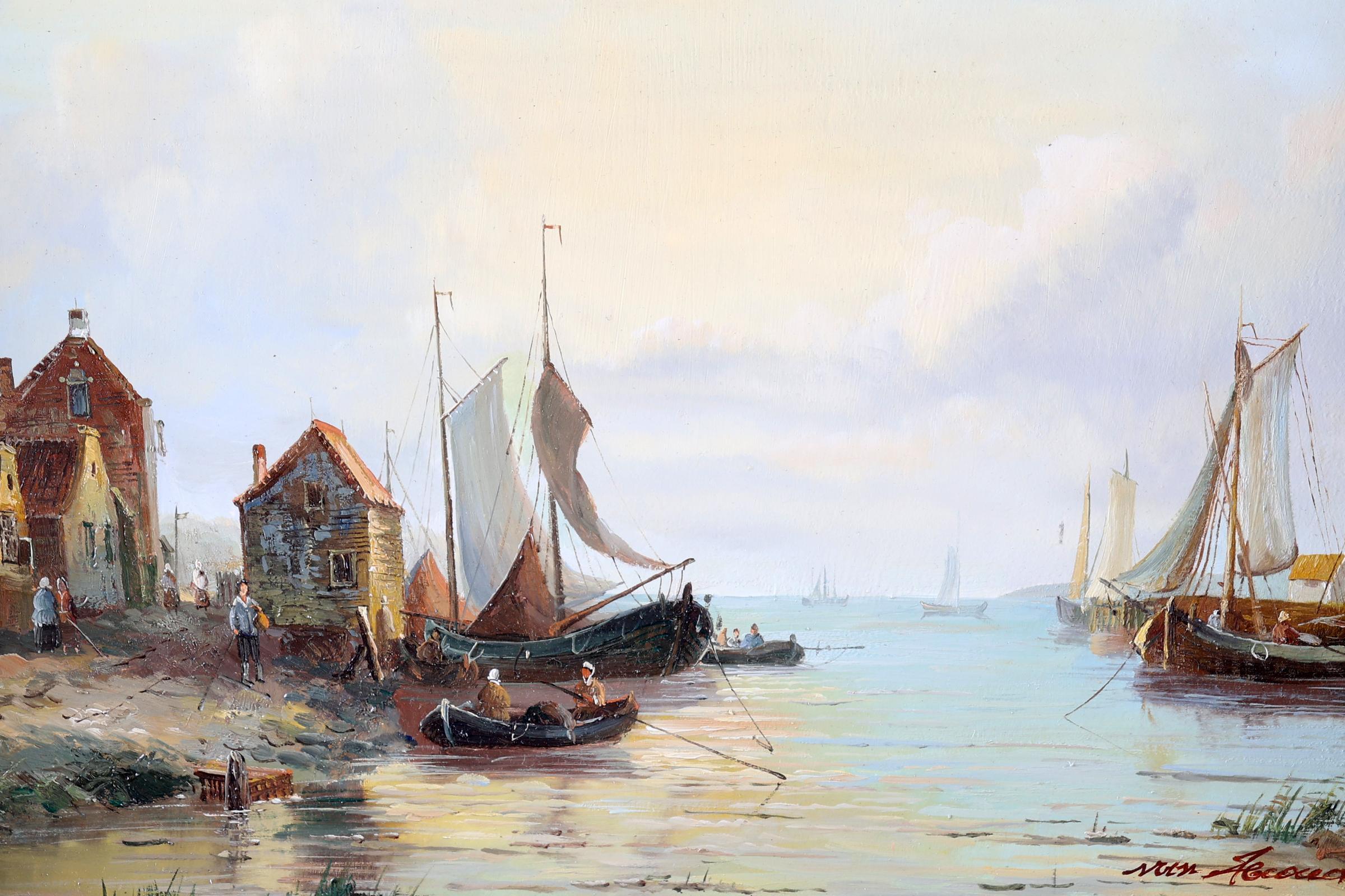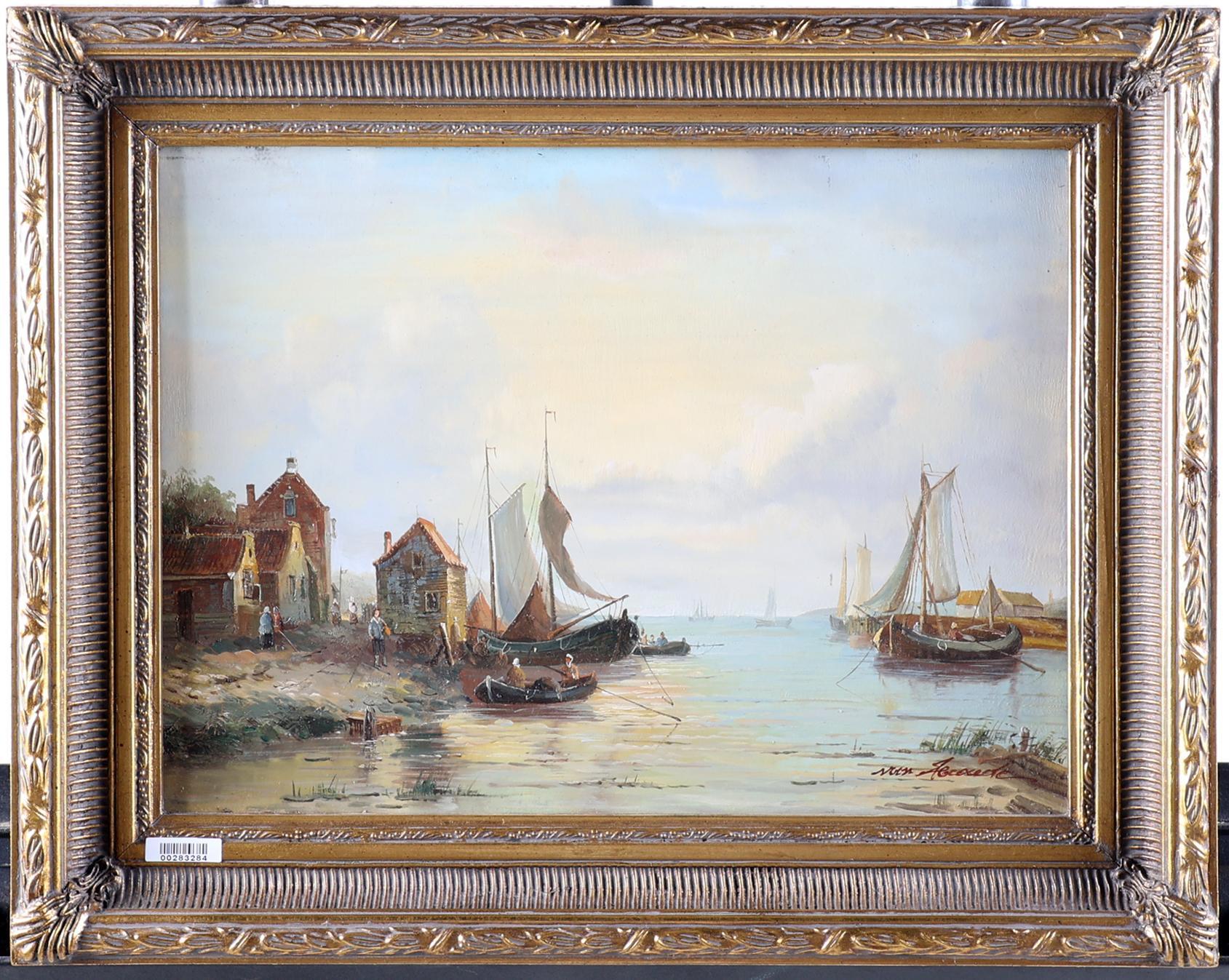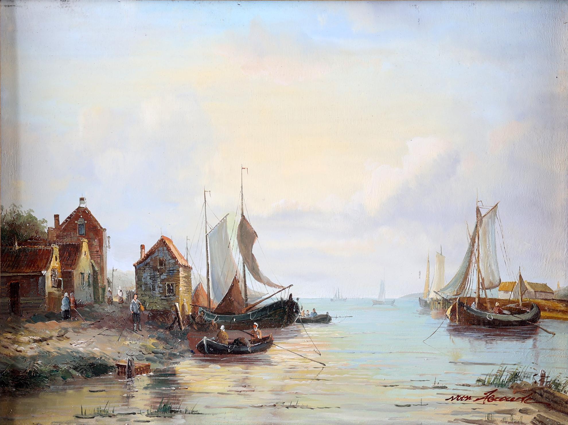Ond. gesign., Dorpje aan het water met zeilboten, olieverf op paneel, 29 x 38,5 cm.