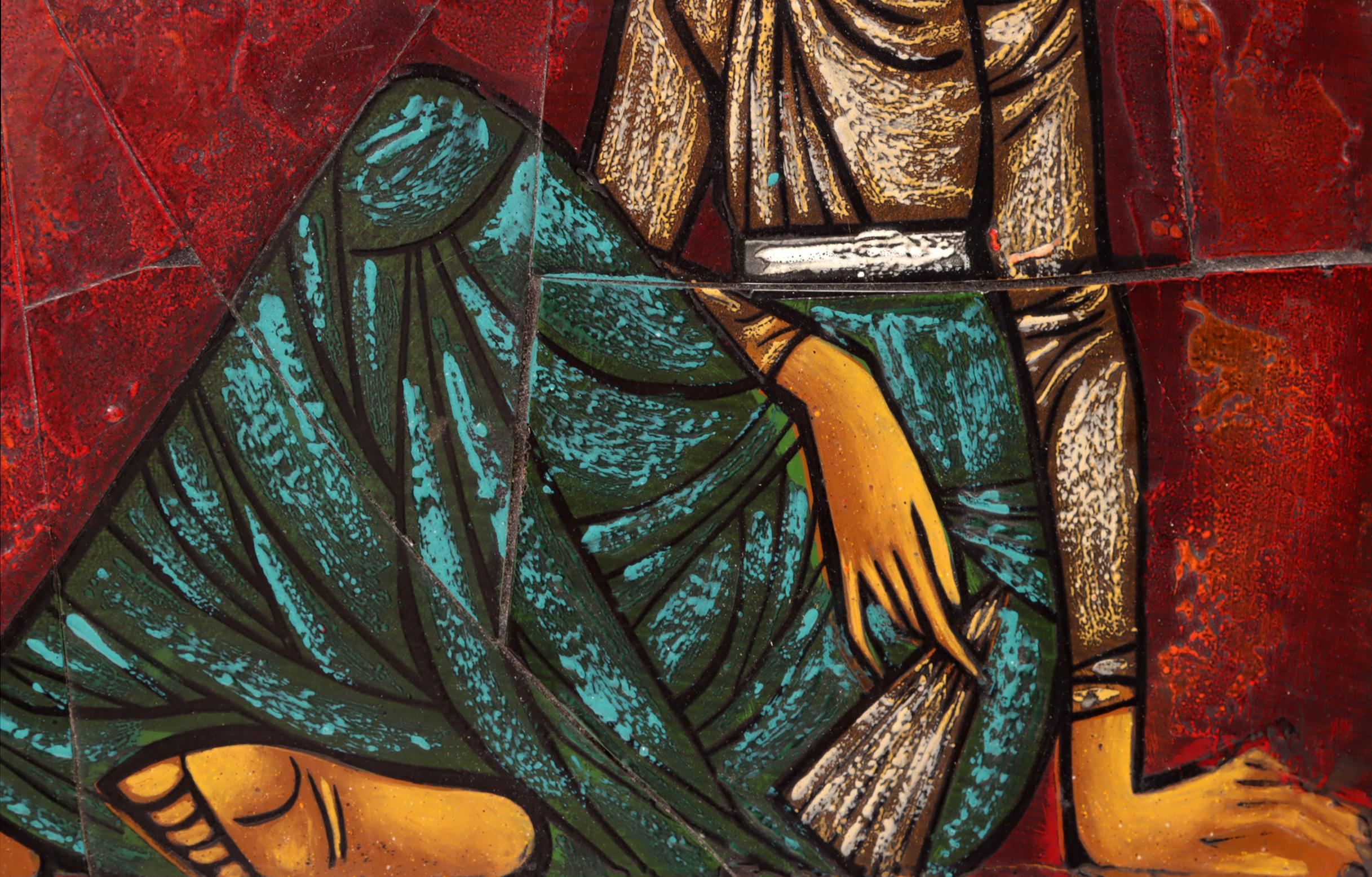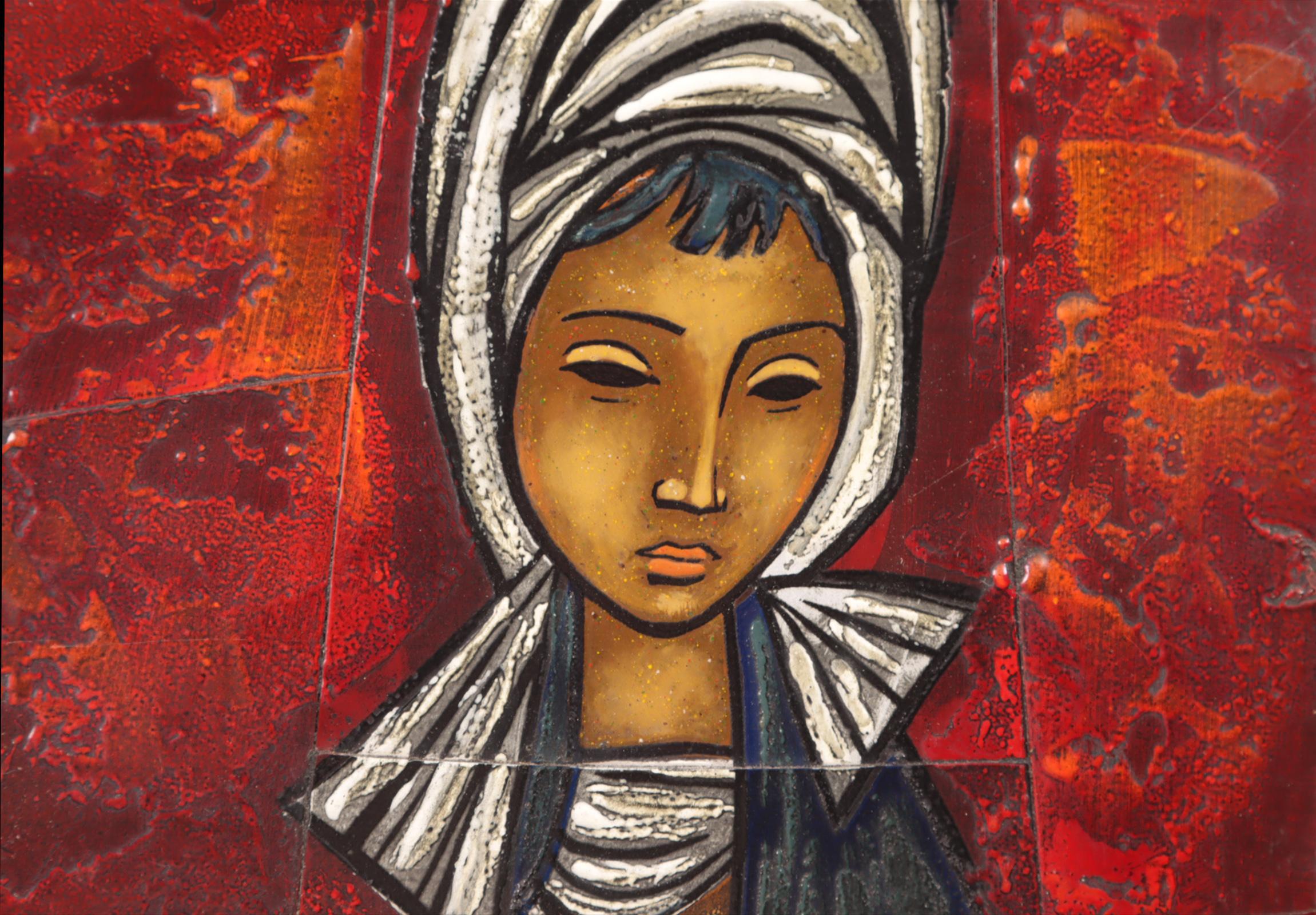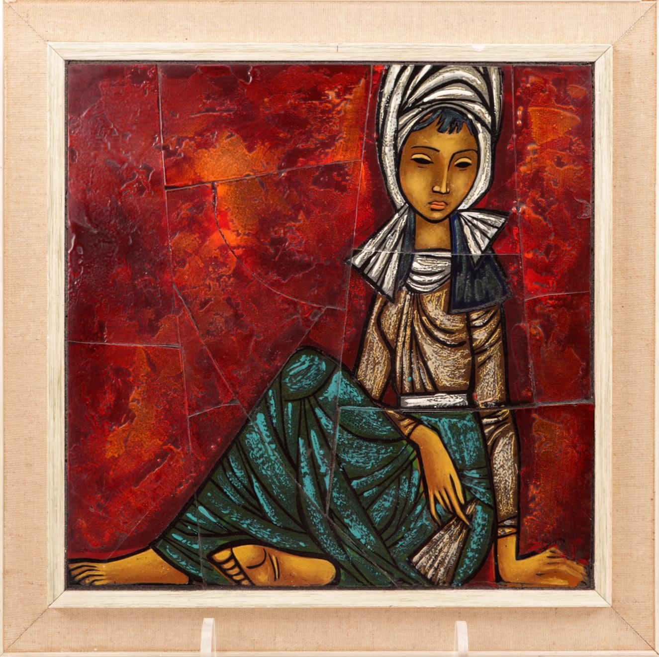 Onb.meester, Wanddecoratie van zittende vrouw, 70-erjaren, gemengde techniek, 34 x 34 cm.