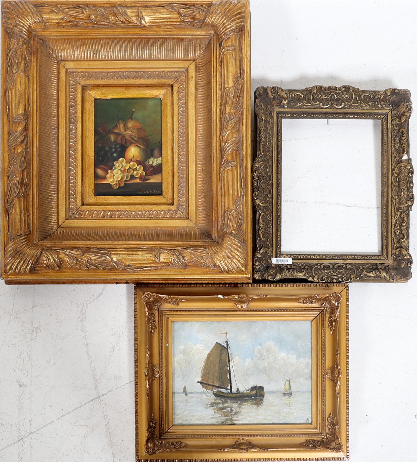 Twee diverse paneeltjes van een stilleven en zeegezicht en een schilderijenlijst